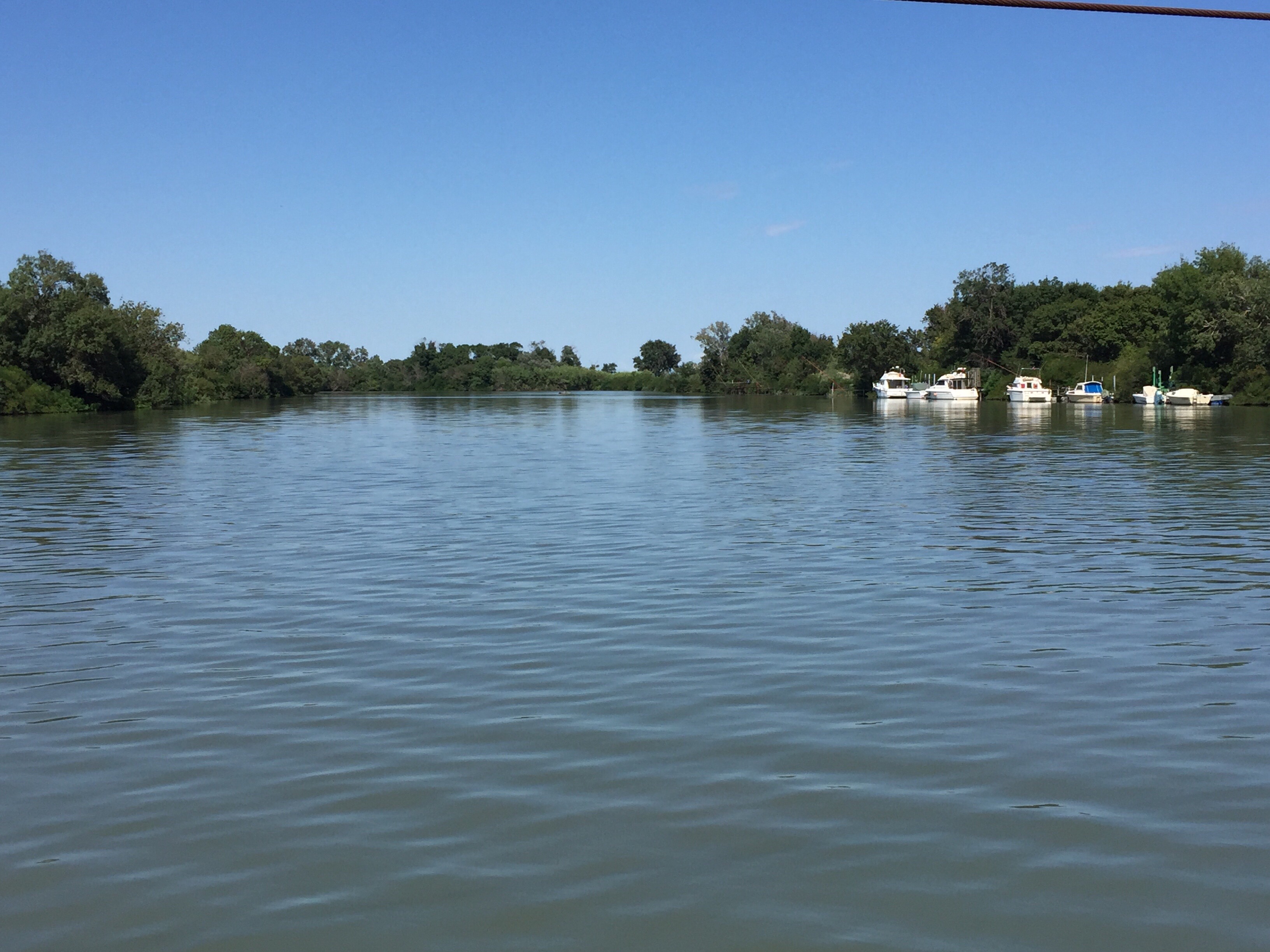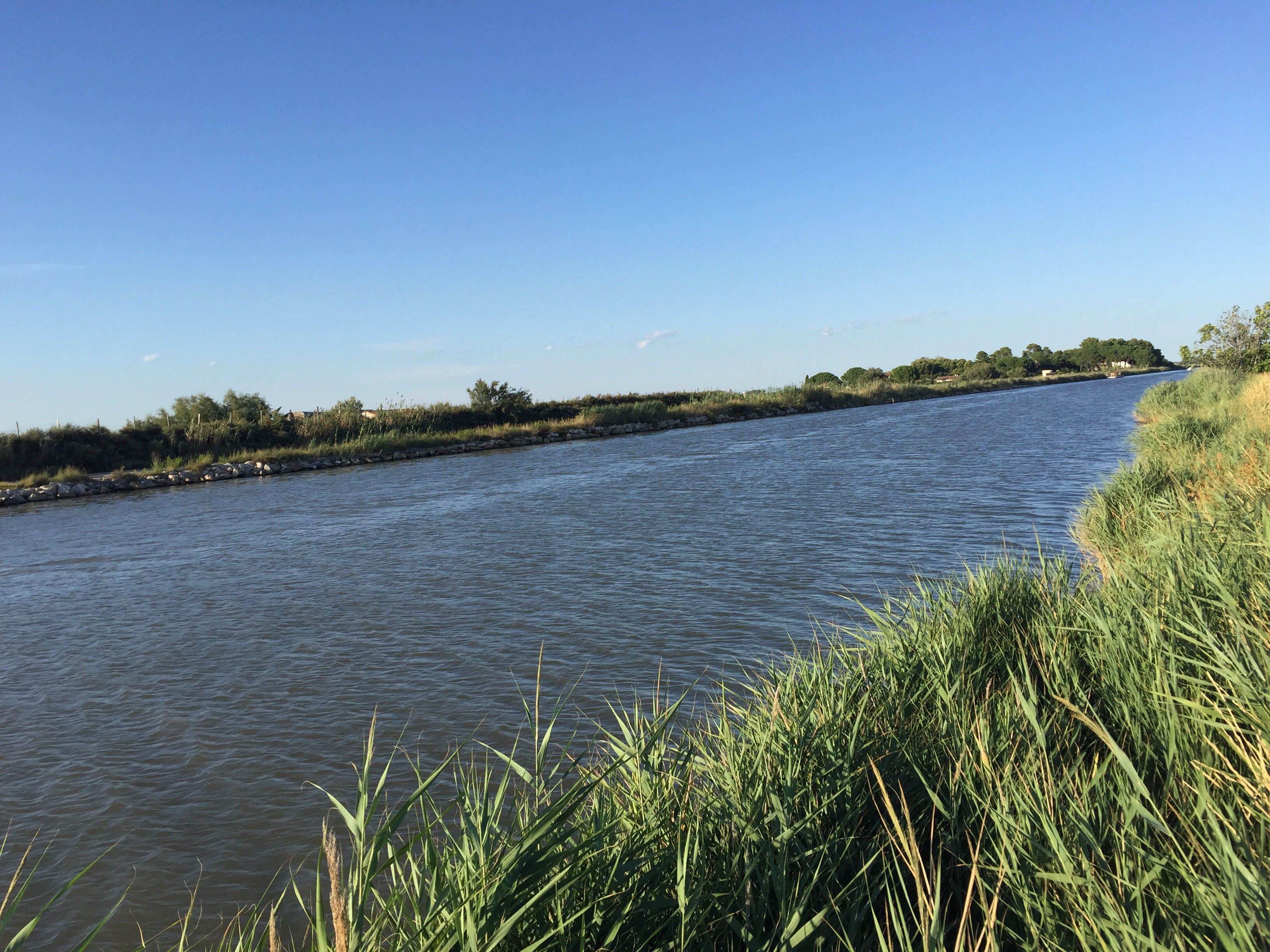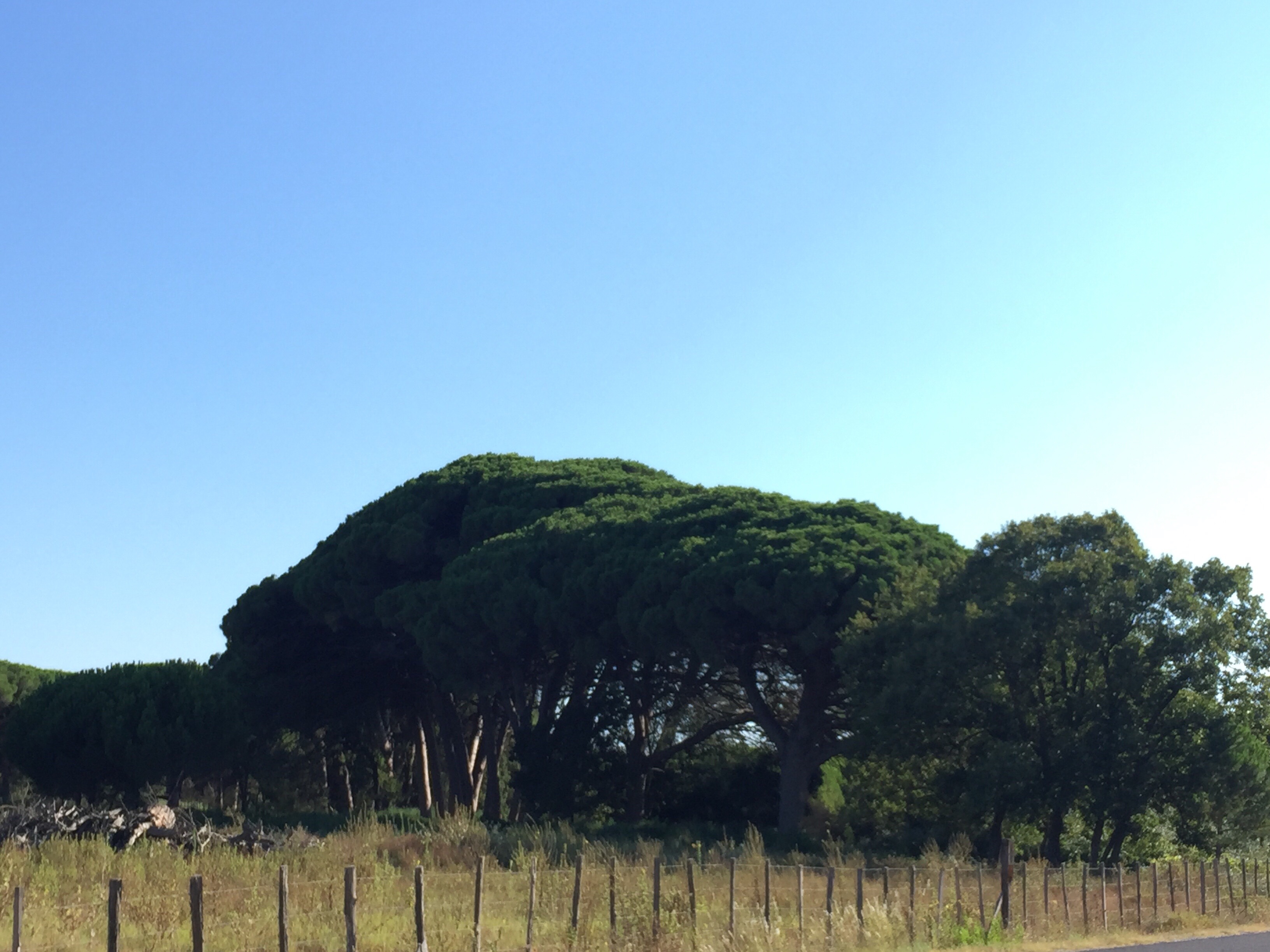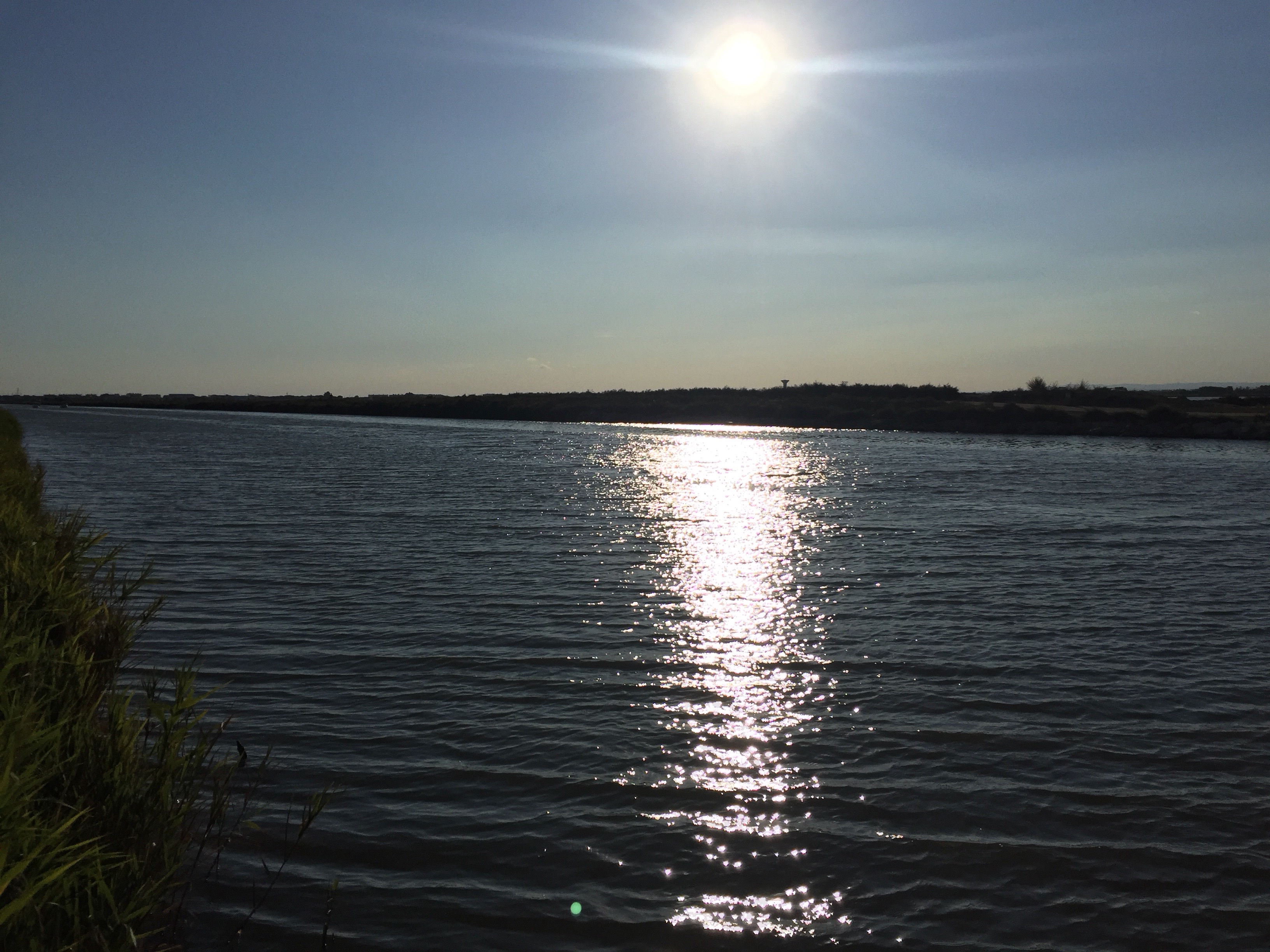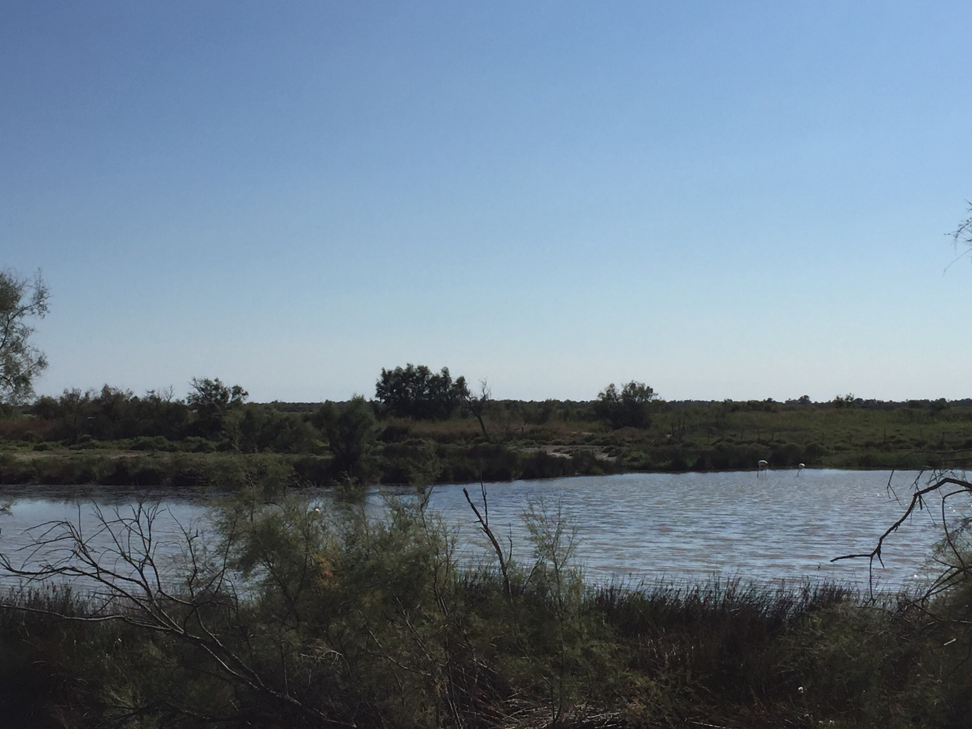 Auf dem Rückweg nahmen wir (auch weil es schon recht spät war) die schnelle Route. Die Strecke ist anders aber kein bisschen weniger schön – weite Grasebenen, durchzogen von kleinen Flussläufen und Kanälen; hin und wieder Oliven- und Pinienbäume. Auf diesem Weg kommt man neben endlosen Wein- und Reisfeldern (falls ihr so ungläubig und unwissend seid wie ich vorher… ja, tatsächlich, es gibt einige Gegenden in Europa, in denen Reis angebaut wird) auch an mehreren Salinen vorbei, in denen in ausgedehnten Salzgärten das berühmte Fleur de Sel „geerntet“ wird.