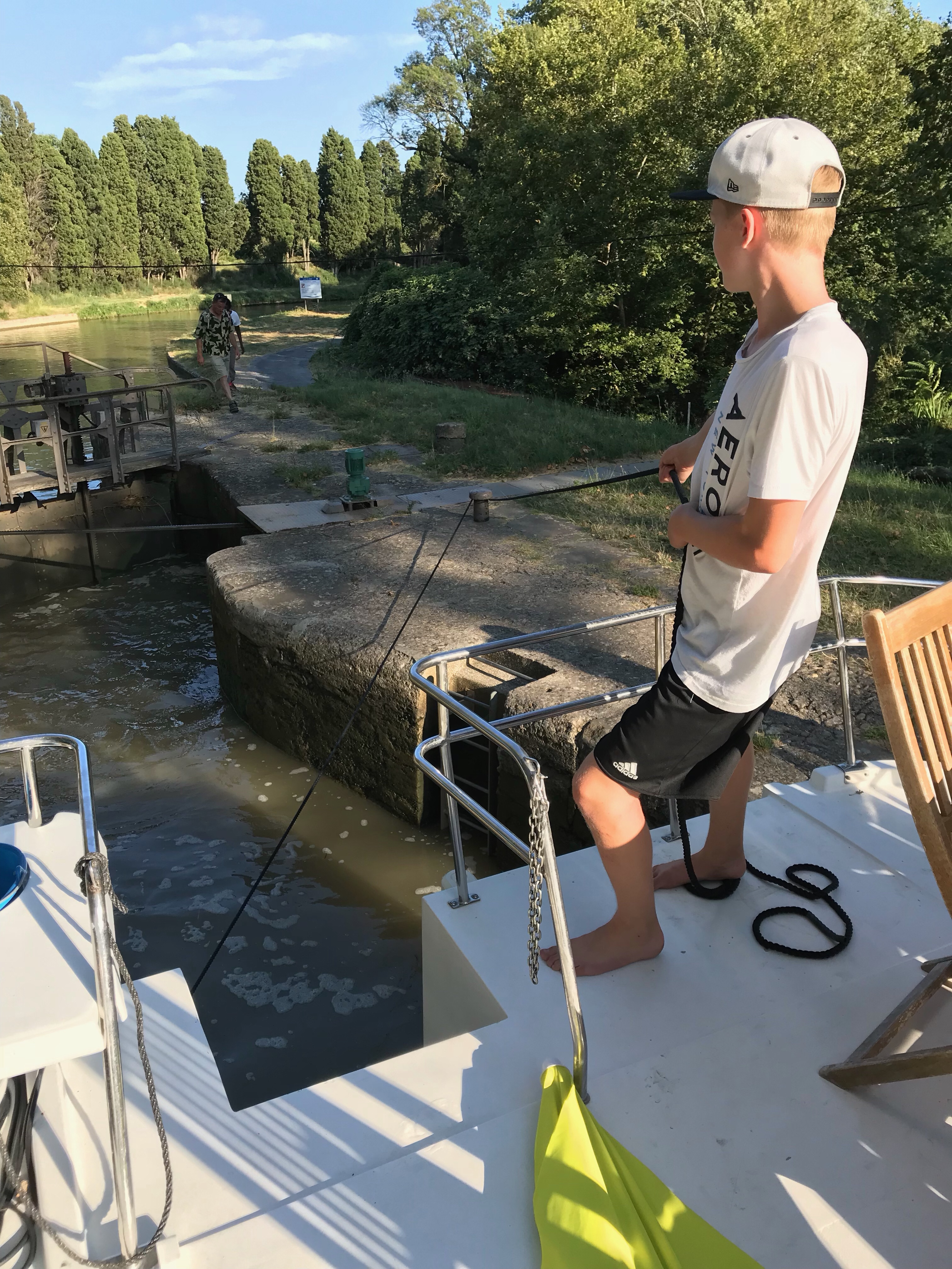 …bei denen wir fast eines der Besatzungsmitglieder verloren hätten (ist doch überraschend schwer an einem Tau festzuhalten so ein Boot… also für einen 12jährigen), liefen das dritte und vierte Schleusen bereits hochgradig professionell ab. Nach den sieben Tagen können wir uns hier mit Schulungen im Zweifel sicherlich selbständig machen. So als zweites Standbein. 😀