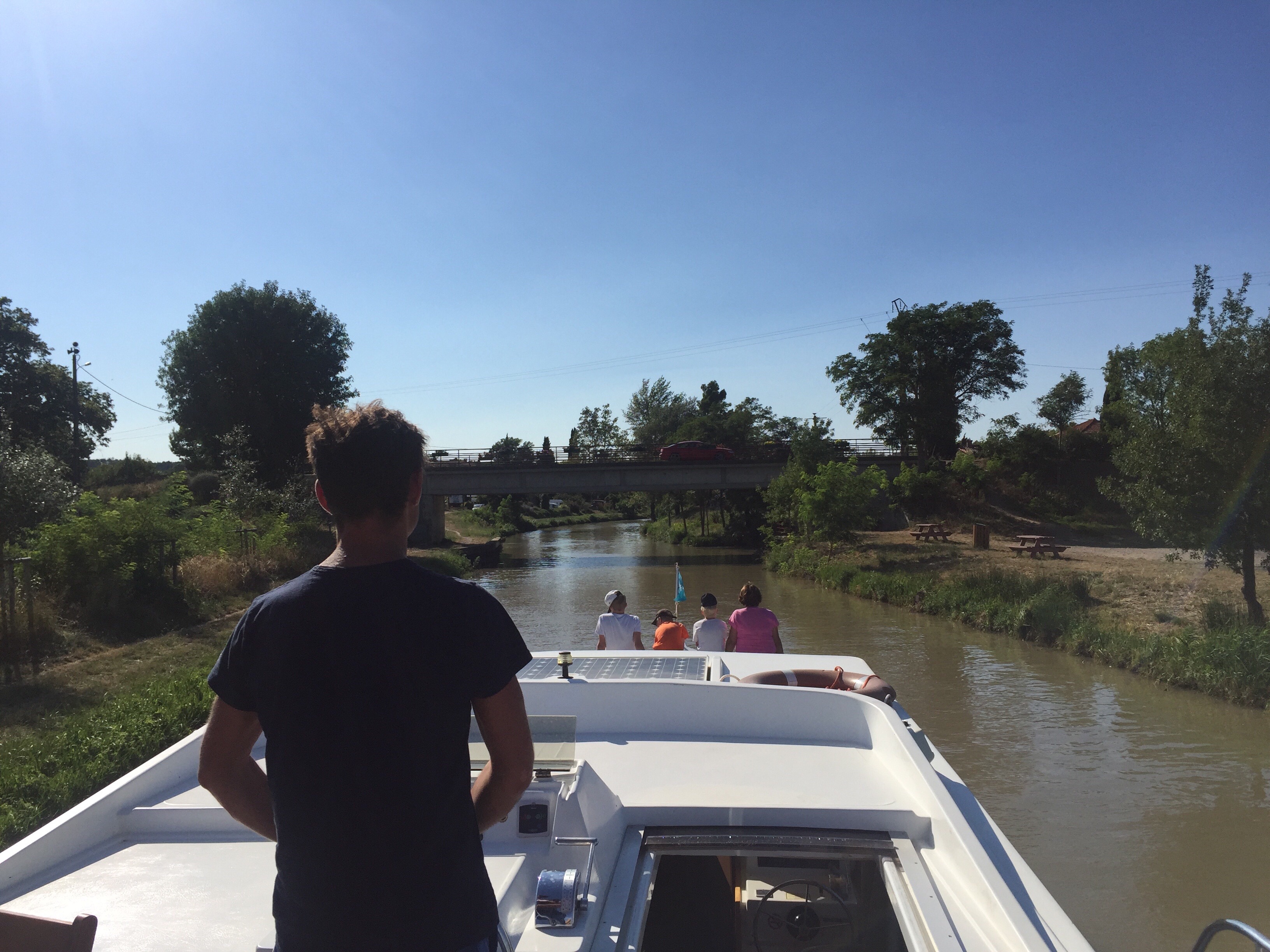 Da die Schleuse kurz vor dem Örtchen Homps bei unserer Ankunft bereits geschlossen war, haben wir unser Schiffchen für die Nacht einfach an einem Baum am Ufer festgemacht. Die gute Fee hat für alle hungrigen Matrosen noch ein leckeres Abendessen gekocht und nun liegen wir an Deck und zählen Sternschnuppen…