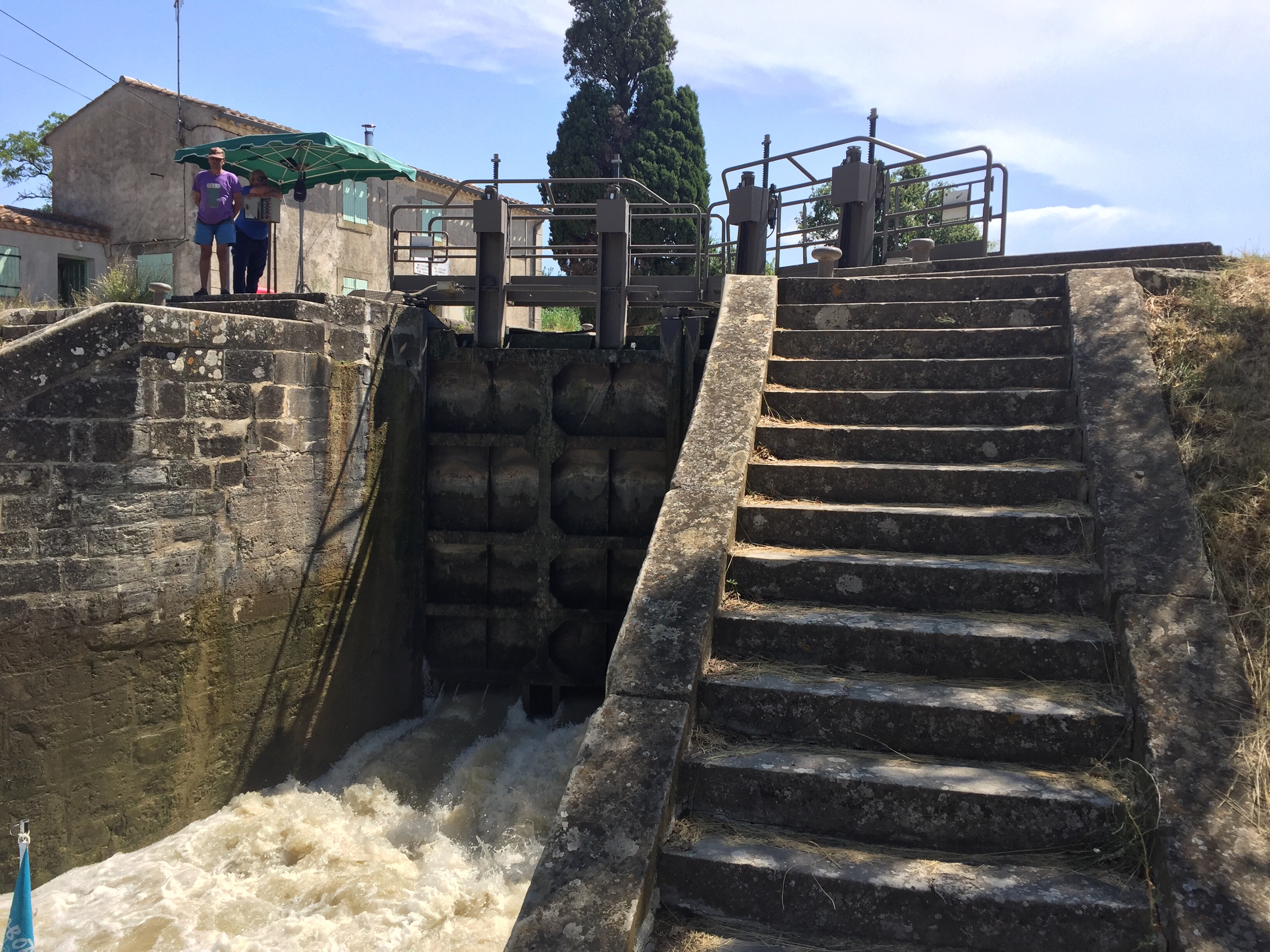 Bei unserer Abfahrt gestern wurden wir gefragt, ob wir sicher sind, dass wir in Richtung Carcassonne fahren wollten, da auf dieser Strecke besonders viele Schleusen liegen. Es war definitiv die richtige Entscheidung. Einfach nur vor sich hin zu fahren, wäre nur der halbe Spaß gewesen – vor allem für die drei jüngsten Matrosen, die bei jeder Schleuse mit Feuereifer dabei sind.