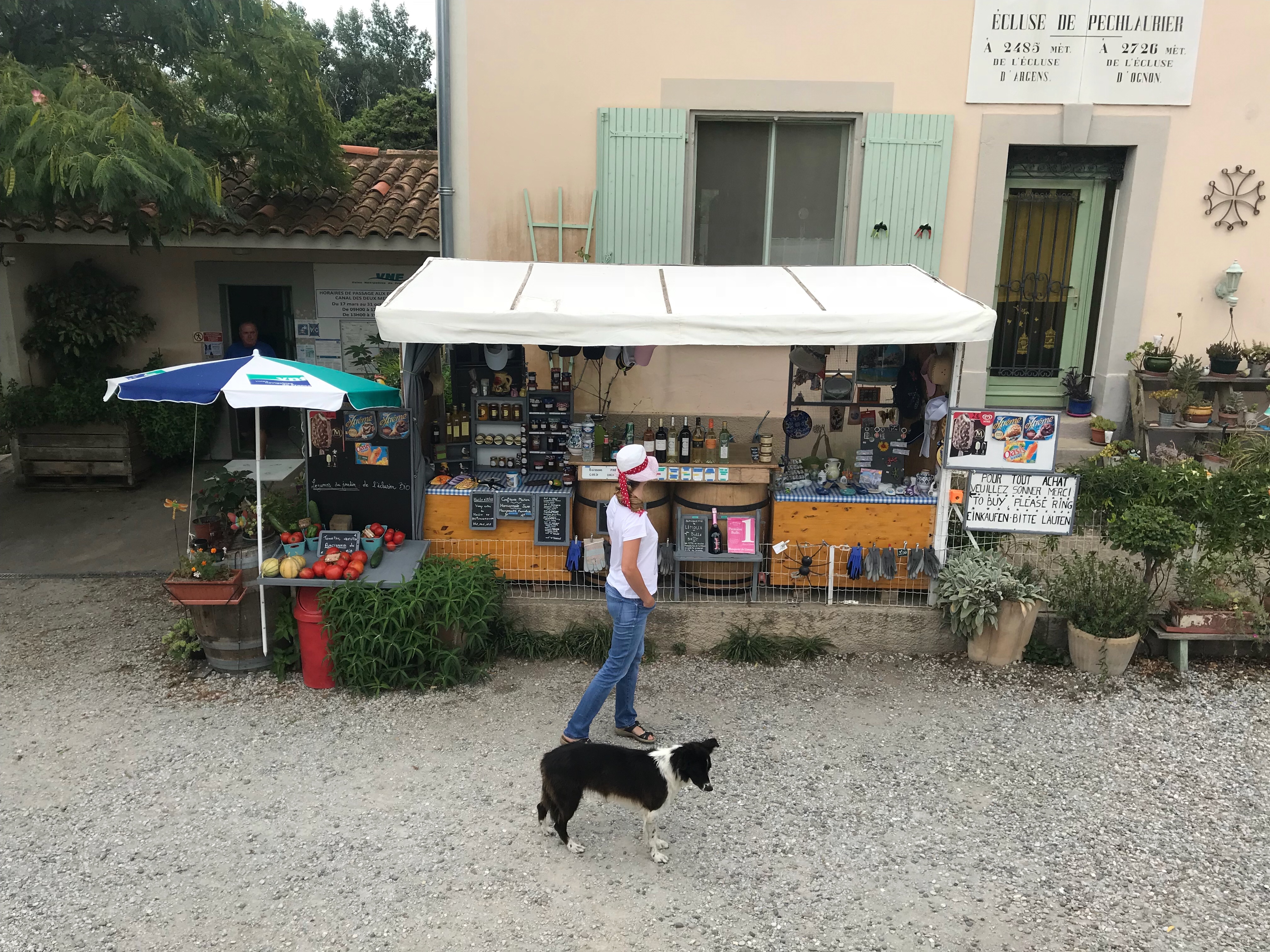 Nachdem wir die letzte Schleuse mit ihrem kleinen Kiosk, an dem man neben Wein und verschiedenen Utensilien auch frisch geerntetes Obst und Gemüse erwerben kann, durchfahren hatten, haben wir unser Bötchen noch ein letztes Mal am Kanalufer festgemacht, um noch dem Örtchen Roubia einen kleinen Besuch abzustatten.