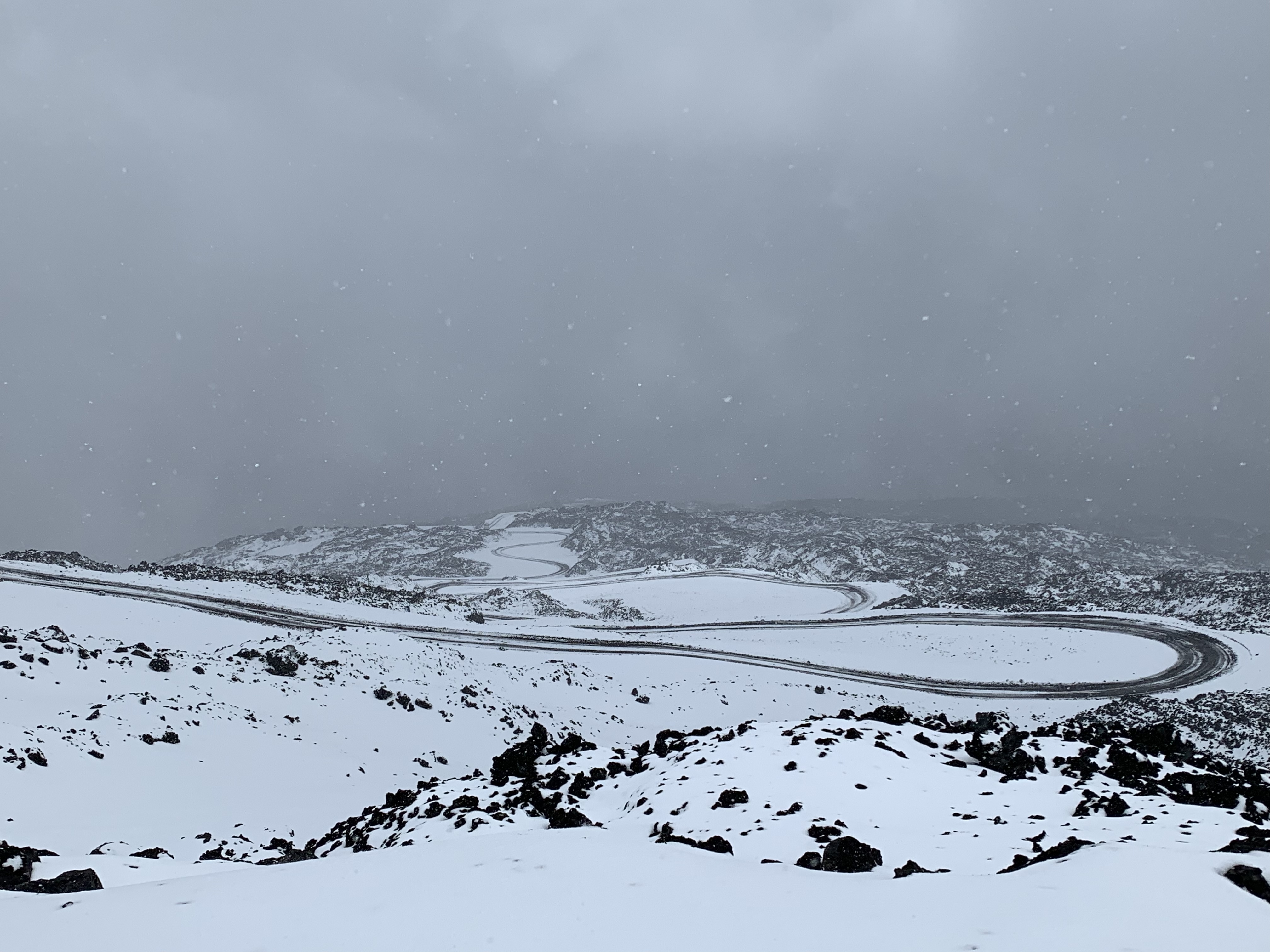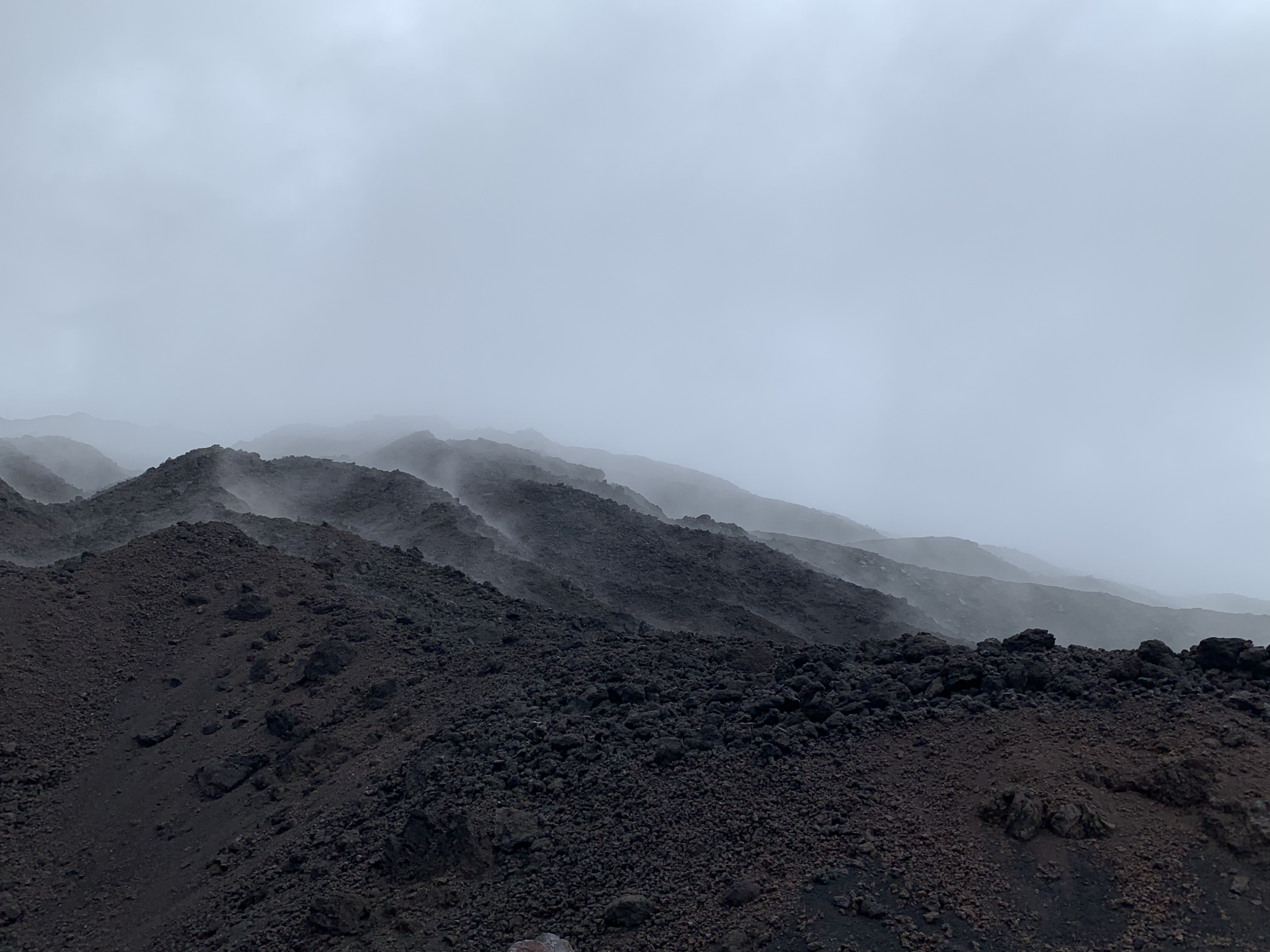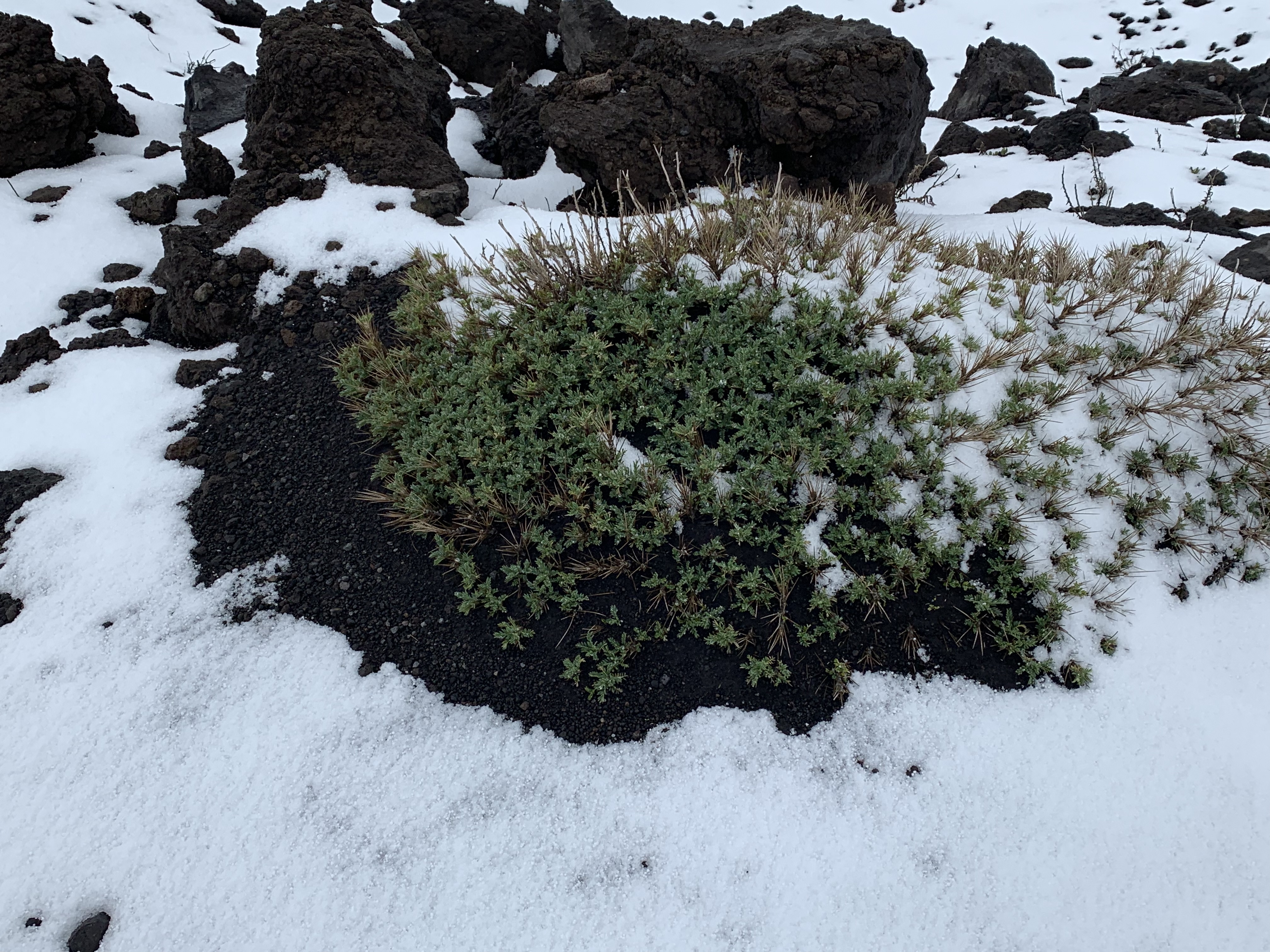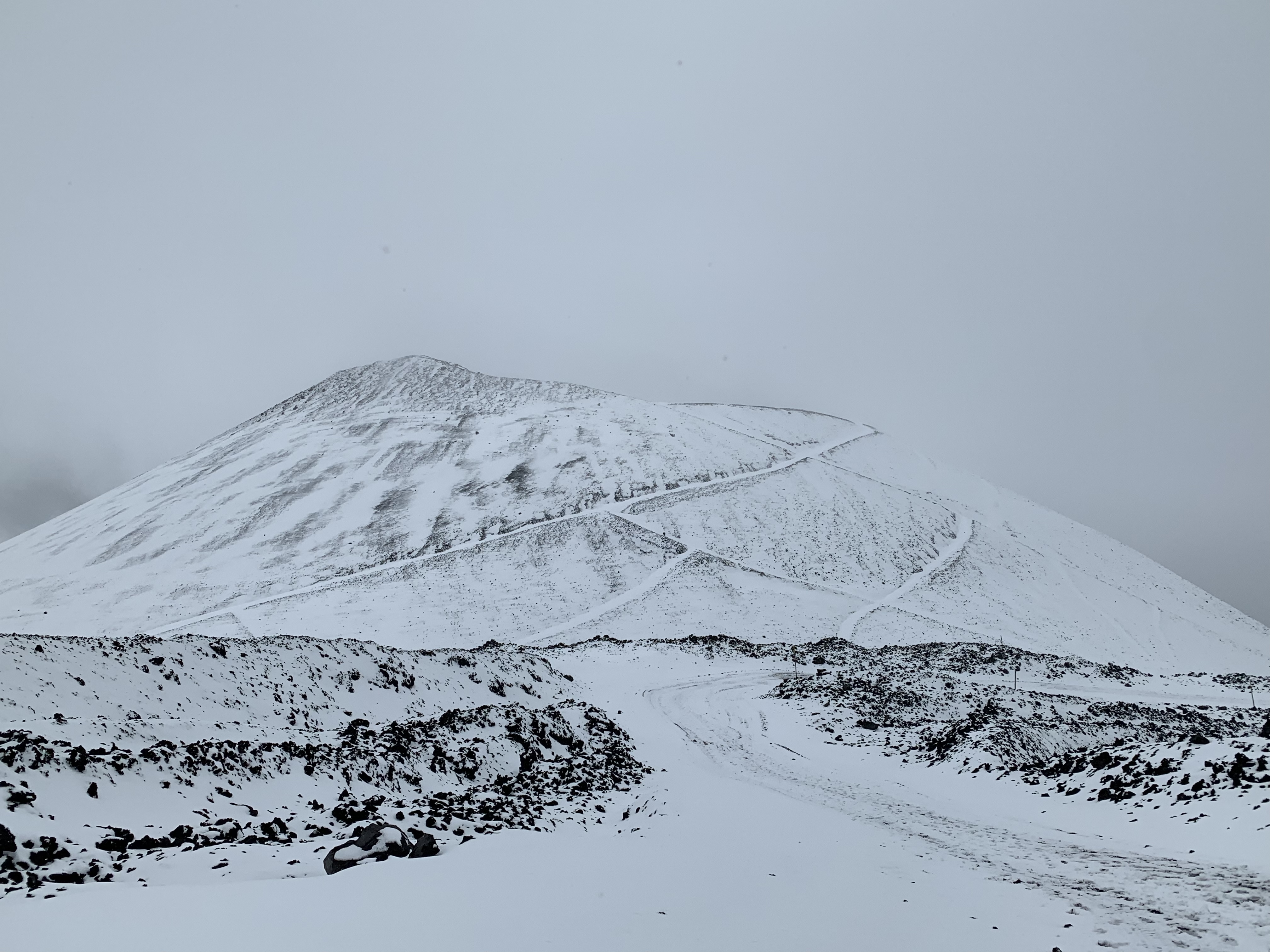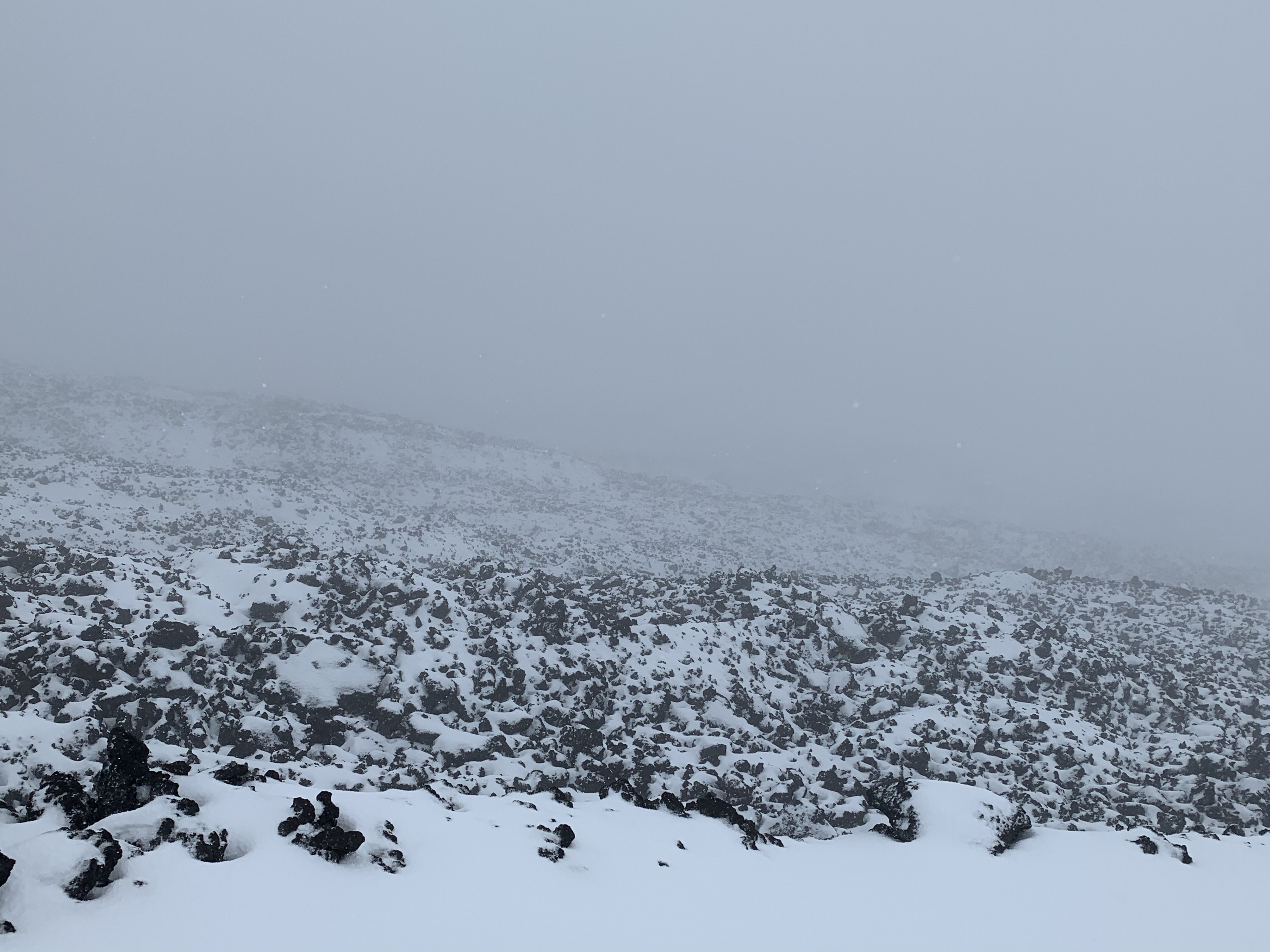 Für den Weg nach unten – auf dem uns übrigens keine Menschenseele begegnete 😳 – entschieden wir uns dann gegen die Seilbahn und wanderten bis zur Talstation, denn abgesehen von der etwas unwirtlichen Wetterlage, gibt es auf so einem Vulkan schon eine Menge Interessantes zu sehen. Die Steine auf dem Weg sind nicht hart sondern weich und krümelig wie Erde. (Der fallende Schnee dagegen war ungewöhnlich hart und fast kugelrund.)