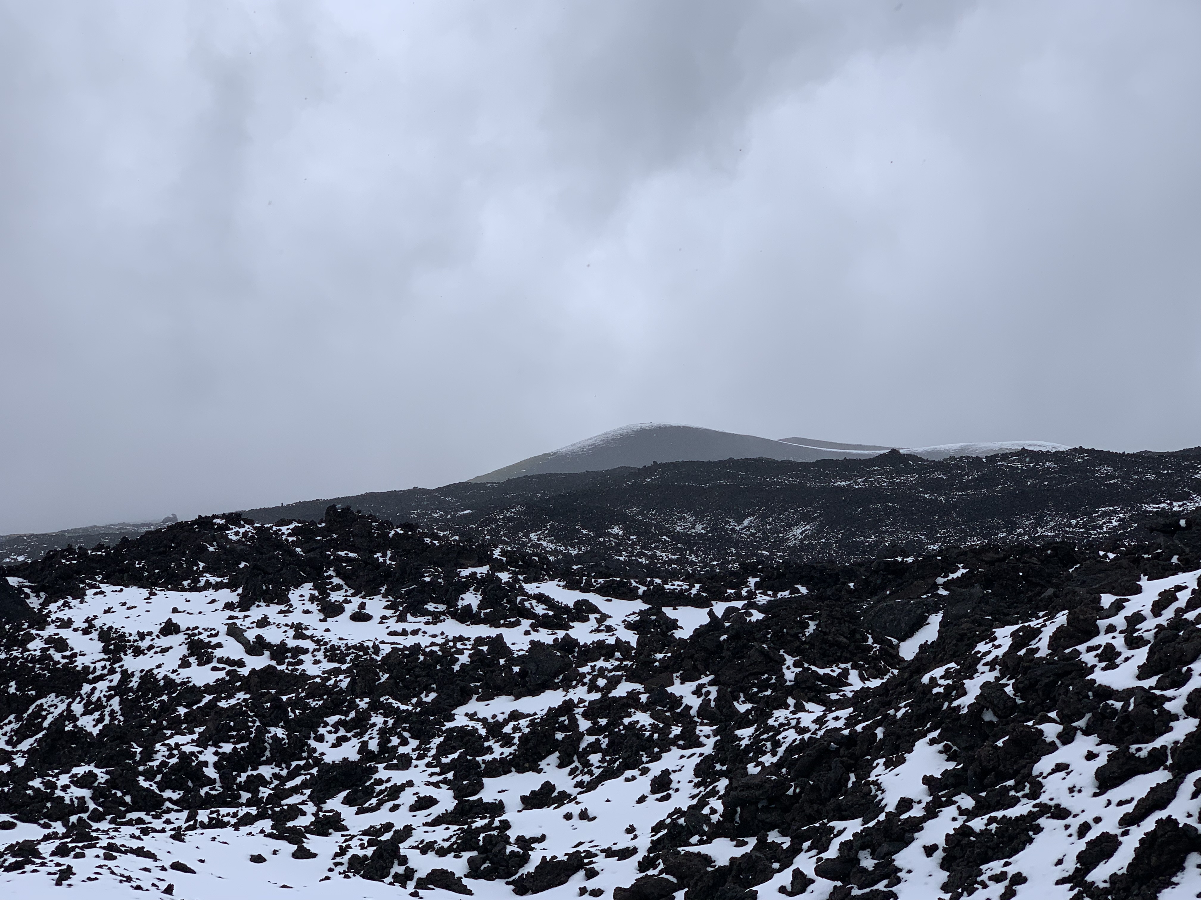 Wir hatten jedoch einige Berichte von Touristen gelesen, die den Weg bis zum Gipfel bzw. zum Hauptkrater auf ca. 3.300m ohne Probleme allein geschafft hatten. Auch hatte ich mich auf den offiziellen Seiten vorab bzgl. des aktuellen Ausbruchsrisikos informiert. Und nachdem wir angesichts der Wetterlage den Torre del Filosofo vor uns noch nicht mal erahnen konnten und der Weg nach oben ziemlich deutlich vor uns lag, entschieden wir uns, noch etwas weiter zu gehen, in der Hoffnung, dass die Sicht eventuell besser werden würde oder wir zumindest bis an die Stelle kämen, an der die Wärme unter der Oberfläche den Schnee schmilzt.
