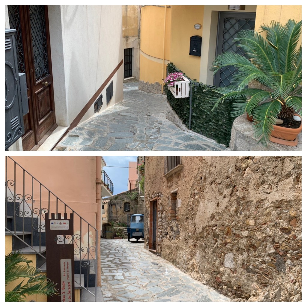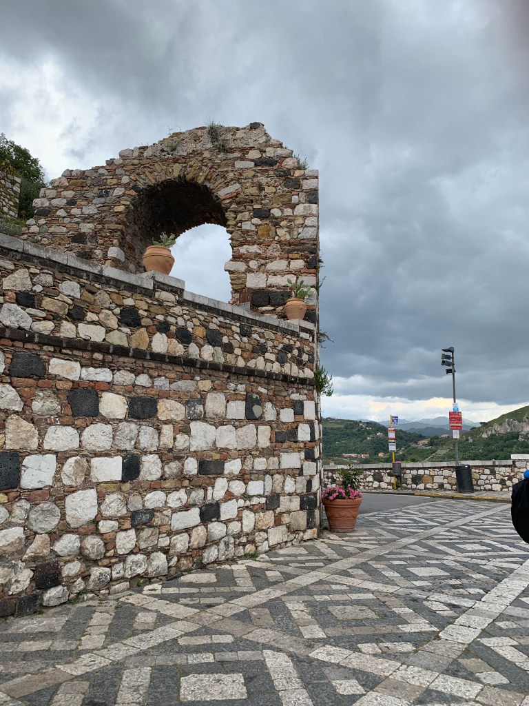 Das Zentrum von Taormina – die Fußgängerzone zwischen den zwei erhaltenen antiken Stadttoren oben auf dem Monte Tauro – lässt sich entweder zu Fuß, mit Hilfe der Seilbahn oder mit dem Auto erreichen, wobei das Auto von den dreien definitiv die abenteuerlichste Methode darstellt. In dem kleinen Städtchen drängen sich die Häuser dicht aneinander und bis nah an die Felsenkante heran. Die engen Straßen bieten kaum genug Platz für ein Fahrzeug, geschweige den für zwei. Ein Grund dafür, dass die meisten Straßen in Taormina Einbahnstraßen sind. Parken dürfen in Taormina selbst nur Anwohner und Hotelgäste sofern das Hotel entsprechende Parkmöglichkeiten zur Verfügung stellt. Wer ein Hotel ohne Parkplatz gebucht hat, muss entweder auf ein Hotelshuttle hoffen oder den Weg nach oben vom zentralen Parkplatz weit unterhalb des Örtchens zu Fuß zurücklegen. Bürgersteige sind auf diesem Weg allerdings nur sehr sporadisch vorhanden. Wobei man sich – angesichts der interessanten Fahrweise der Einheimischen – auch dort nie so ganz sicher fühlt. 🙂