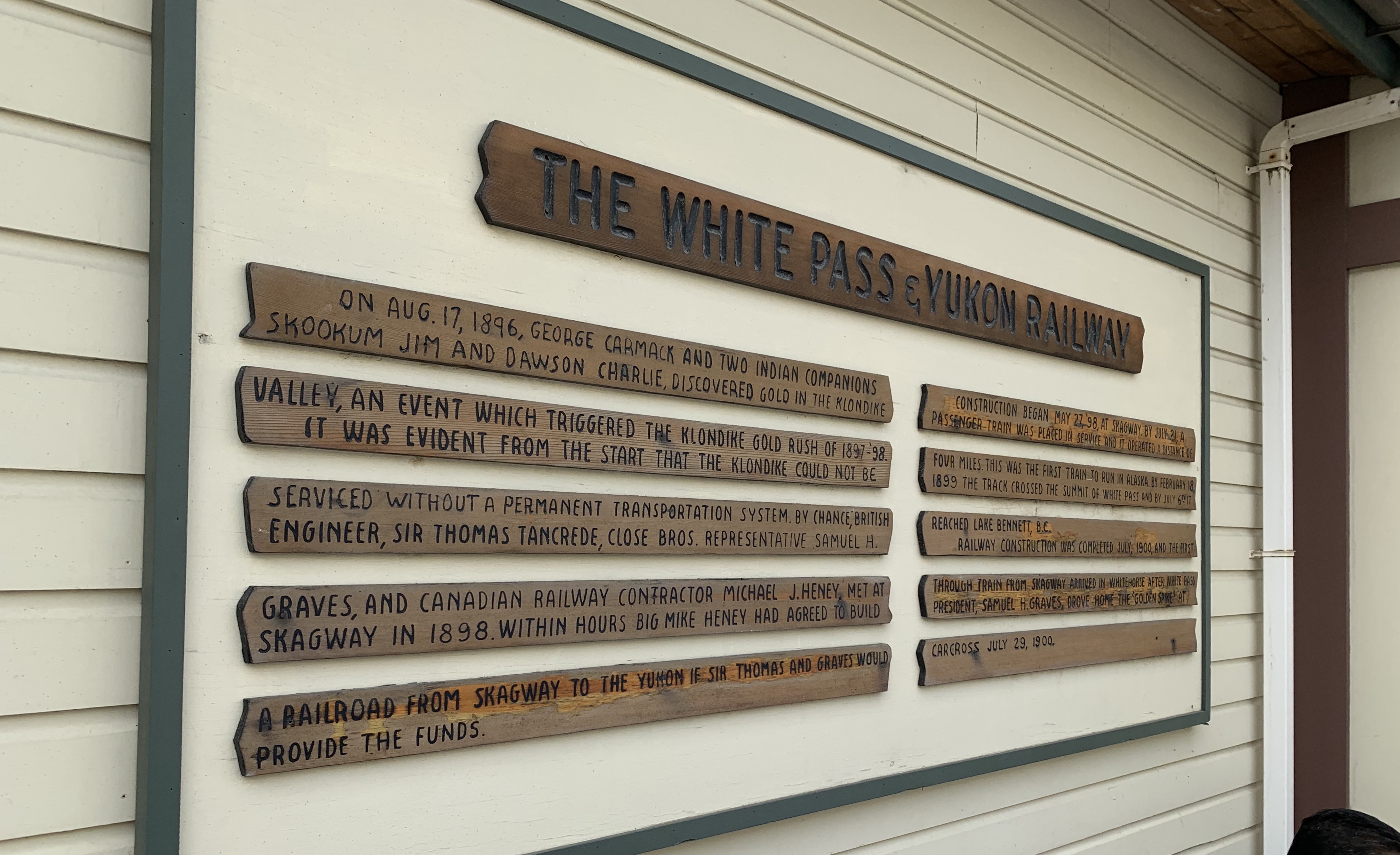 Nach einem kurzen Spaziergang durch das Örtchen, bei dem wir innerhalb von ca. 10 Minuten an den wichtigsten Sehenswürdigkeiten in Form von einem Supermarkt, dem Post- & Bankgebäude, zwei Restaurants, einem Saloon (mit dem verheißungsvollen Namen „Happy Ending“) und dem historischen Bahnhofsgebäude des White Pass & Yukon Railway vorbeigekommen waren, entschieden wir uns noch zu einem Ausflug zum Goldrush Cemenentary (Goldrauschfriedhof), vor allem um die Gräber von Jefferson ‚Soapy‘ Smith und Frank Reid finden.