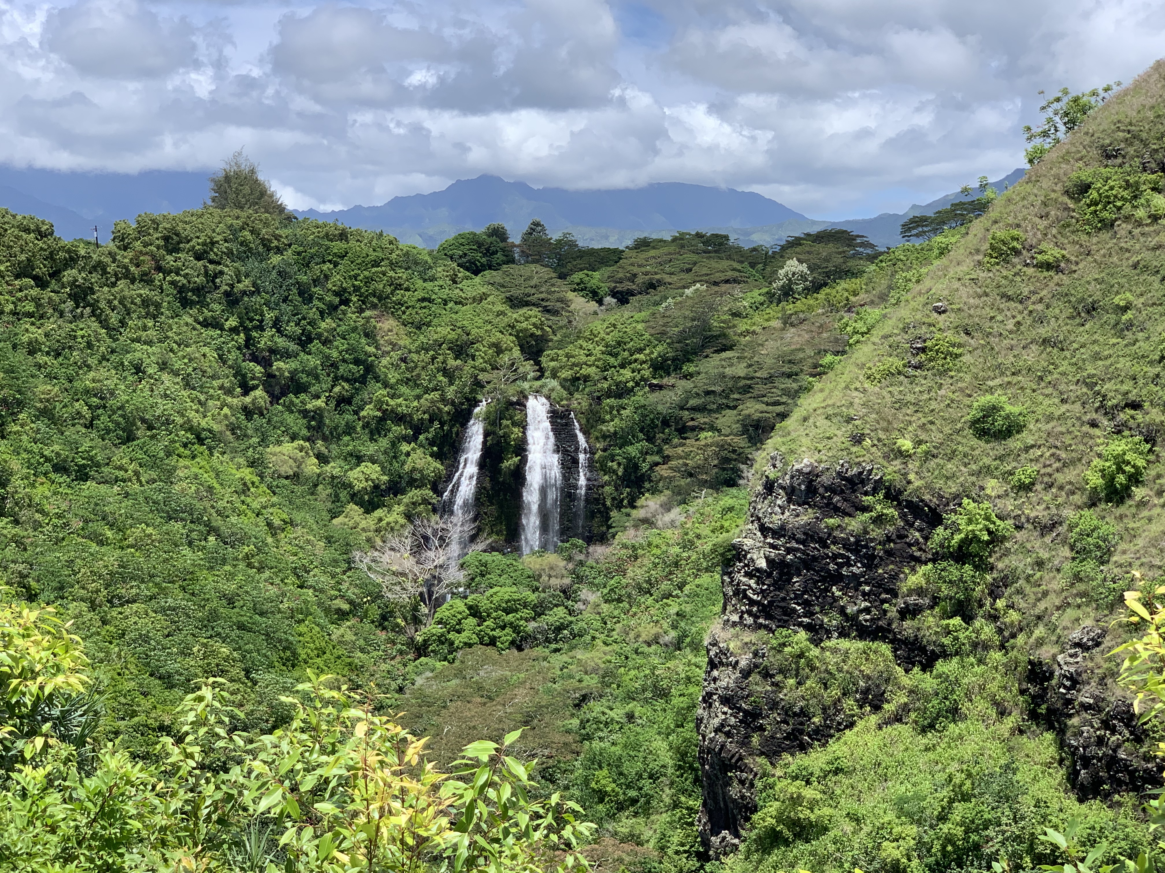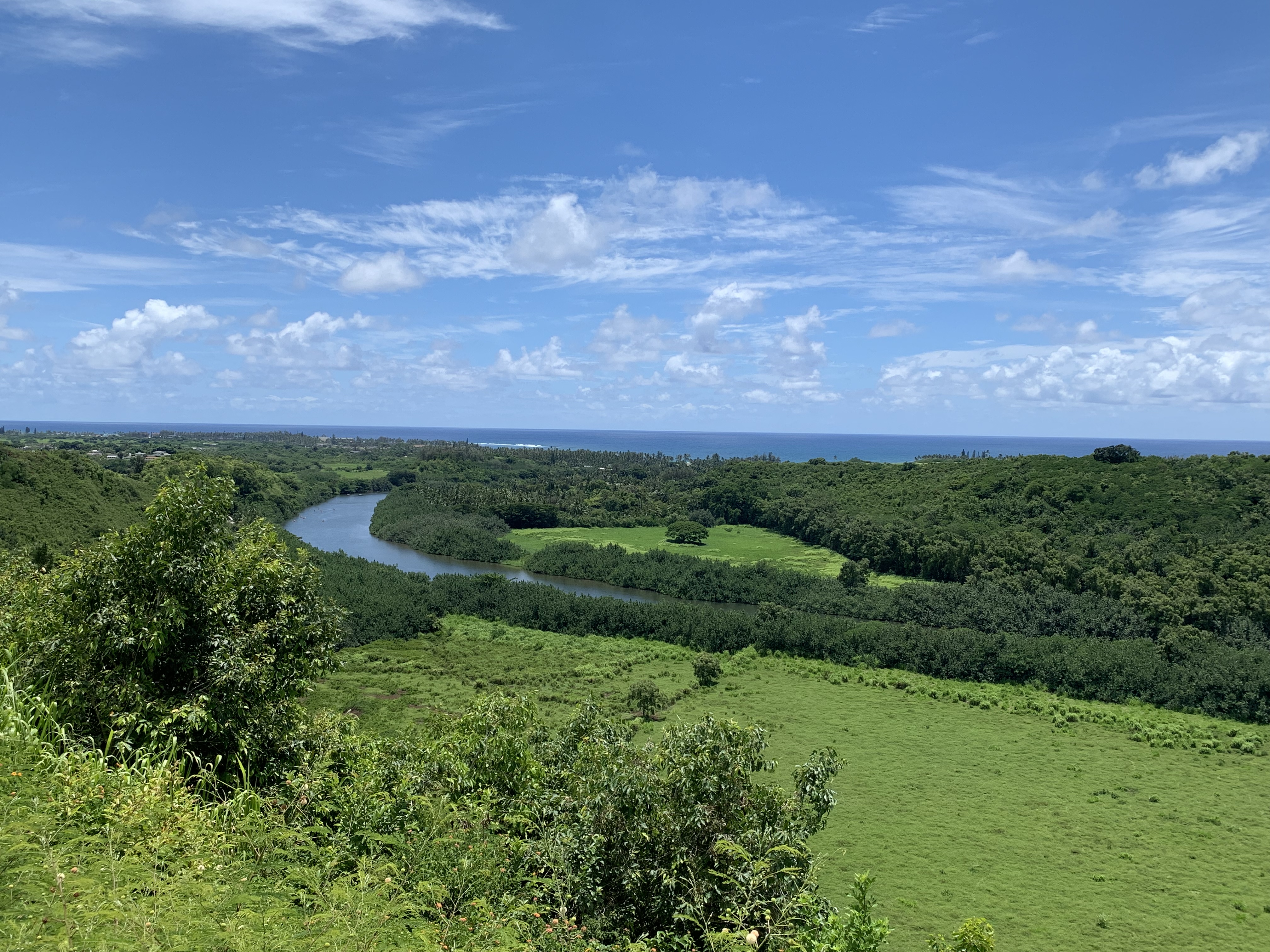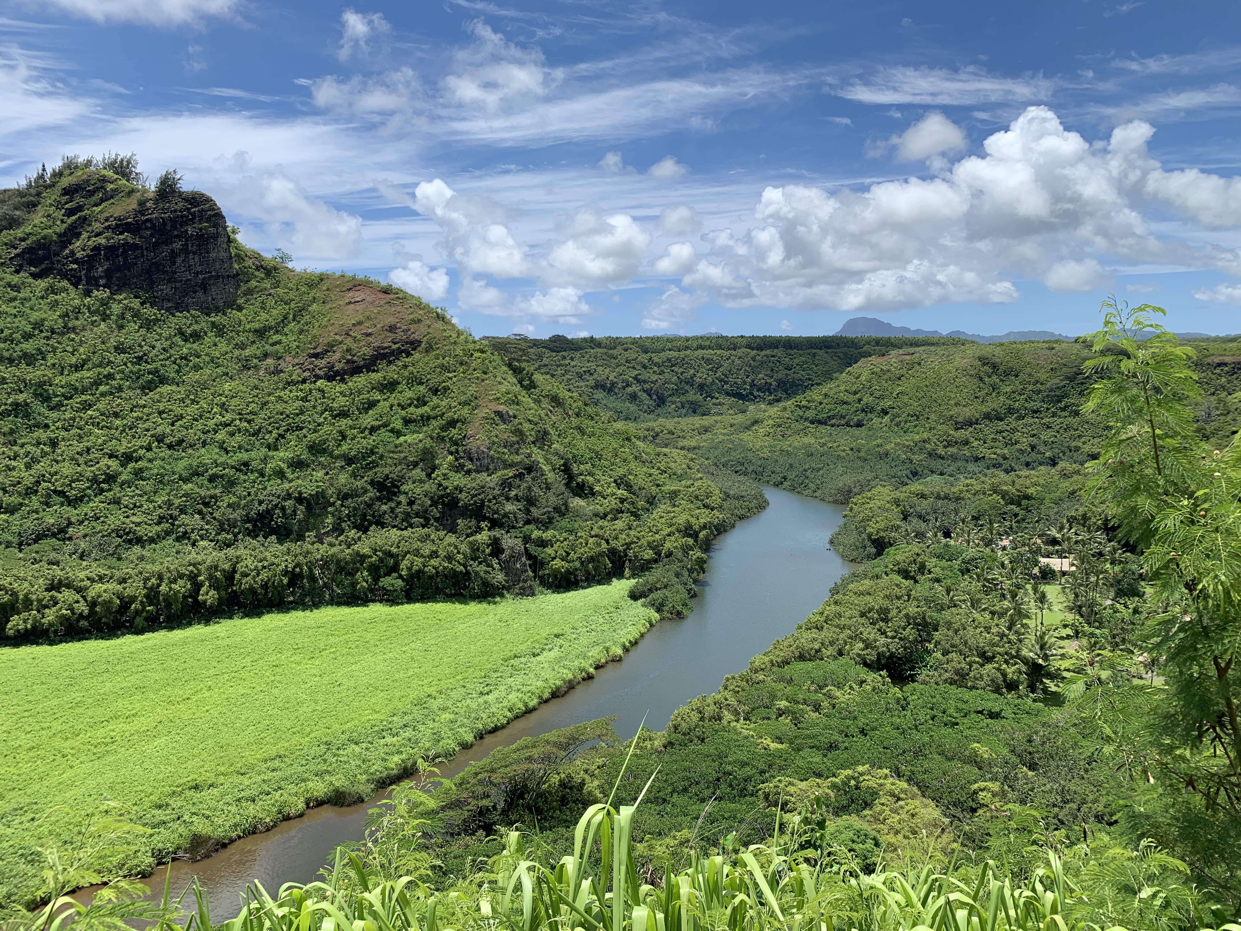 In kurzer Entfernung zu den Wasserfällen hat man von der gegenüberliegenden Straßenseite aus einen wunderschönen Blick über das Tal des Wailua Flusses – mit seinen 32 km der längste Fluss auf Kaua’i und drittlängster Fluss von ganz Hawai’i. Es handelt sich auch um den einzigen schiffbaren Fluss von Hawai’i – also für alles, was größer als ein Kajak ist. 🙂