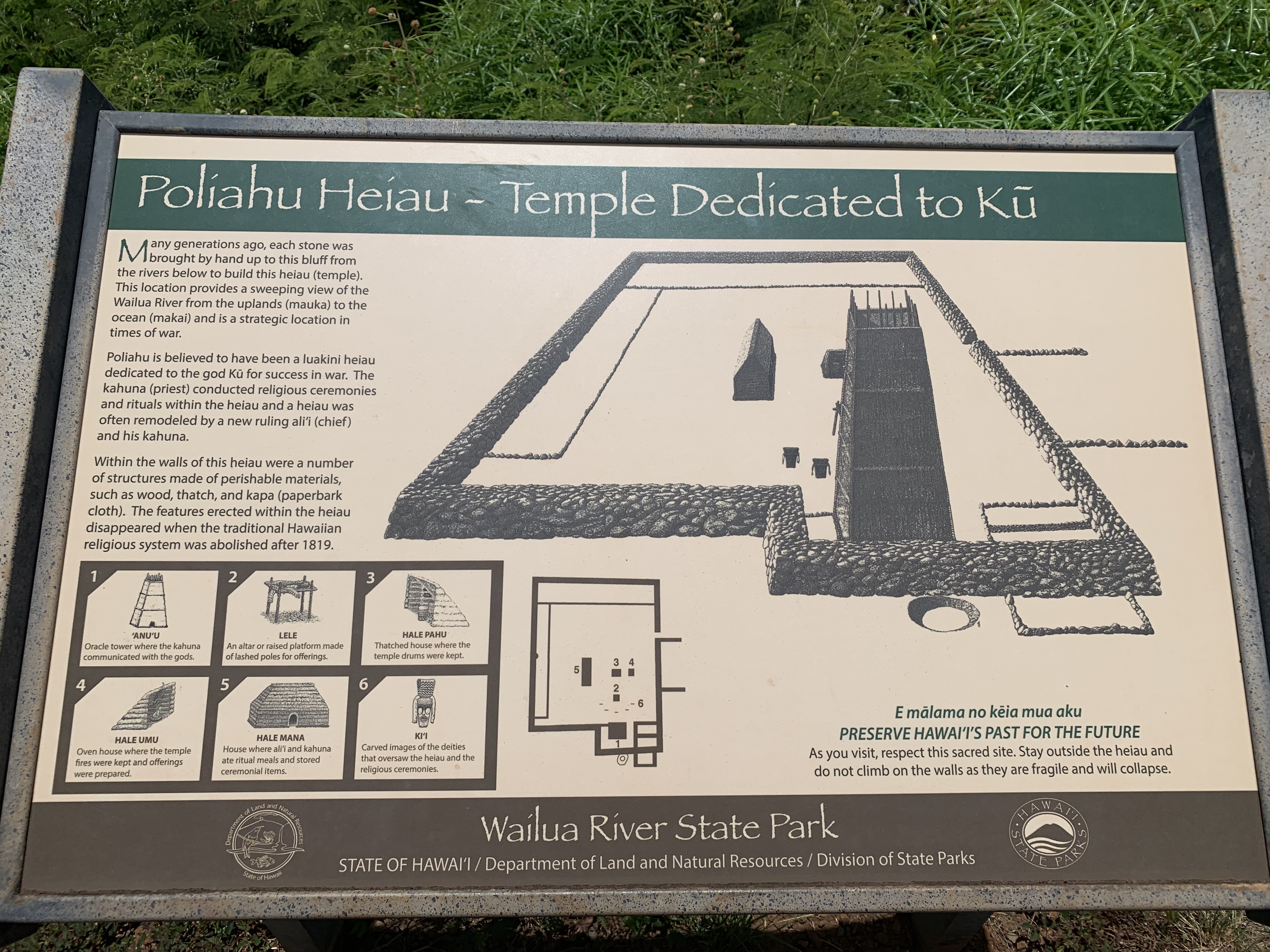 Dieser Heiau – benannt nach der Schneegöttin Poli’ahu (übrigens eine Schwester der Göttin Pele – damals zuständig für Feuer, Blitze, Vulkane und Gewalt ganz allgemein und Gegenspielerin von Poli’ahu nach dem typischen kalt-gegen-warm, gut-gegen-böse Prinzip) – war dem Kriegsgott Kū gewidmet. Diesem Gott wurden in der Hawaiianischen Religion auch durchaus Tier- und Menschenopfer gebracht. Dies war damals nicht bei allen Göttern notwendig.