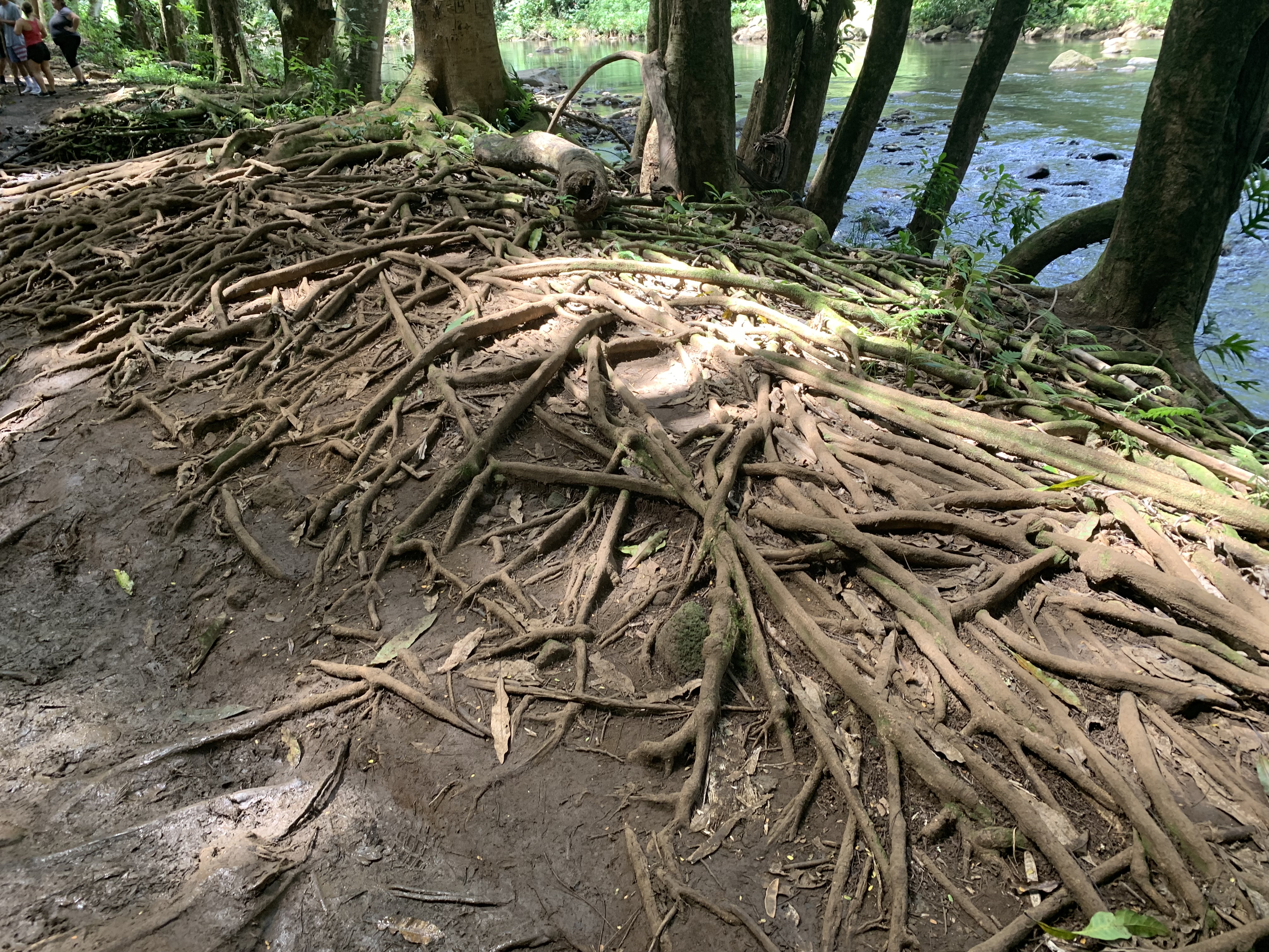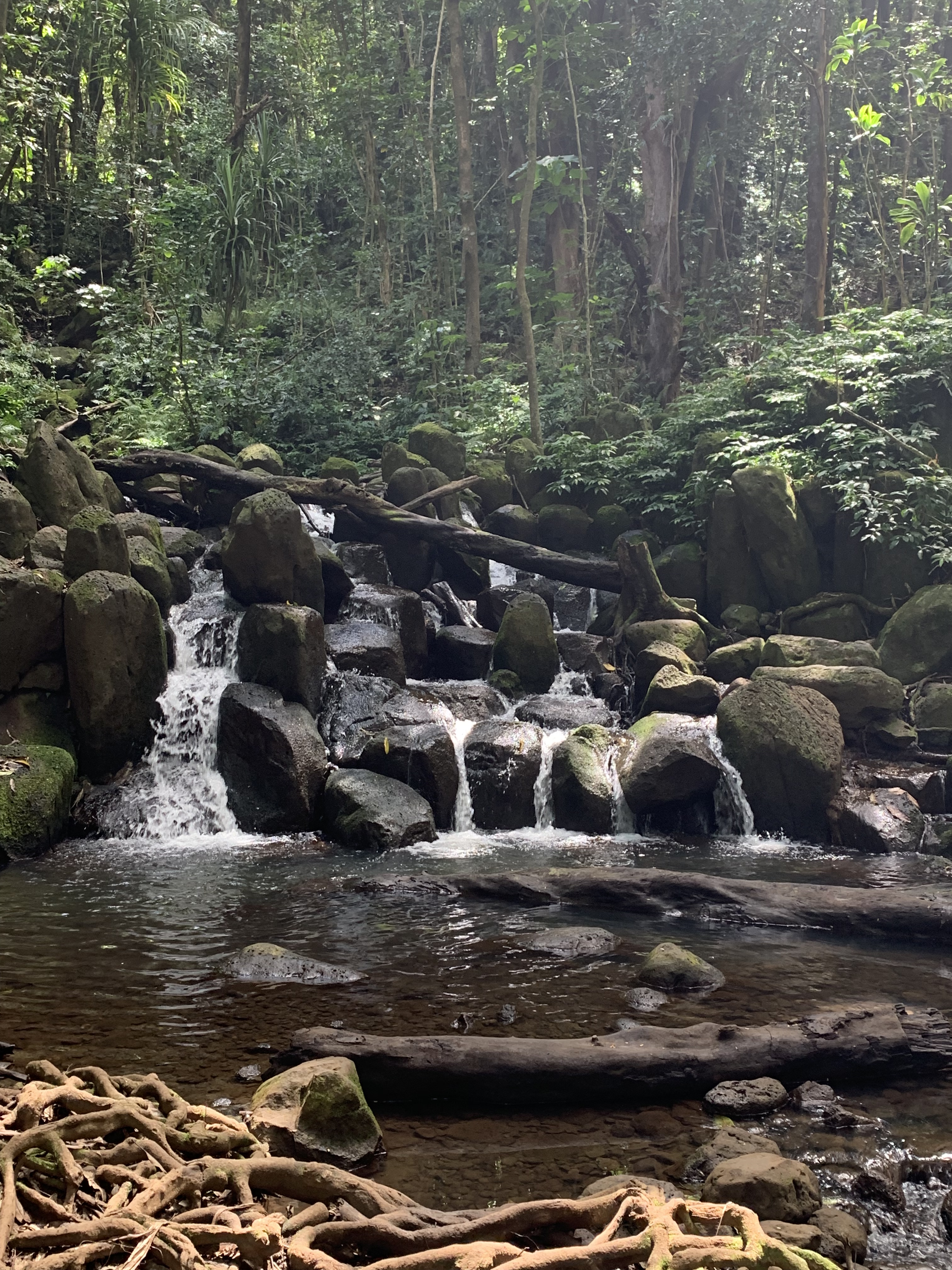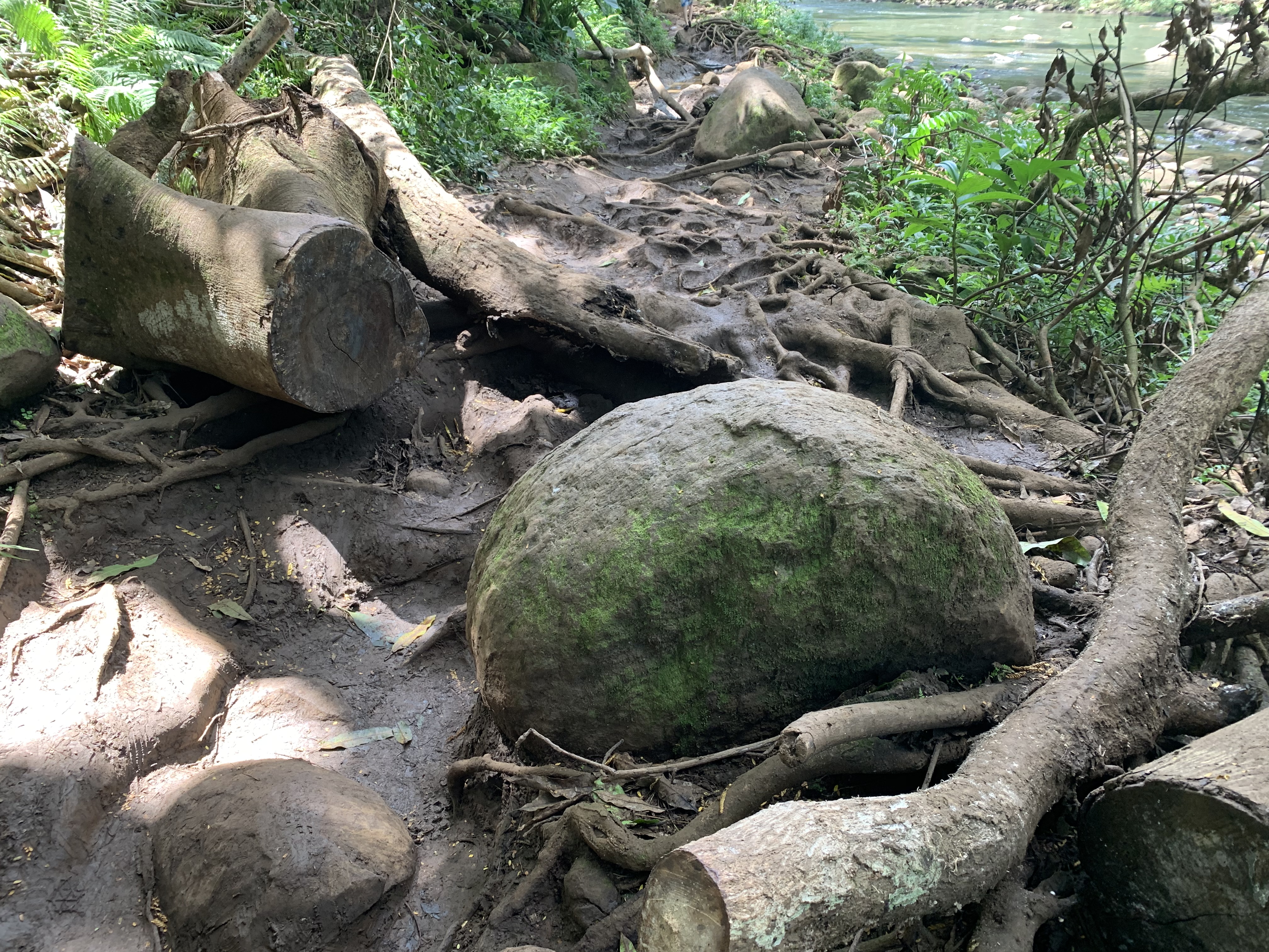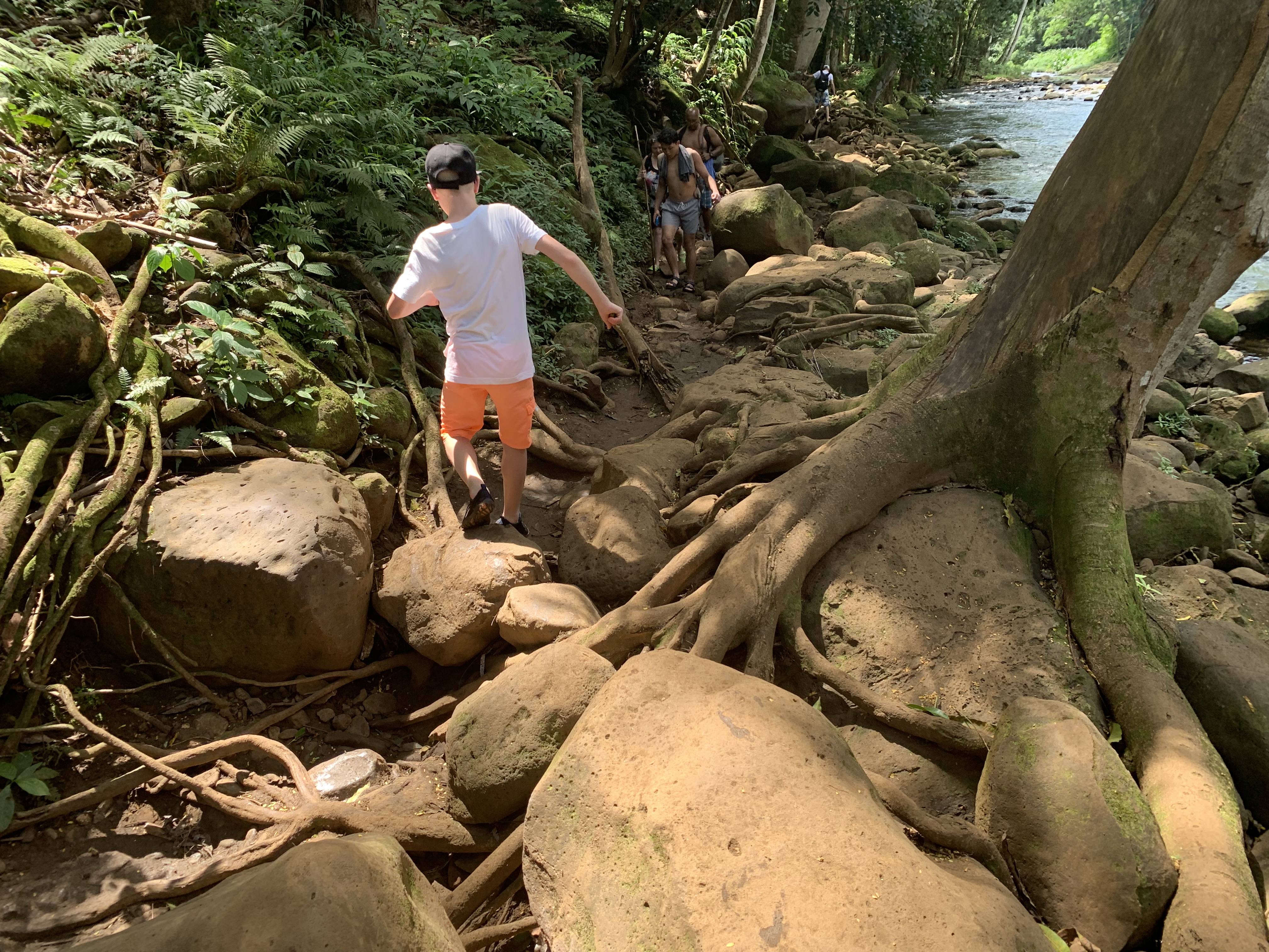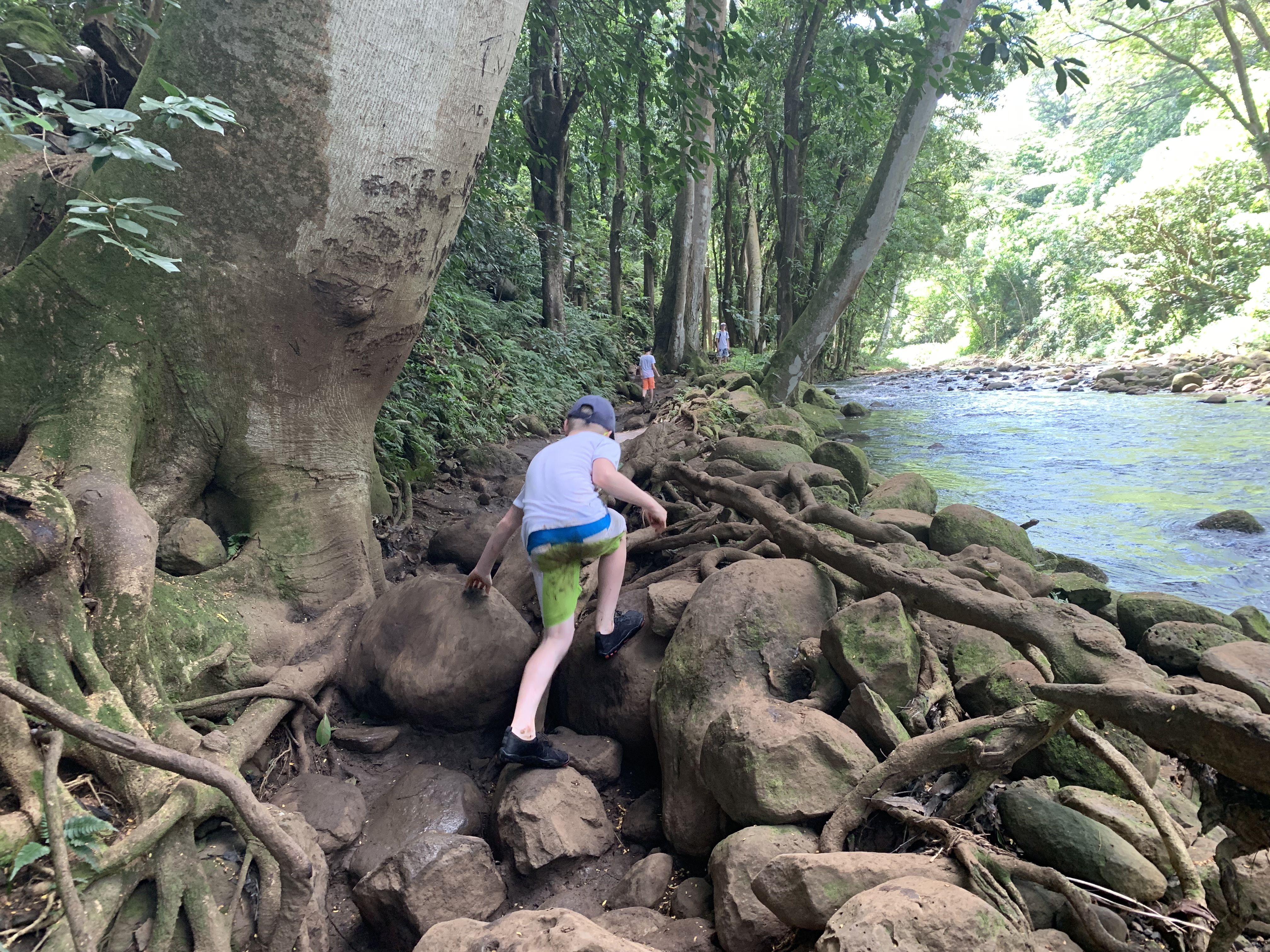 Nach ca. 15 Minuten sehr entspanntem Vor-uns-hin-Paddeln (ok, ich gebe zu, ich habe viel Paddeln lassen :-)) erreichten wir den Eingang zum Trail, der zu den Secret Falls führt. Die Wanderung dauert nur ca. 30 Minuten und verläuft ohne nennenswerte Anstiege. Allerdings quer durch den Regenwald, über einiges an Wurzeln und Steinen und inklusive mehrerer Flussdurchquerungen. Landschaftlich wieder einfach nur großartig und aus Sicht der Jungs besser als jeder Abenteuerspielplatz. 😀