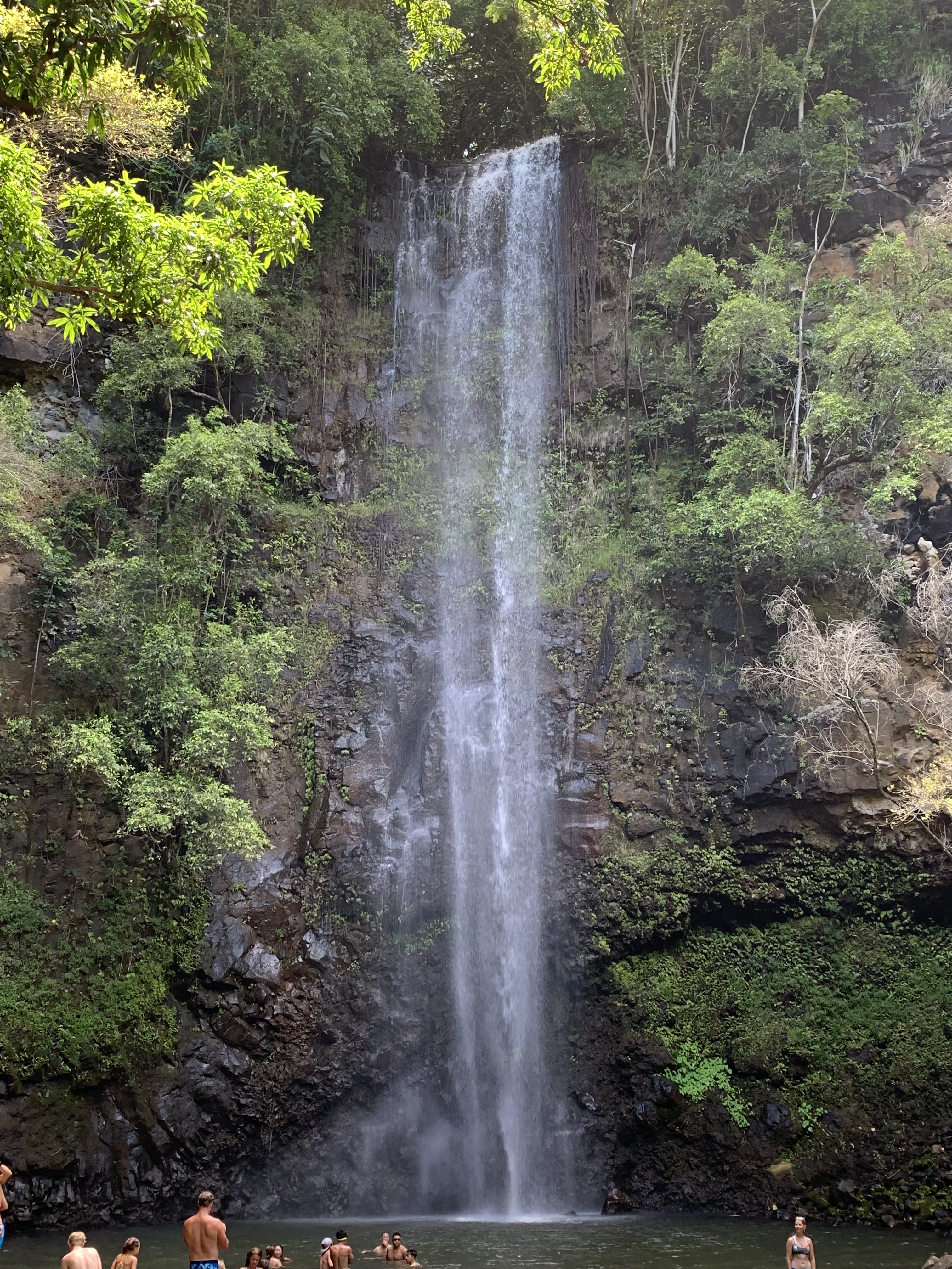 Im Zentrum des heutigen Tages stand der Wailua River. Wir fuhren ein Stück ins Inselinnere mit einem ersten Stop am Aussichtspunkt der Õpaeka’a Falls – ca. 45m hohe Wasserfälle, zu denen man allerdings nicht wandern kann (zumindest nicht auf einem offiziellen Wanderpfad) und die man daher nur aus der Ferne bewundern kann. Diese Wasserfälle gehören zu den wenigen auf Kaua’i, die direkt von der Straße aus zu sehen sind.