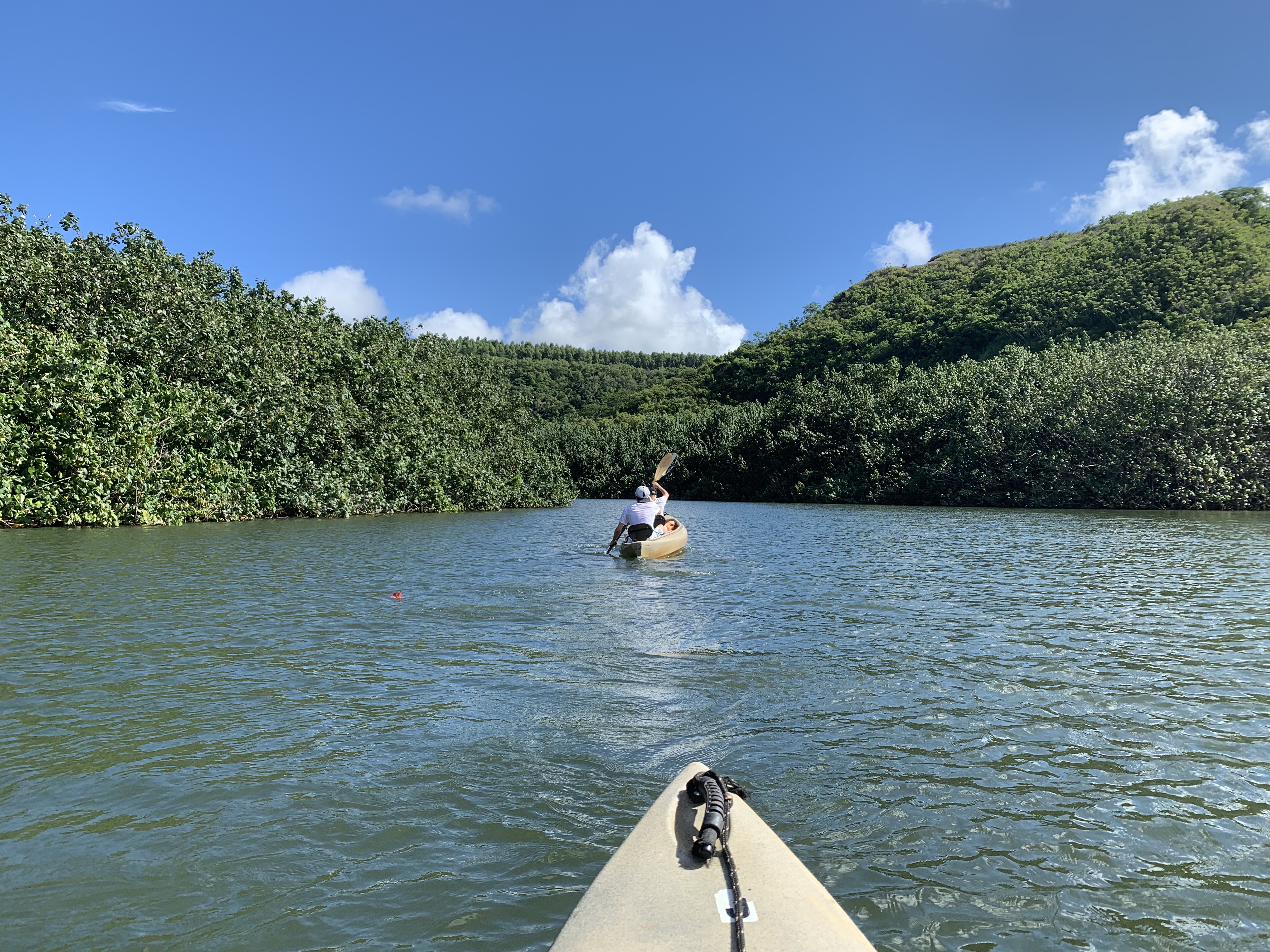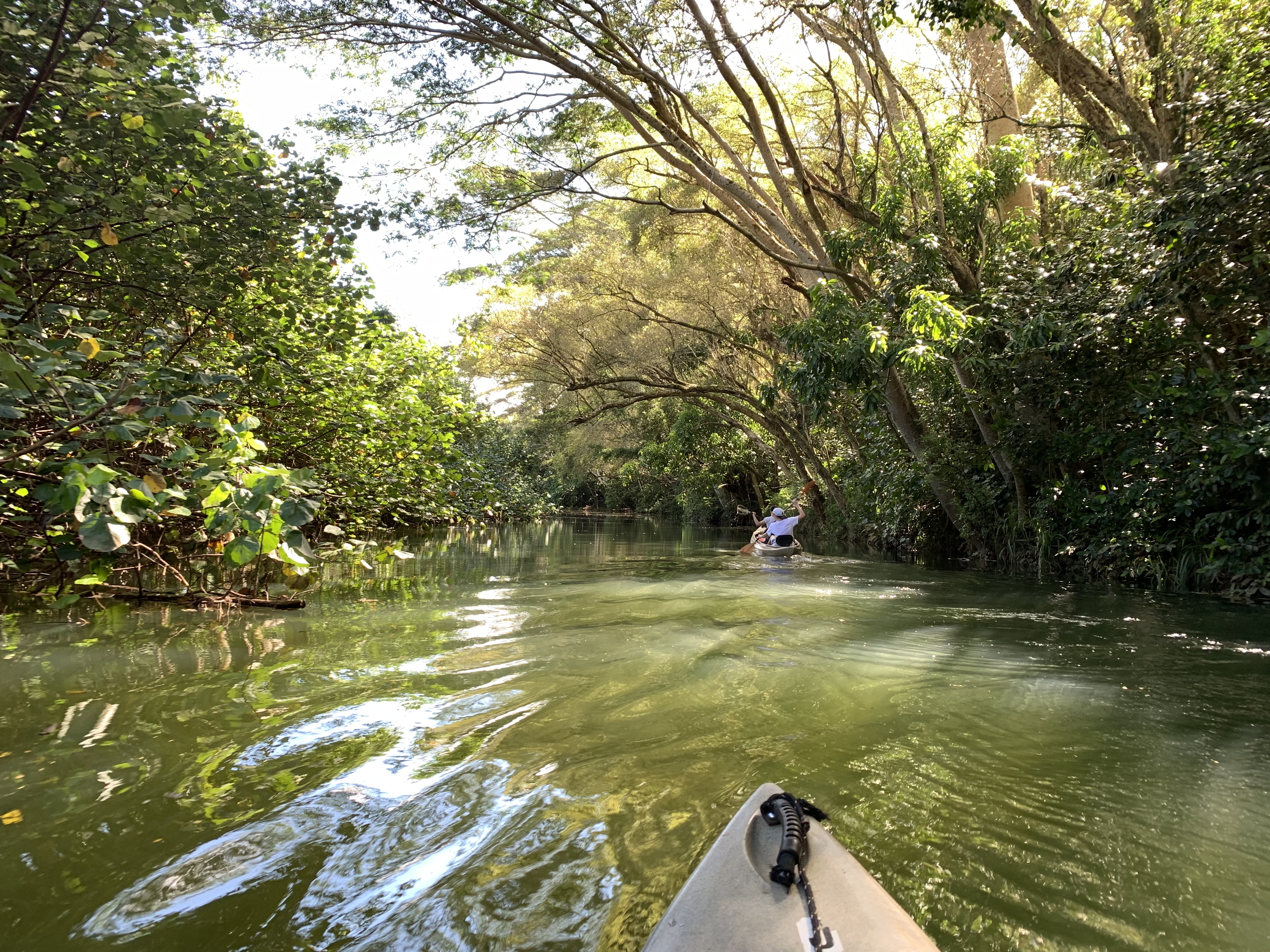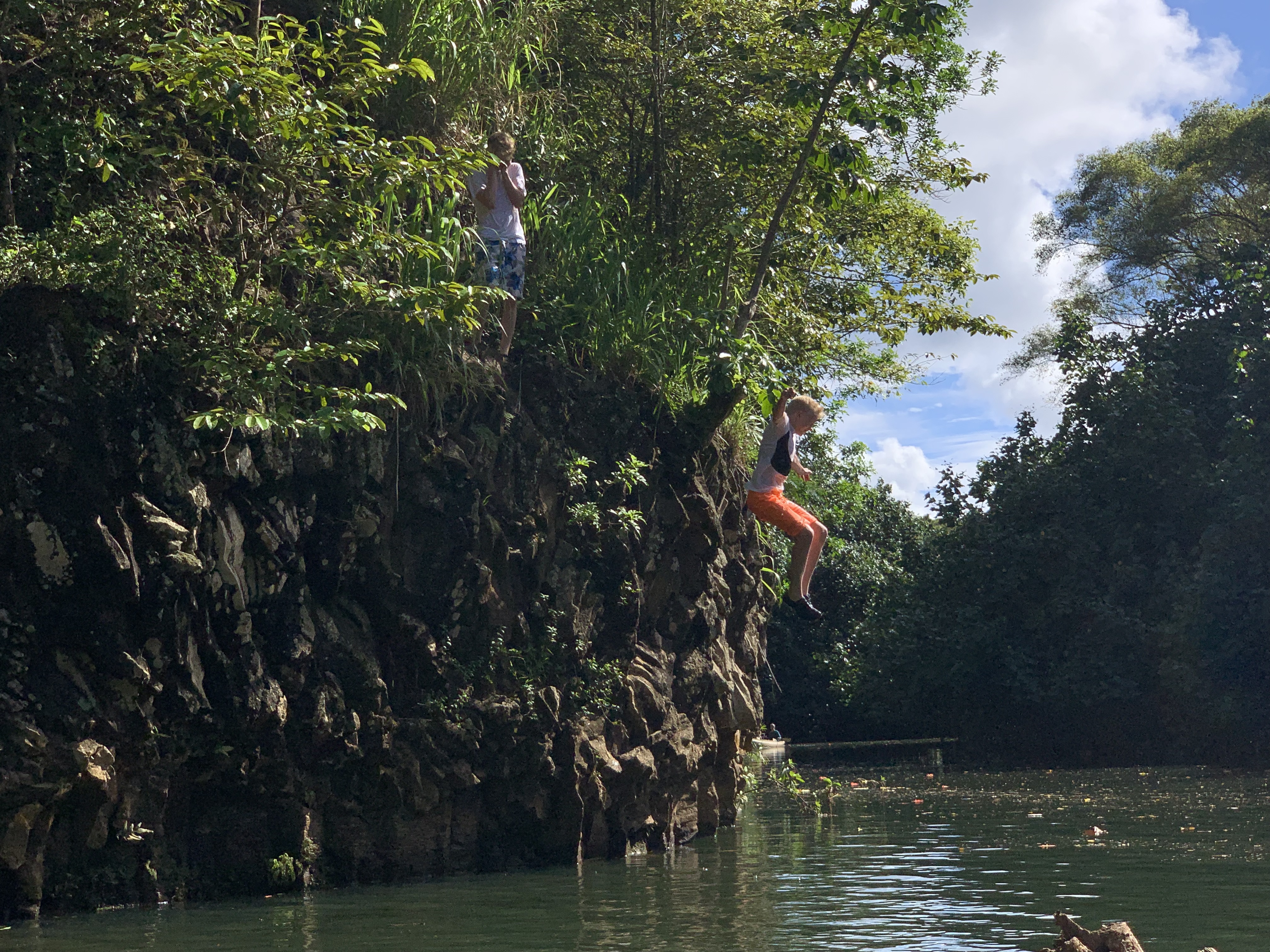 …und mit unserem Kajak noch ein Stück weiter den Fluss hinauf, zu einer Stelle, die als das Swimming hole bekannt ist, weil der Fluss hier ein ganzes Stück tiefer ist, so dass sich ausgiebig schwimmen lässt. Tatsächlich sogar so tief, dass man an einer besonderen Stelle von den Felsen aus etwa 4 Meter Höhe direkt in den Fluss springen kann. Dreimal (Viermal ;-)) dürft ihr raten, wer das natürlich unbedingt einmal (mehrmals) ausprobieren musste. 😋