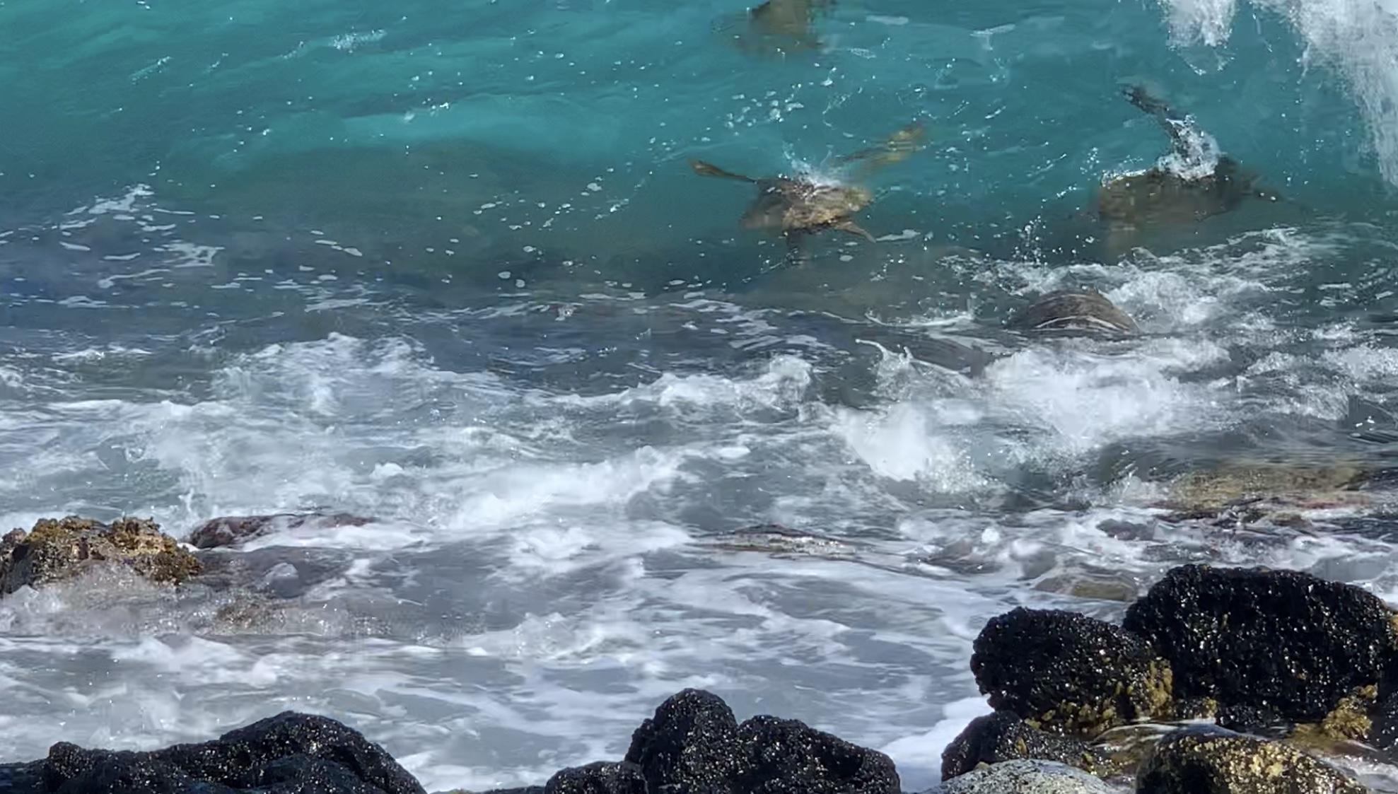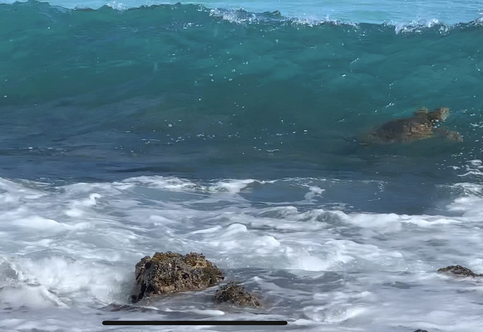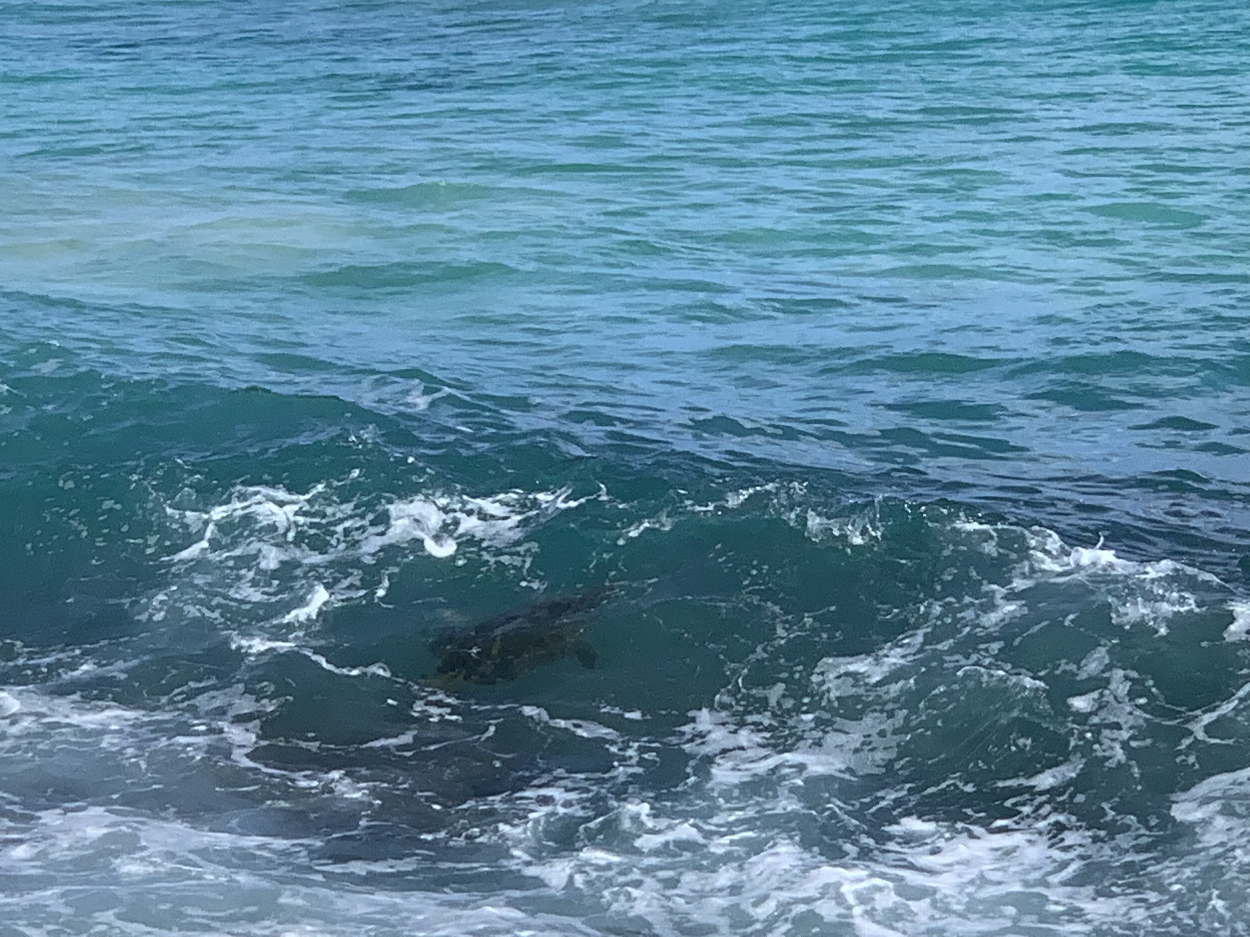Das war wirklich witzig – ich hätte stundenlang zusehen können. (Vielleicht hab ich das auch. :-)) Es schien folgendermaßen abzulaufen: Vor der ersten Welle tauchten sie kurz auf und ließen sich dann mit der Welle ganz nah ans Ufer spülen. Unter der zweiten Welle tauchten sie dann durch und schwammen ausreichend weit zurück, um sich mit der nächsten Welle wieder nach vorn tragen zu lassen. Das ging die ganze Zeit so. Ich nehme mal an, die Kameraden waren auf Urlaub und das ist eben die Art, wie Grüne Meeresschildkröten sich die Zeit vertreiben 🙂