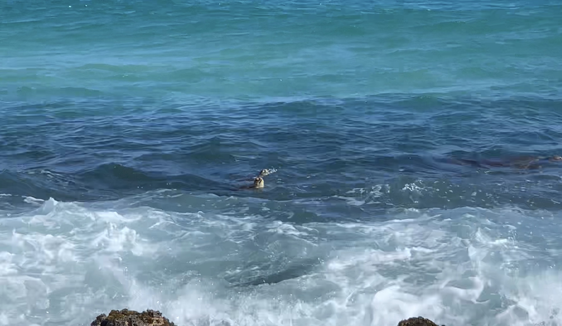 Das Bildmaterial dazu ist etwas dürftig, weil die Freunde sich als äußerst kamerascheu herausstellten, aber wenn ihr genau hinseht, könnt ihr erkennen, wie sie ihren Kopf oder eine Flosse aus dem Wasser strecken oder wie sie durch eine Welle tauchen.