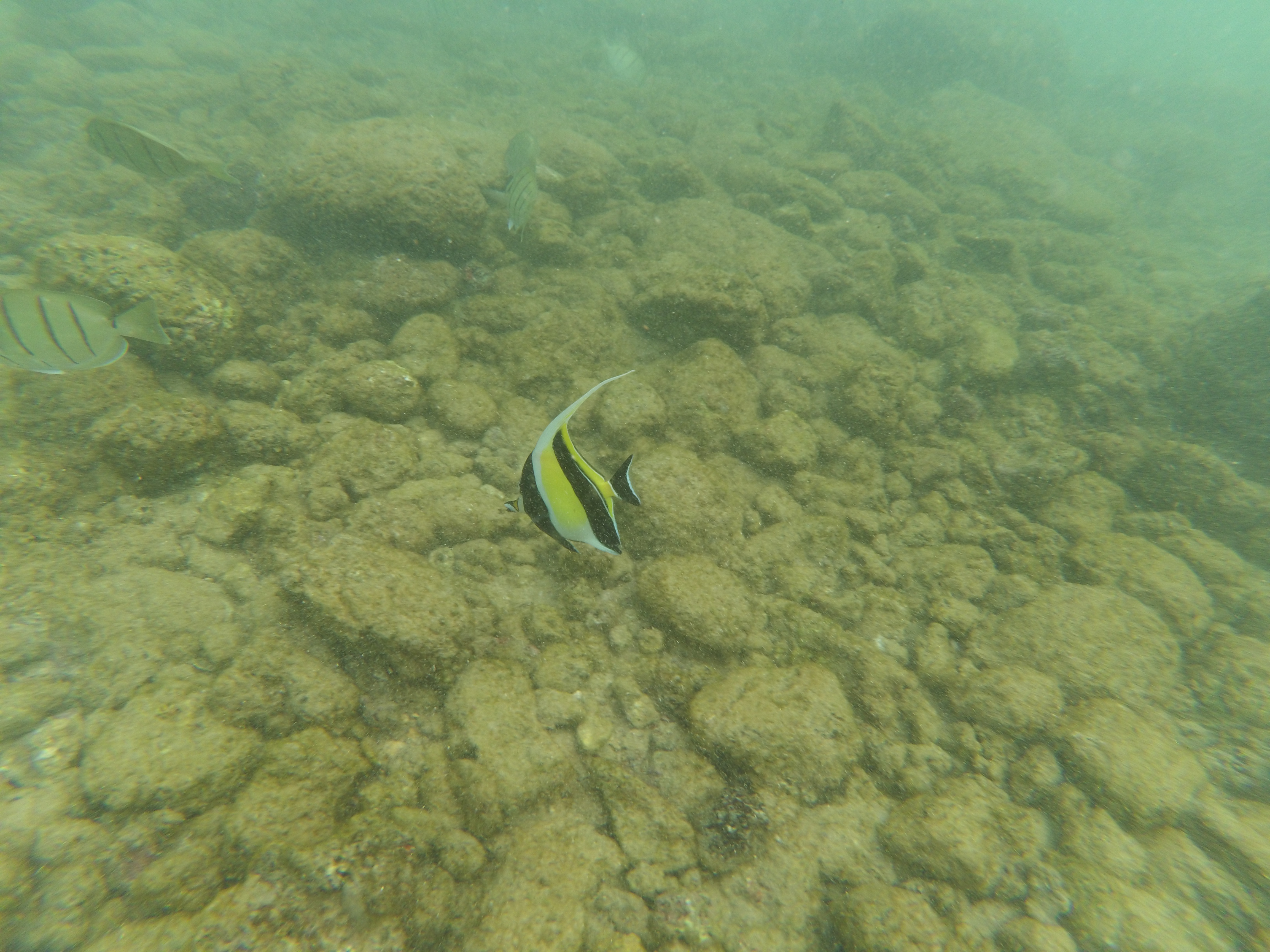 Ein paar Meter weiter den Strand hinunter – die Natur hat das feinsäuberlich aufgeteilt – begann das Riff und damit das Revier unzähliger bunter Fische. Also beim Verleih gegenüber fix ein paar Schnorchelausrüstungen besorgt und ab in die Fluten.