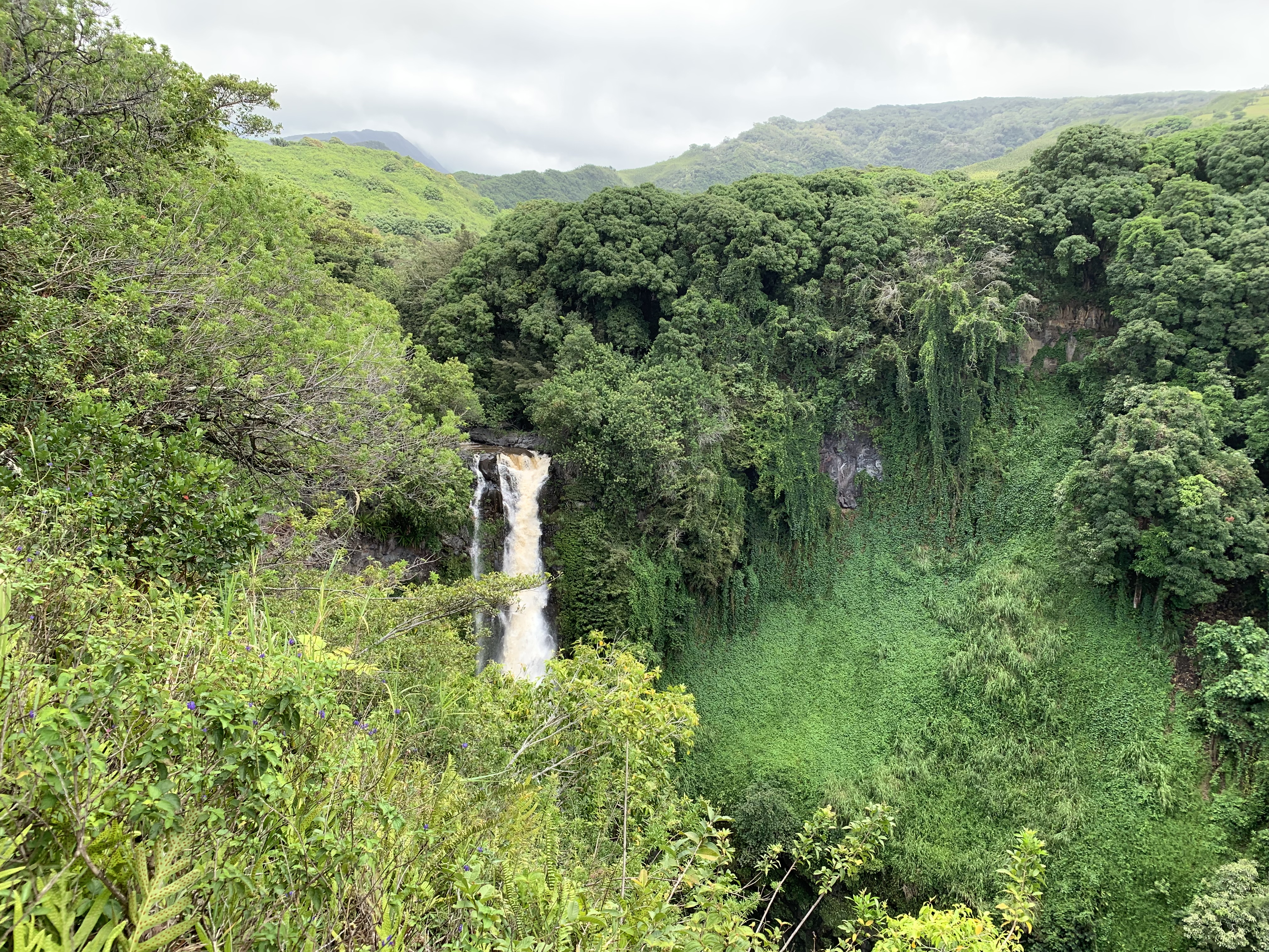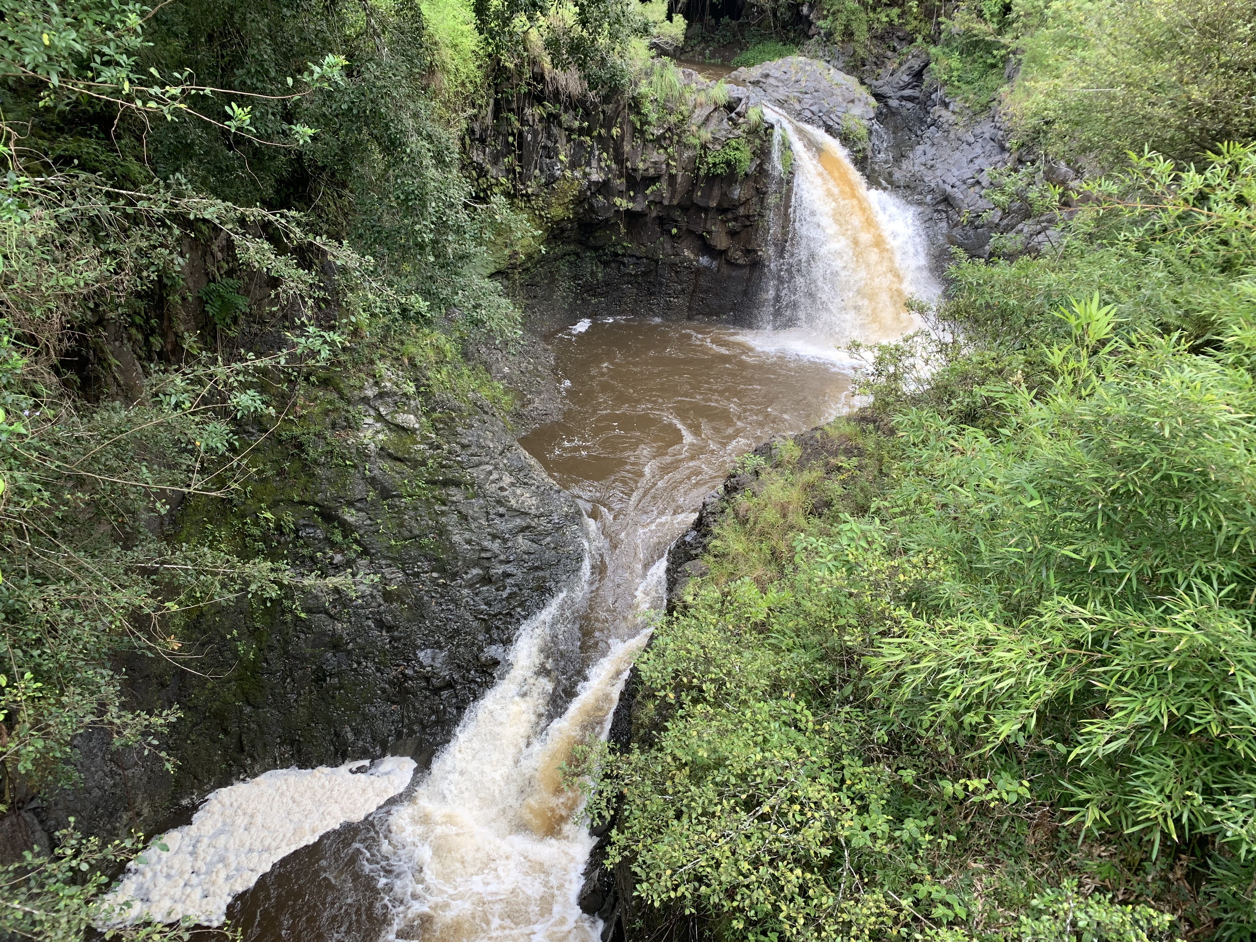 Bevor sich die Landschaft um uns herum grundlegend verändert, machen wir noch einen Stopp an einer DER Attraktionen von Südostmaui: ‚Ohe’o Gulch. Hierbei handelt es sich um eine Reihe von Wasserfällen mit mehreren Pools dazwischen, in denen man bei guten Bedingungen auch Schwimmen kann. Letzte Nacht hindurch hatte es heftig und anhaltend geregnet. Zum einen war daher das Schwimmen in den Pools untersagt und zum zweiten hatten sich die Wassermengen, die die Wasserfälle hinunterkamen deutlich vergrößert. Auch war das Wasser dadurch nicht klar, wie wir es sonst bei allen Wasserfällen bisher gesehen hatten sondern durch den mitgeführten Schlamm eher bräunlich.