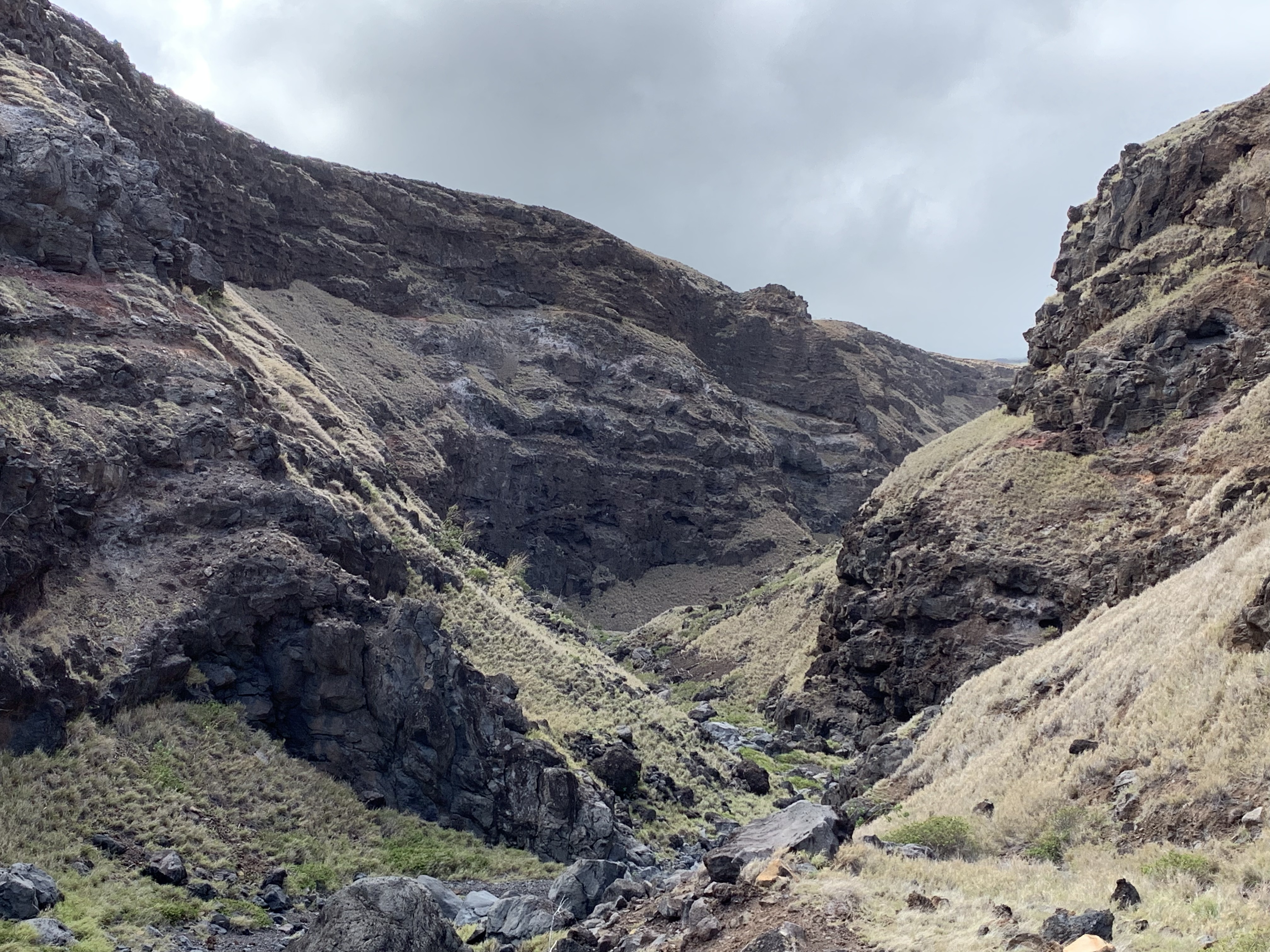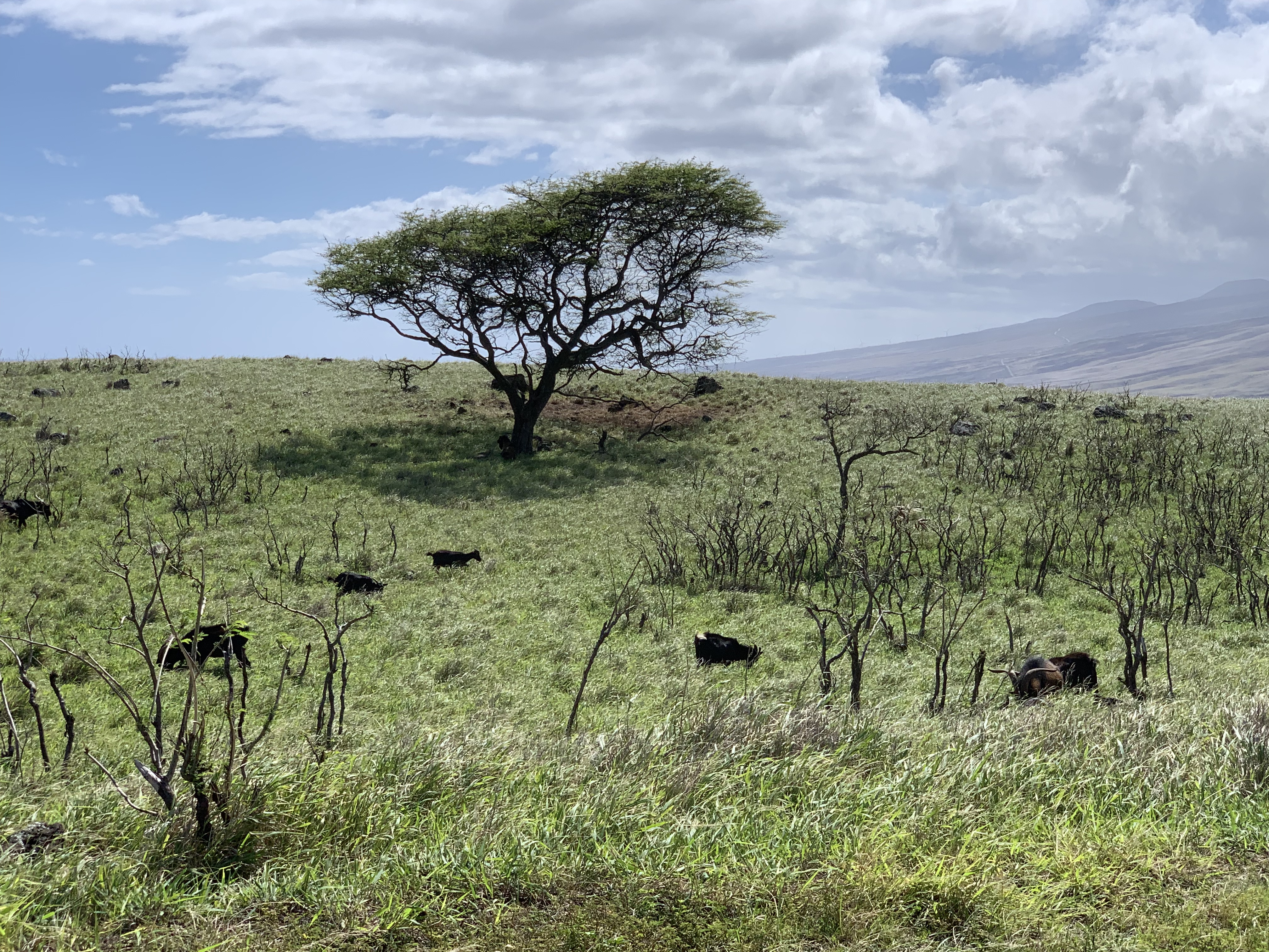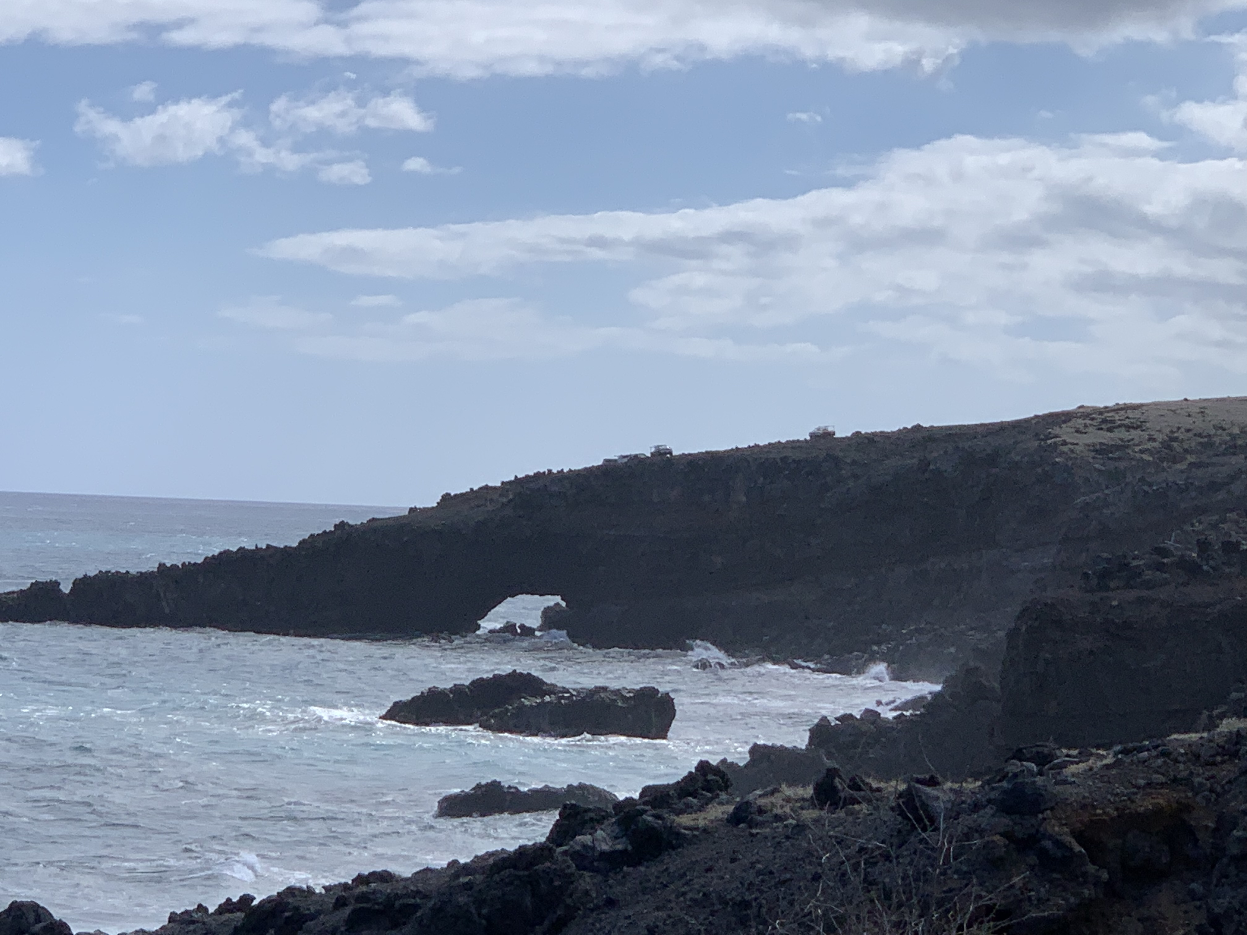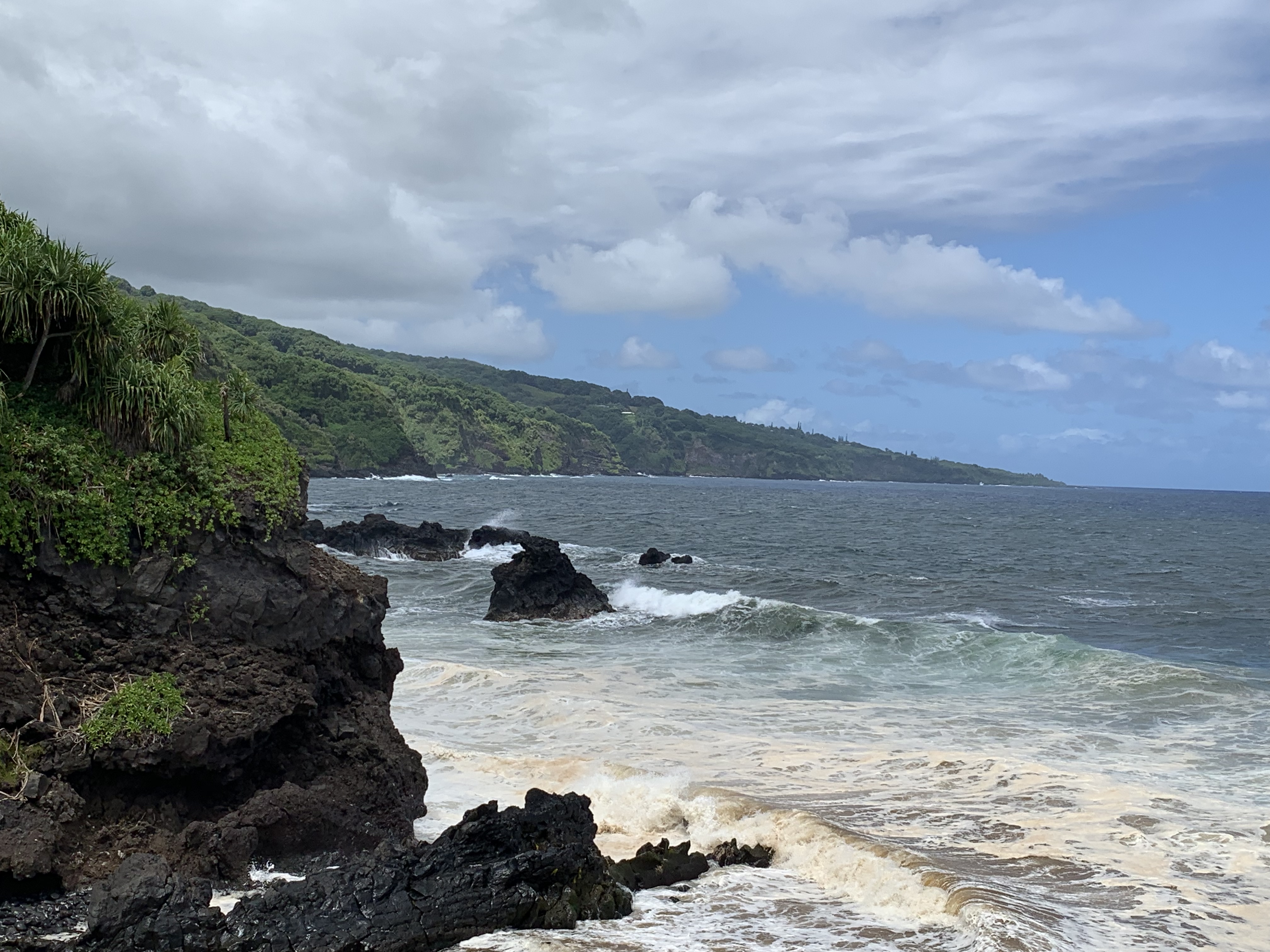 Nur wenige Meilen nach ‚Ohe’o Gulch und Pīpīwai endet plötzlich der Regenwald entlang der Straße und macht einer offenen, wesentlich trockeneren, sehr windigen Landschaft Platz. Ab und zu ein paar Ziegen, alte Steinmauern als Zeugen der früheren, dichteren Besiedlung durch die Hawaiianischen Ureinwohner, die hier vorwiegend vom Fischfang lebten – eine sehr felsige Landschaft geprägt durch die Lavaflüsse in vergangenen Jahrhunderten.