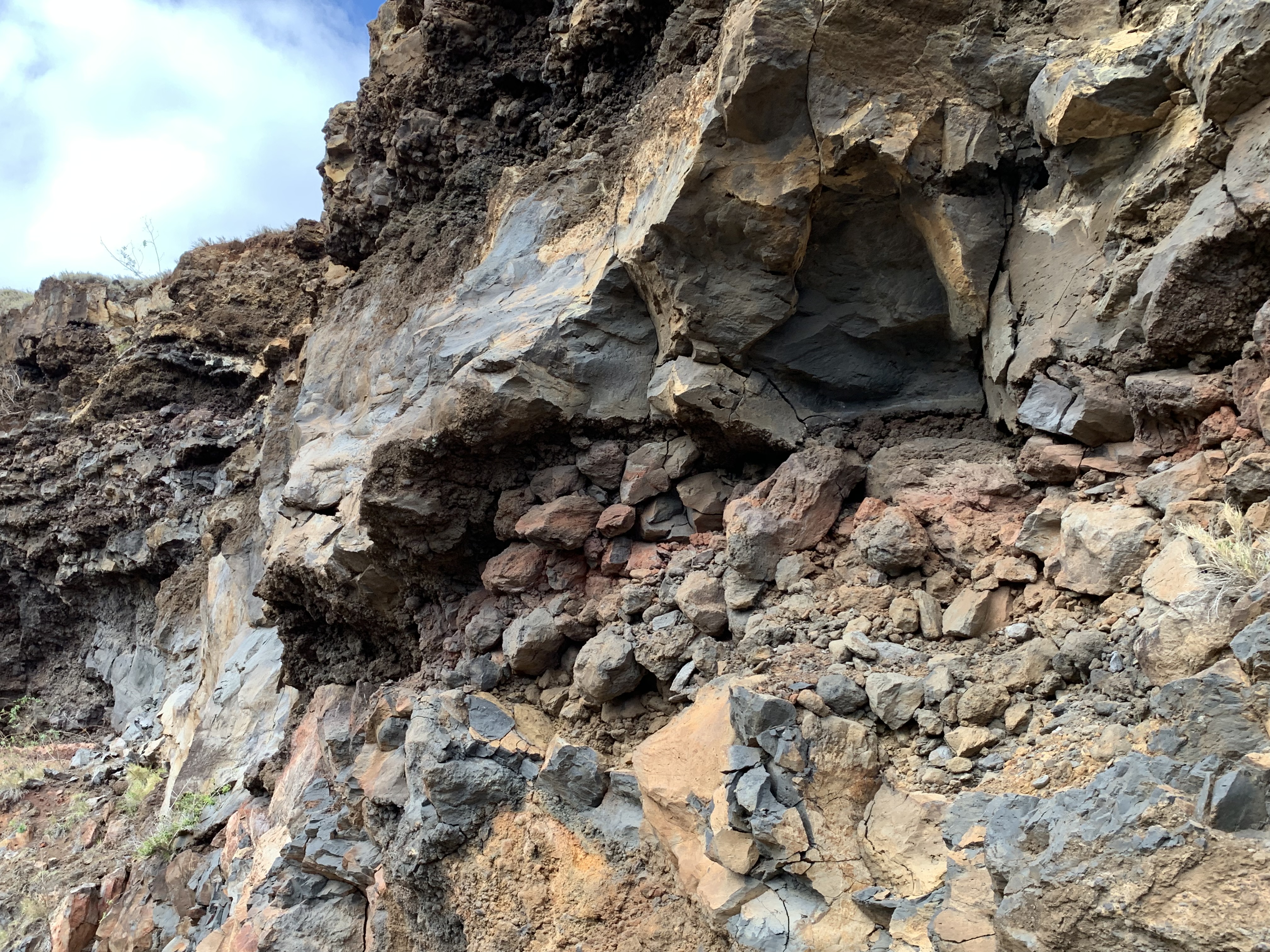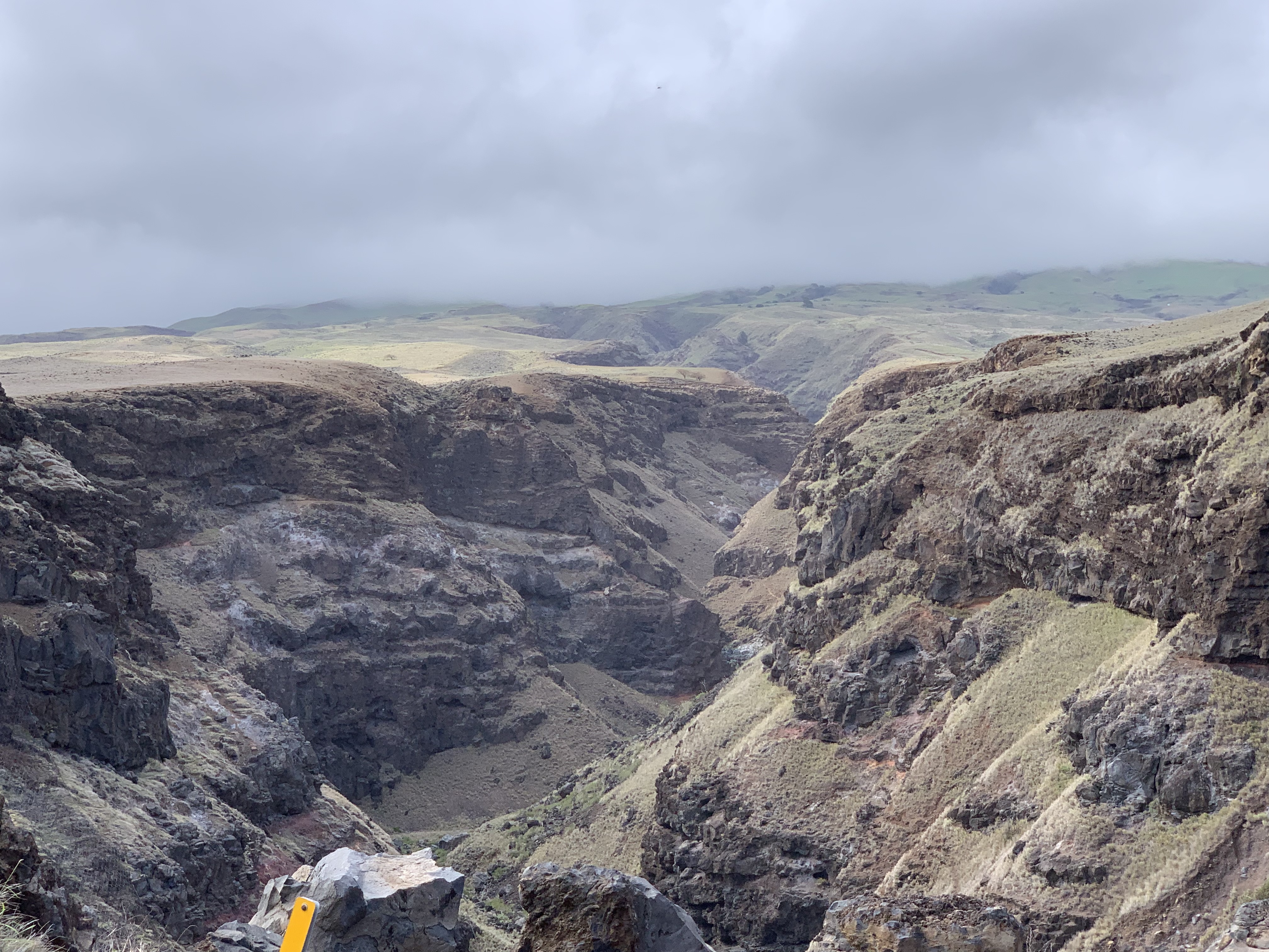 Und ab und zu der Blick über den Pazifik zur Rechten oder über durch Lavaströme geformte Schluchten zur Linken. Ganz anders als das, was wir die letzten Tage an Landschaft gesehen haben, aber nicht weniger beeindruckend.