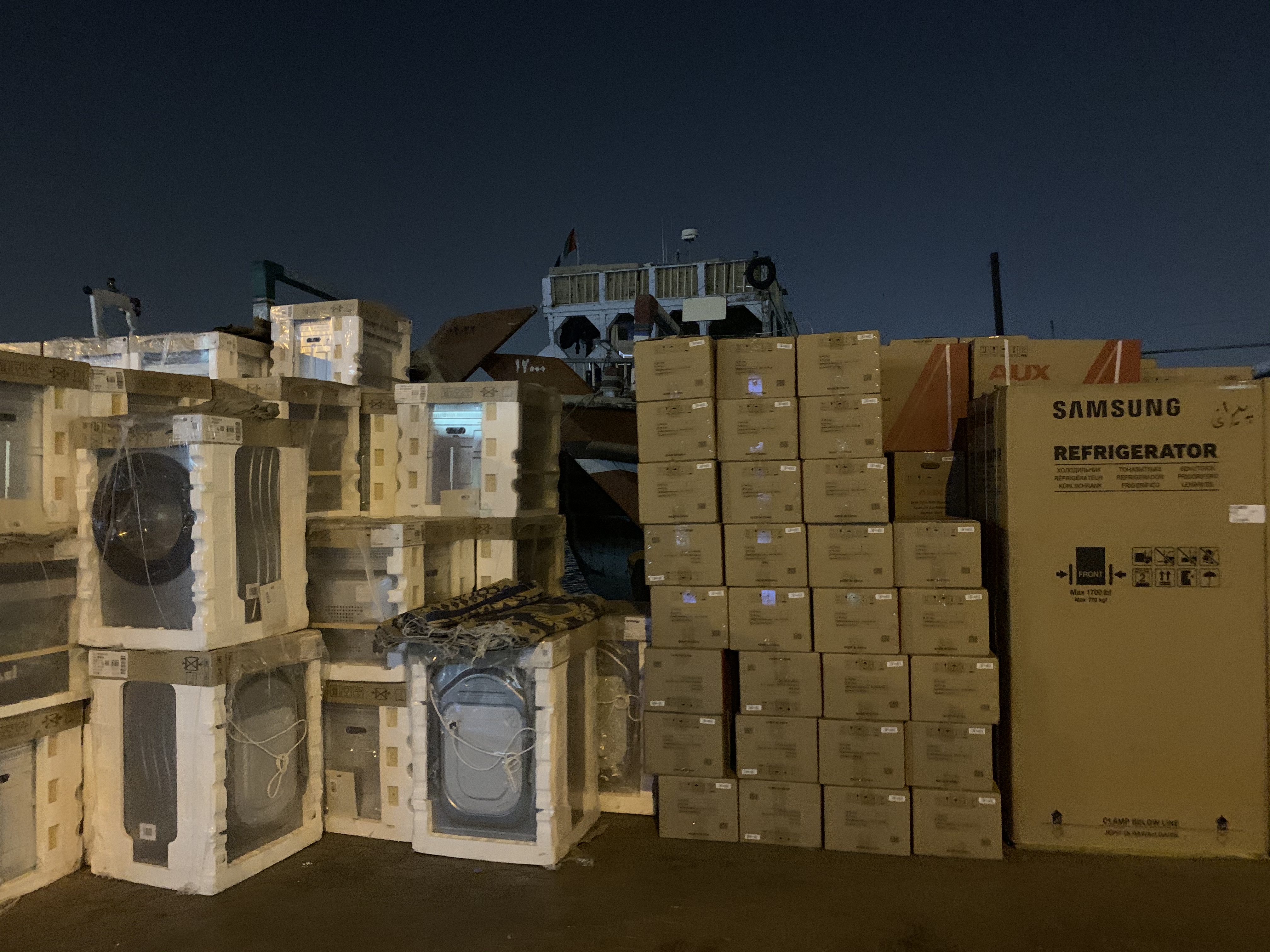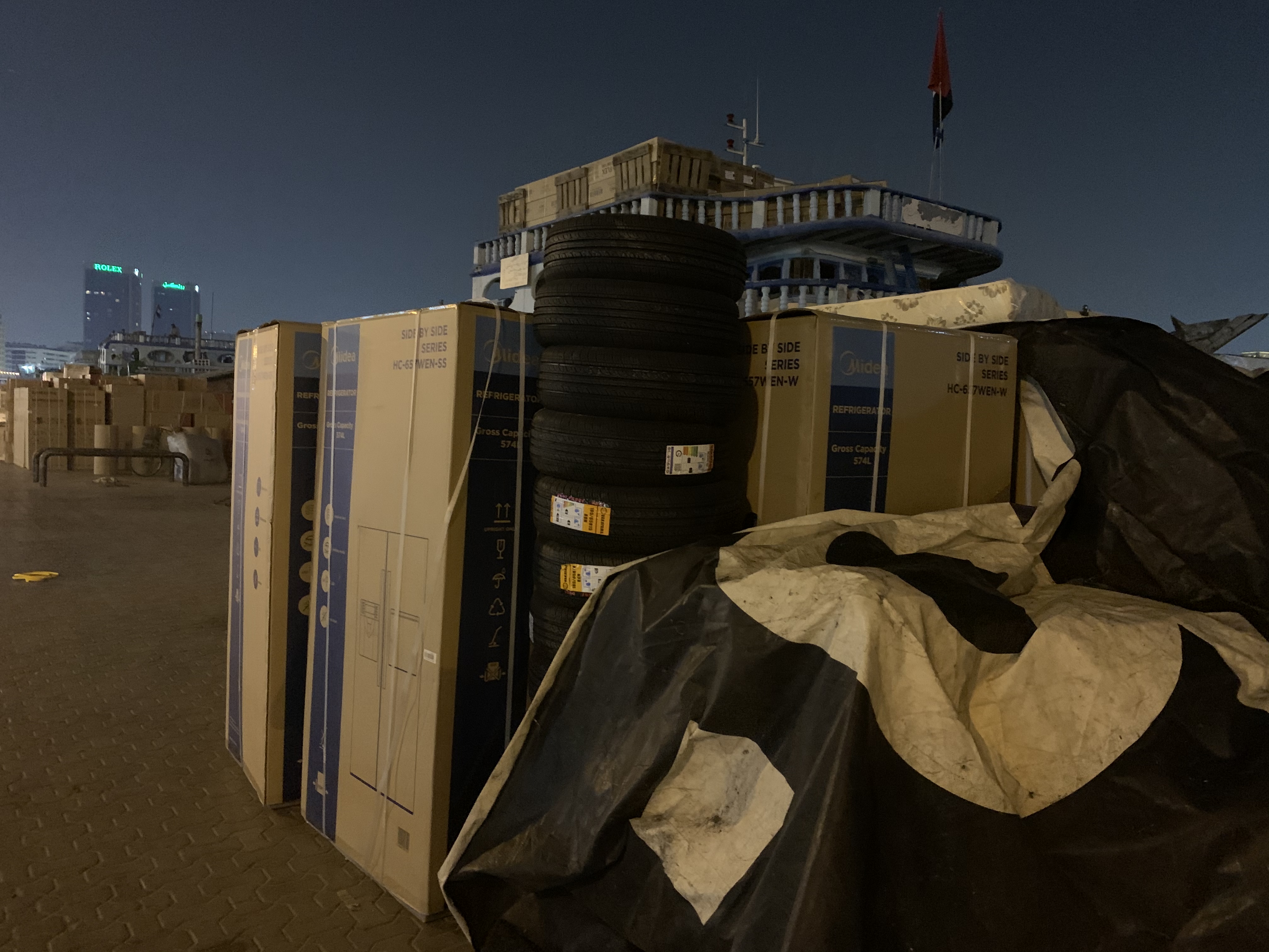 Und sehr spannend, Was da so verladen wird. 😀 Irgendjemand von euch Bedarf an Kühlschränken, Reifen oder Klimaanlagen? Ich wüsste, wo welche stehen… 😋