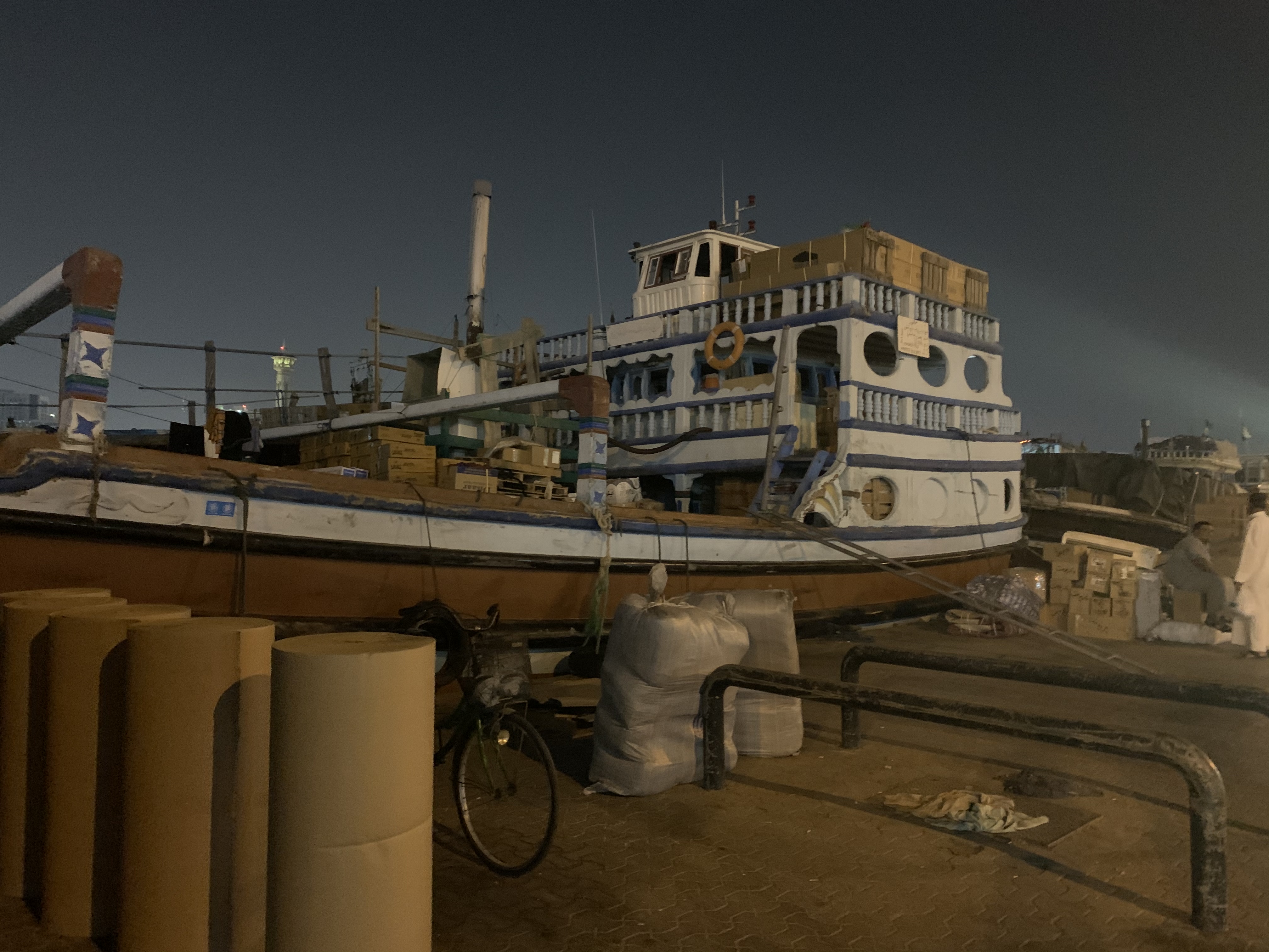 Unser persönliches Highlight von Deira aber fand sich entlang des Ufers des Creek. Vom einstigen Hauptumschlagplatz für Waren aller Art ist wegen der zwei modernen großen Häfen von Dubai, die mittlerweile entstanden sind, nicht mehr viel übrig geblieben. Aber die eine oder andere Ware wird hier noch verladen und verschifft, auf Booten, denen man gar nicht unbedingt zutrauen würde, dass sie den Weg den persischen Golf hinunter tatsächlich noch schaffen.