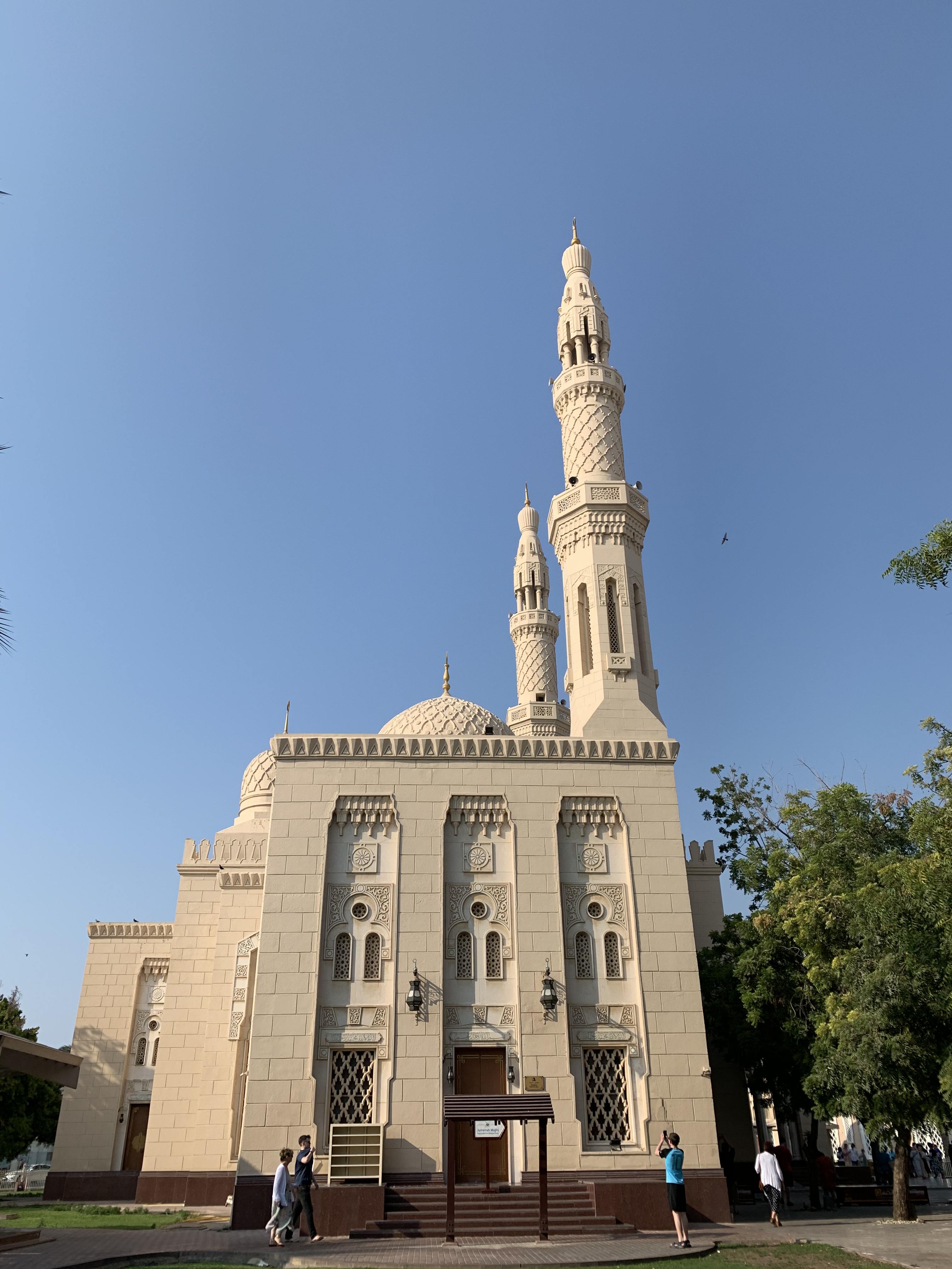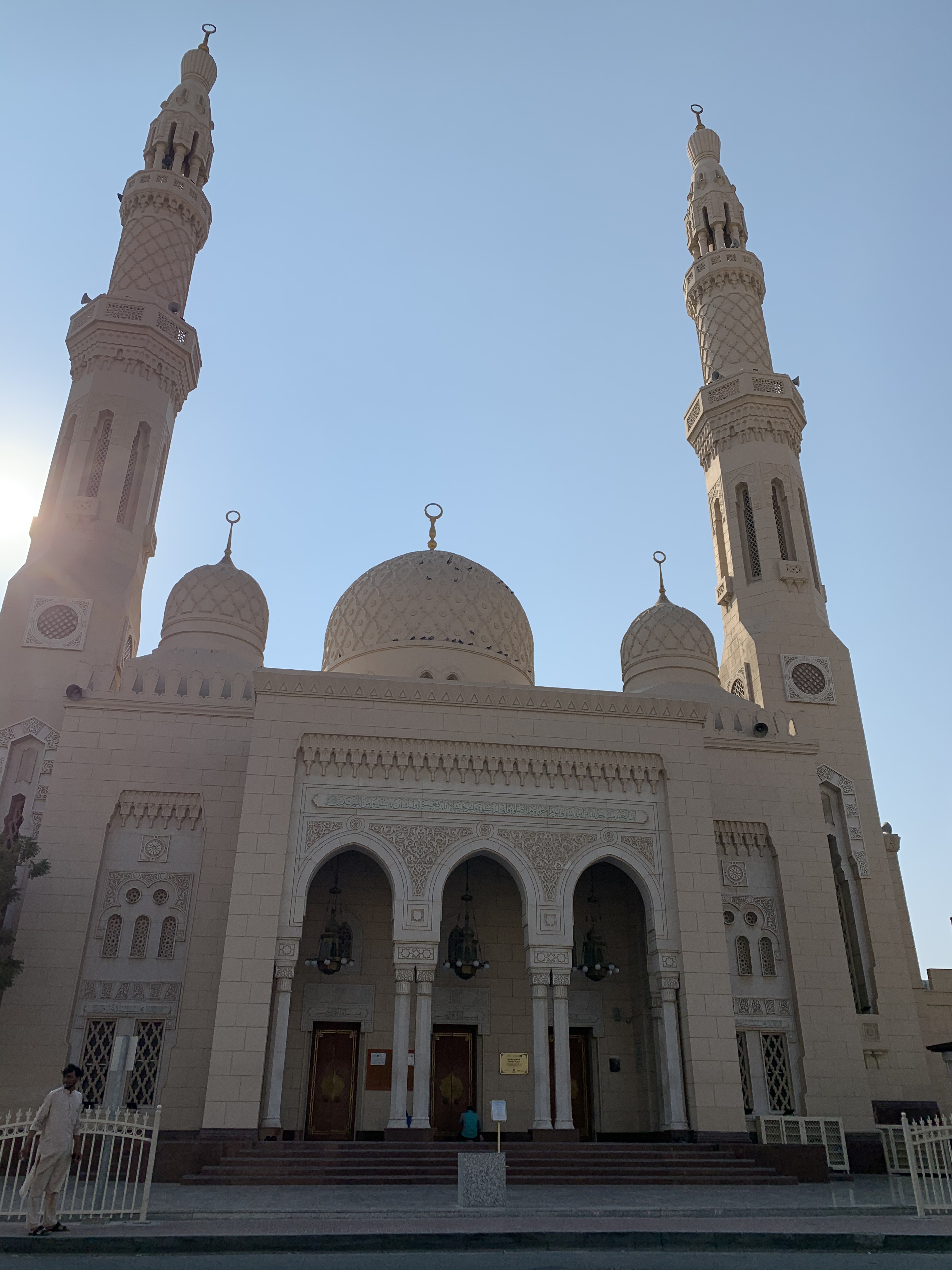 Zwei ganz besondere Erlebnisse gab es heute für uns. Das erste war ein Besuch in der Jumeira Moschee – eine der nur zwei Moscheen in Dubai, die auch Nichtgläubigen zugänglich sind. Die Moschee kann nur im Rahmen einer Führung und nur zu zwei festen Zeiten am Tag (außer Freitags) besucht werden. Und es ist eine der wenigen Moscheen, die man in Dubai fotografieren darf – von außen und von innen.