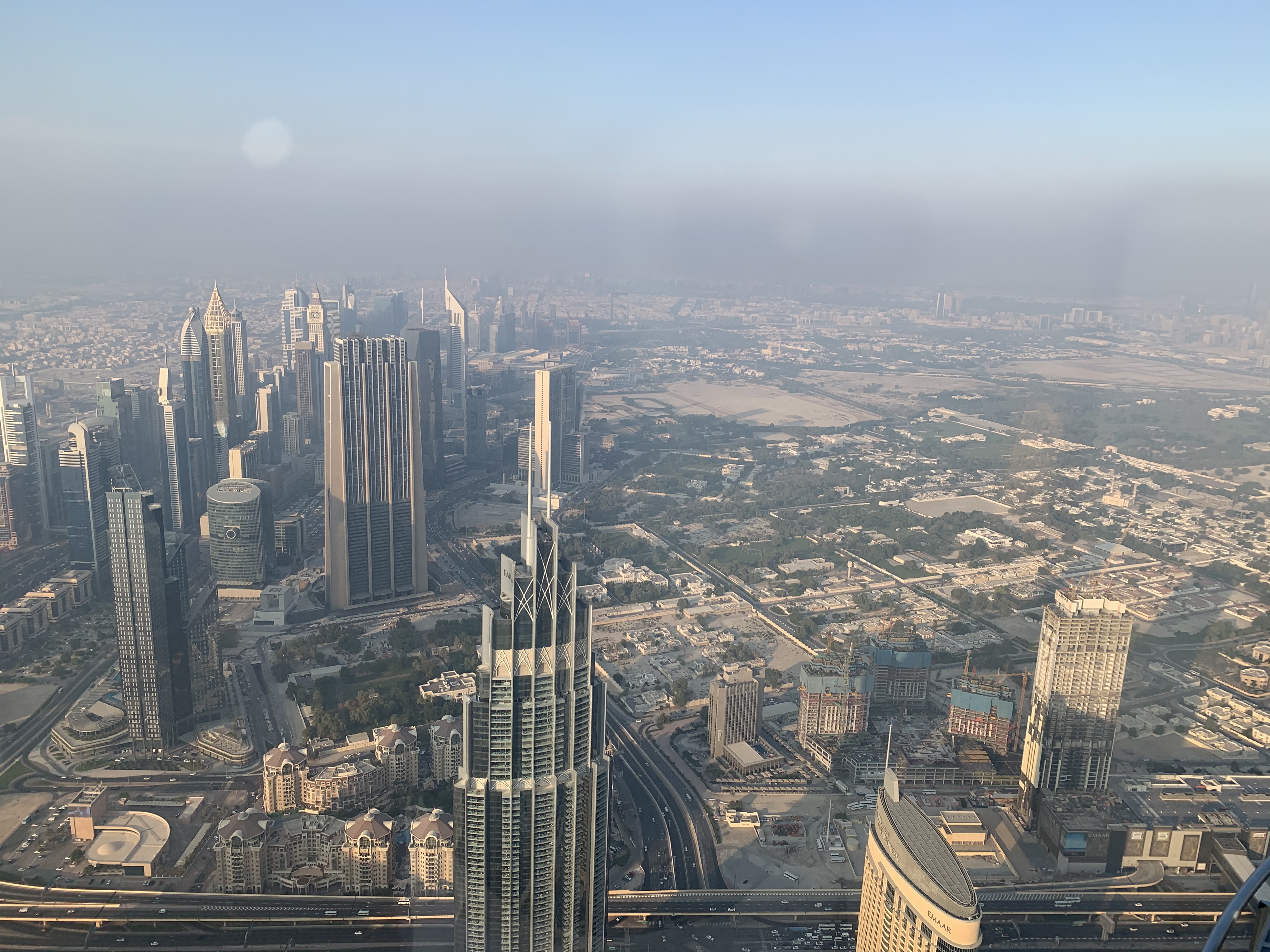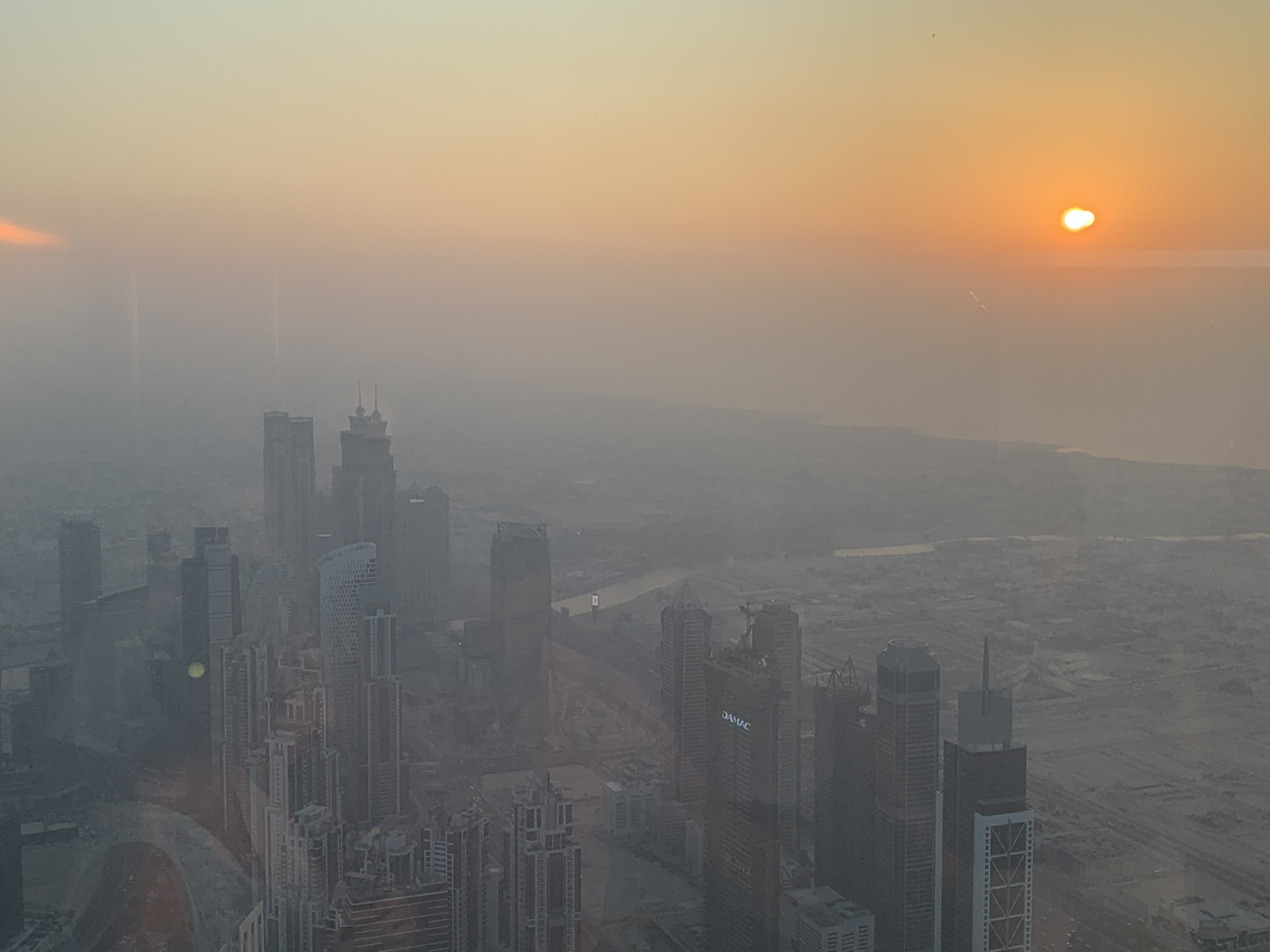 Das zweite Erlebnis des Tages war unser Besuch im Burj Khalifa. Die Tickets müssen im Voraus und für einen genauen Timeslot reserviert werden. Zwischen 16:00 und 18:00 Uhr sind die Tickets ein wenig teurer als für den Rest des Tages, aber der Unterschied ist nicht sehr groß und der Aufpreis lohnt sich. So sieht man Dubai von oben – bei Tag, beim Sonnenuntergang und bei Nacht. Einfach nur spektakulär. Auch wenn die Luft leider ein wenig nebelig war.