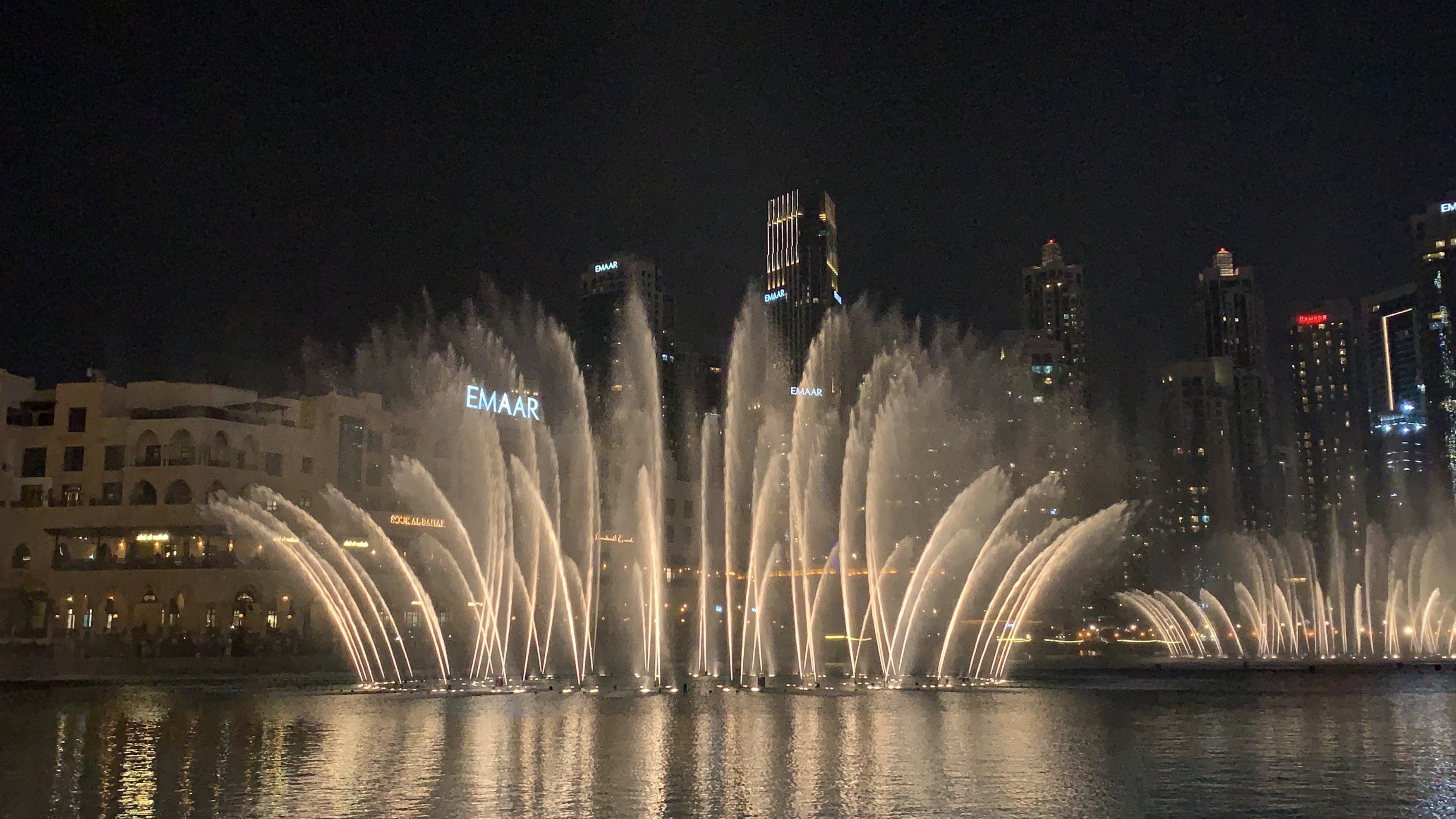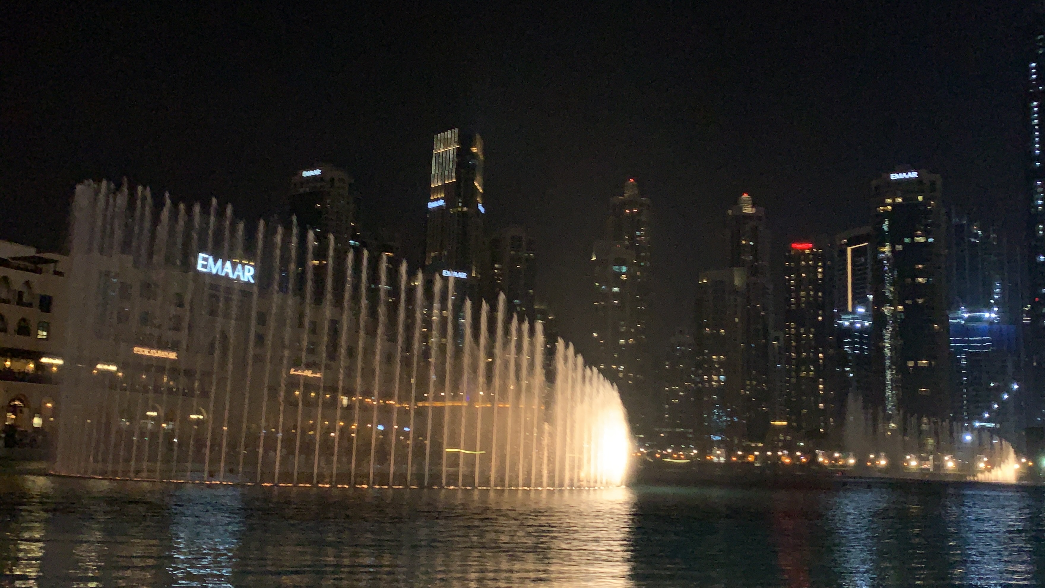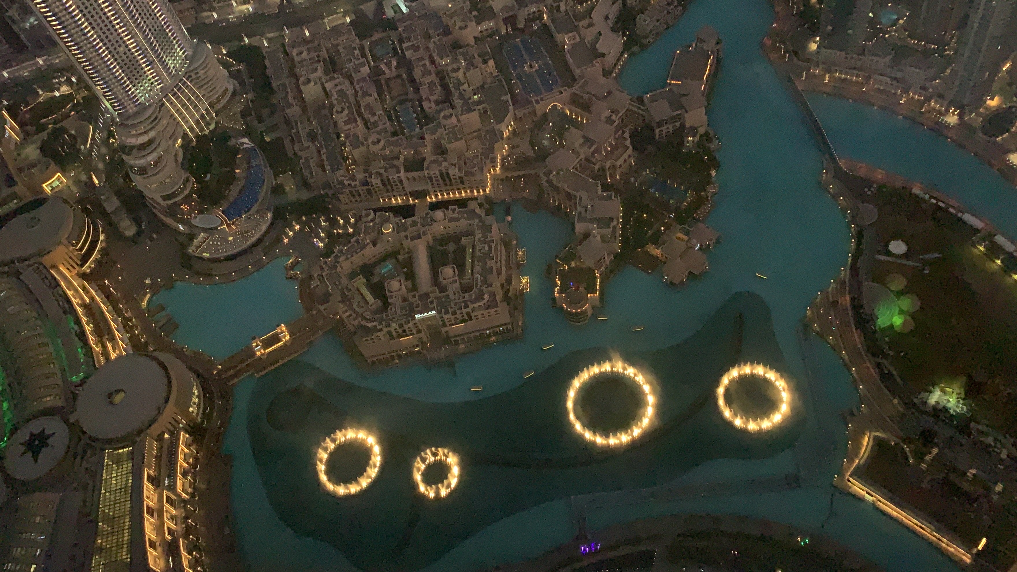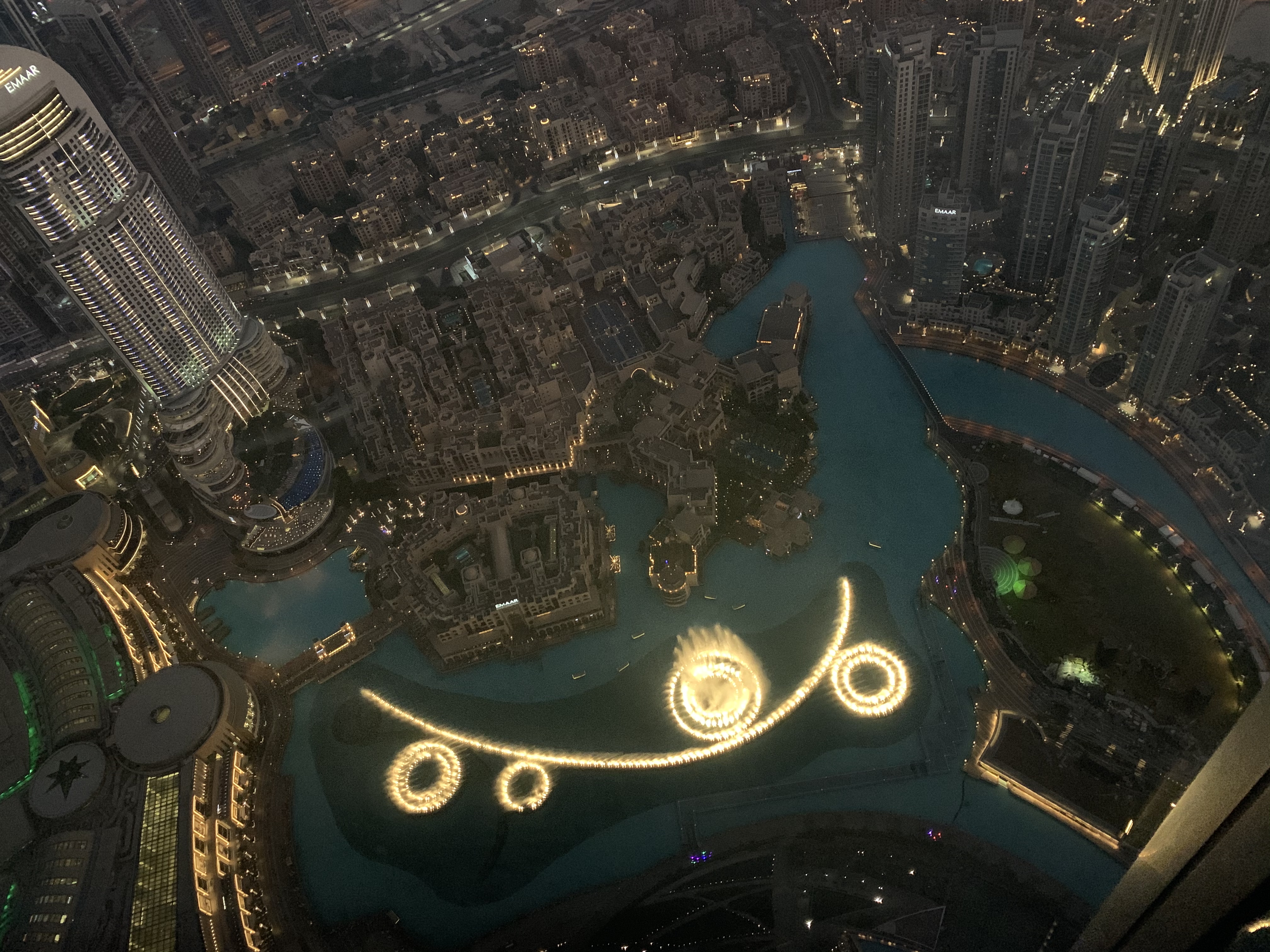 Mein absolutes Highlight war es, die Wasserspiele der Springbrunnen vor dem Burj Khalifa im Dunklen von oben zu sehen. Selbst ohne Musik, die man im Turm nicht hören kann, ein beeindruckendes und wunderschönes Spektakel.