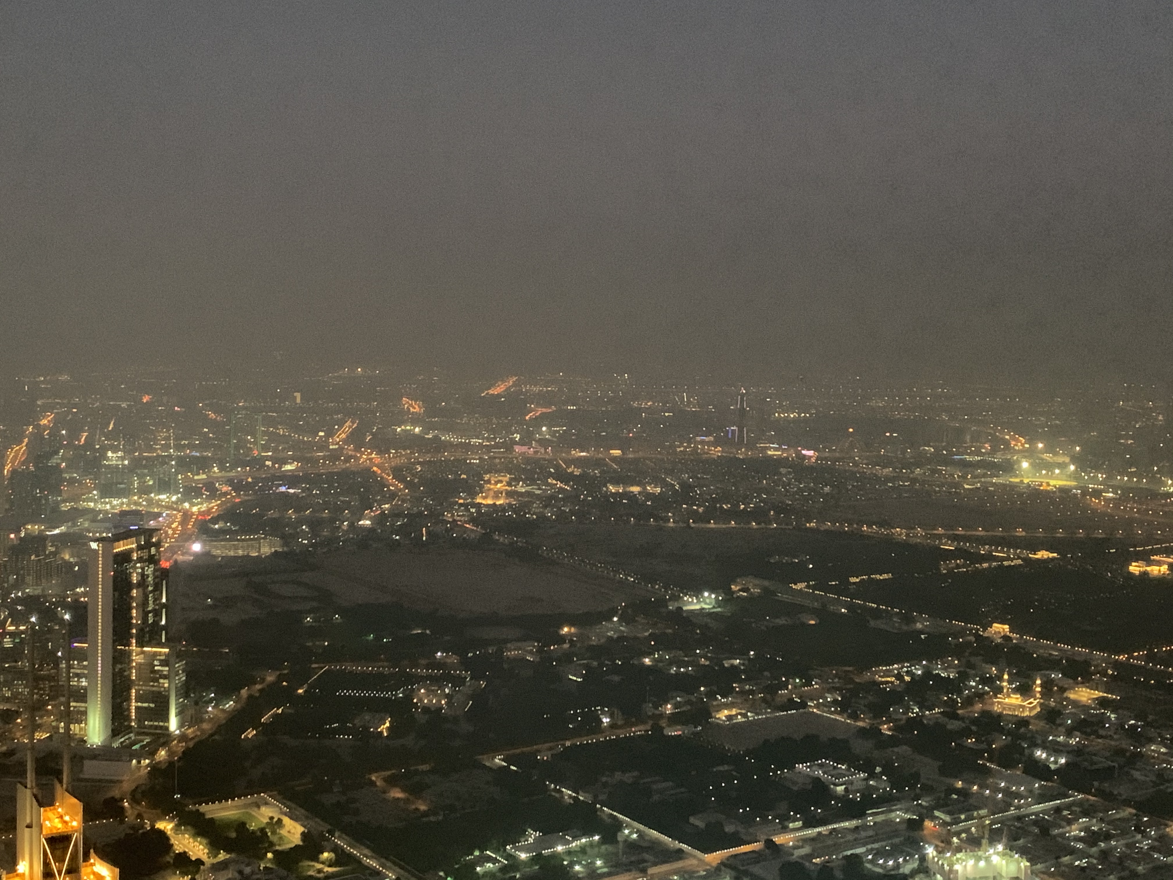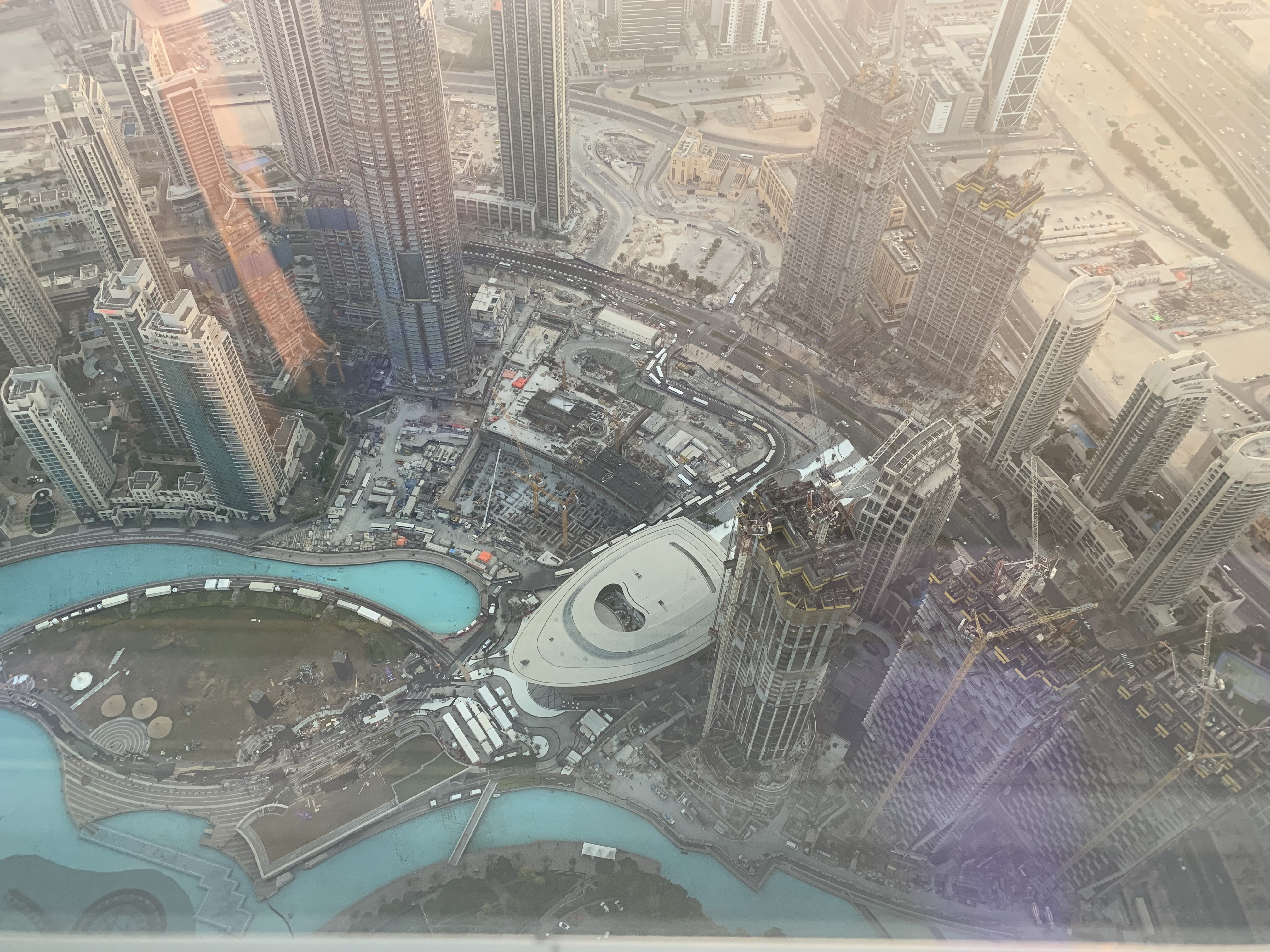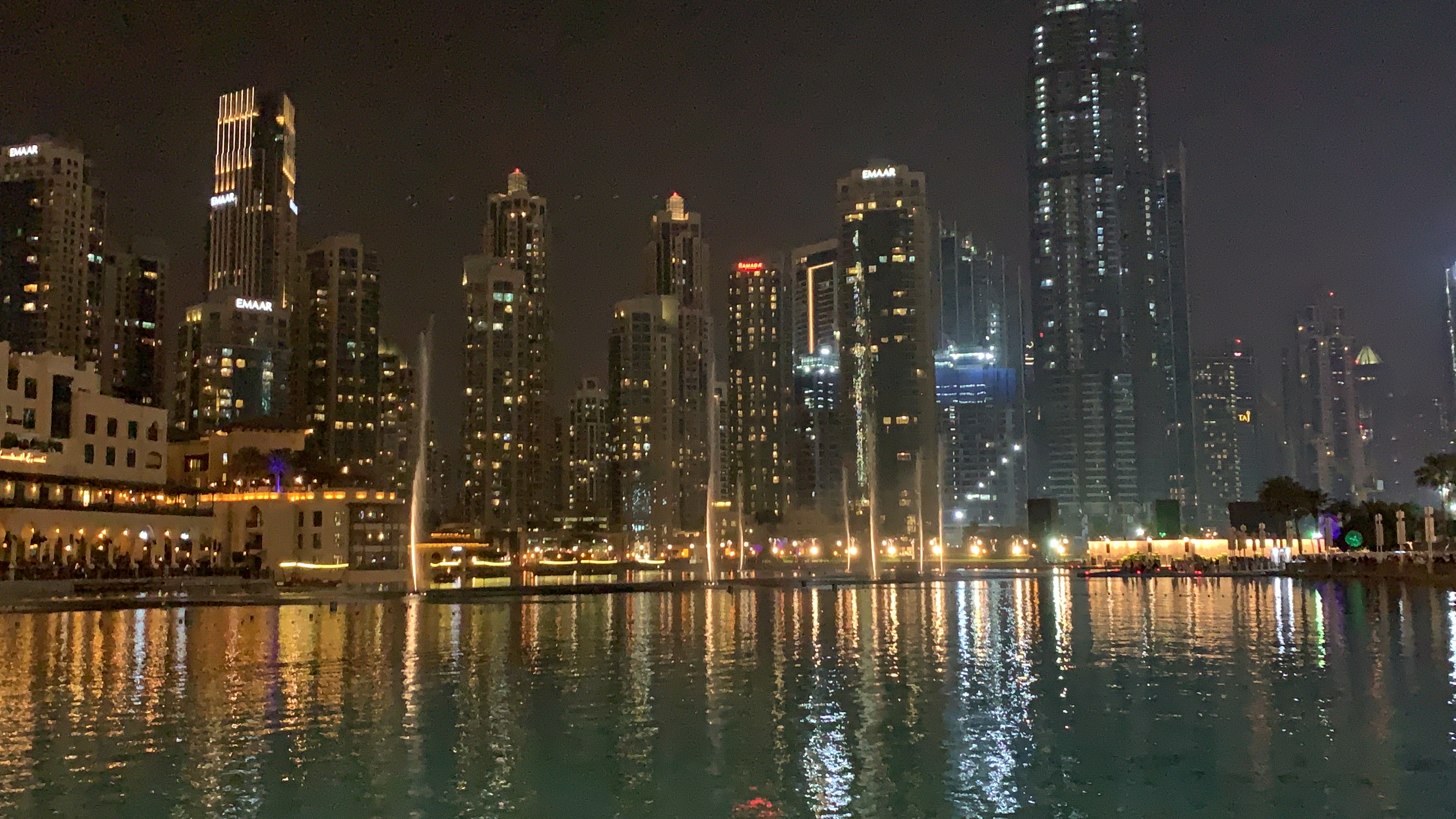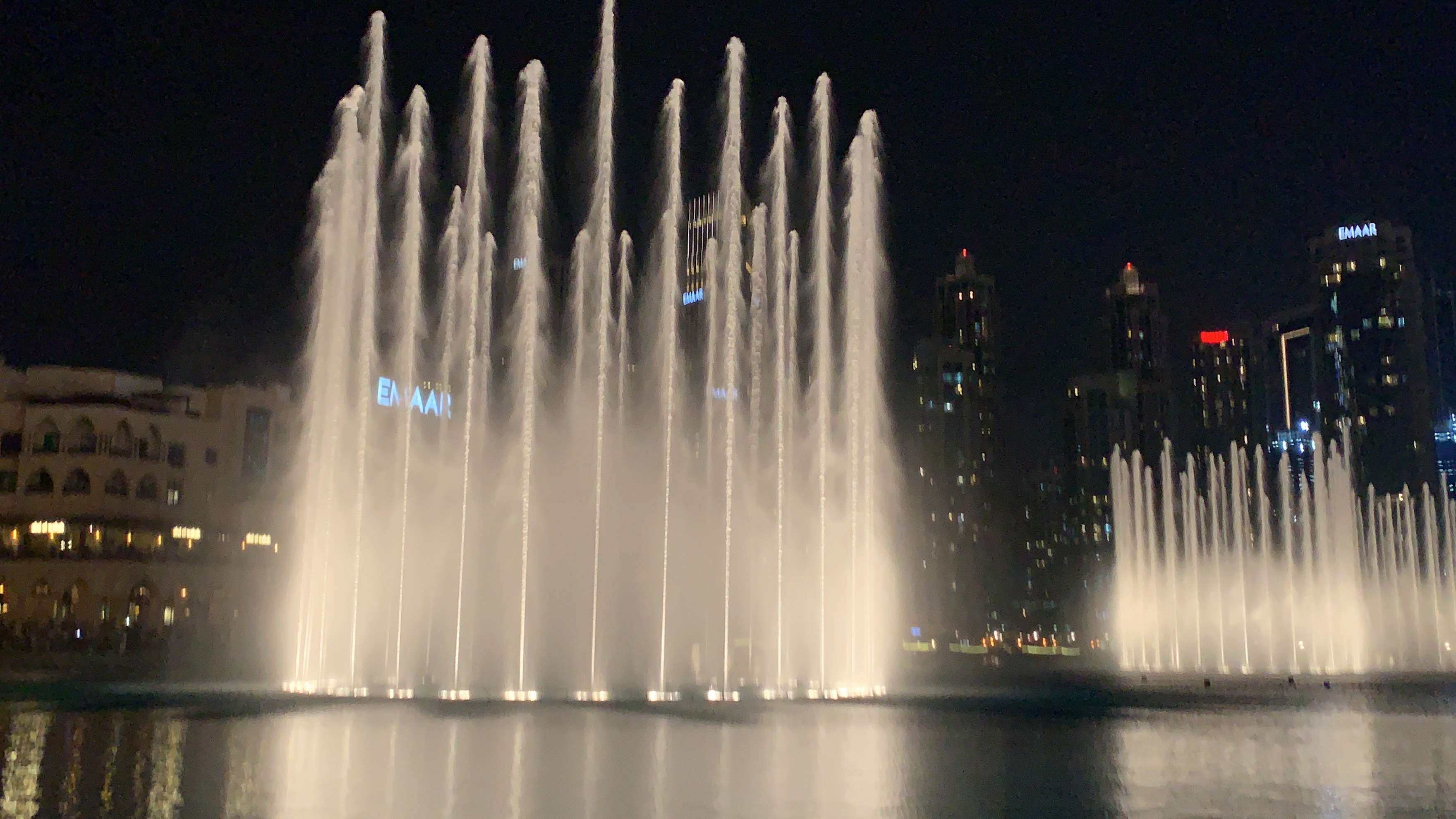 Mein absolutes Highlight war es, die Wasserspiele der Springbrunnen vor dem Burj Khalifa im Dunklen von oben zu sehen. Selbst ohne Musik, die man im Turm nicht hören kann, ein beeindruckendes und wunderschönes Spektakel.