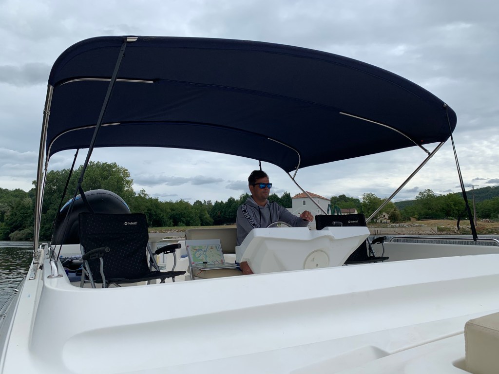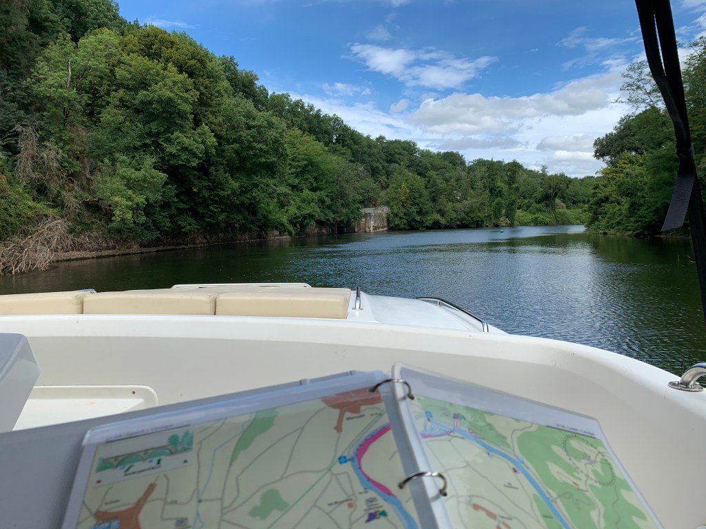 Die Rolle des Kapitäns hat natürlich Vova übernommen. Mit Booten kennt er sich aus – das muss man neidlos anerkennen. Mir wurde die Aufgabe des Navigators übertragen. Ein bisschen wie der Beifahrer damals im Auto, mit der Karte auf dem Schoß. Diese Aufgabe hatte ich im Canal du Midi auch schon. Allerdings ist der Canal an allen Stellen gleich tief und große Überraschungen gibt es unterwegs eigentlich nicht. Meine einzige Aufgabe bestand damals also im Grunde darin, zu entscheiden, wo wir anlegen würden und Bescheid zu geben, wann wir kurz davor waren, an einer Schleuse anzukommen. Mit einem natürlichen Gewässer wie dem Lot stellt sich das Ganze ein wenig anders dar. Hier muss man tatsächlich darauf achten, in der auf der Karte angegebenen Fahrrinne zu bleiben, flache Stellen zu umschiffen und an Brücken den richtigen Brückenbogen für die Durchfahrt auszuwählen. Ganz schön viel Verantwortung für jemanden, der die Karte immer in Fahrtrichtung drehen muss, um zu wissen, ob die nächste Kurve nach links oder nach rechts geht. Aber zum Glück haben alle vier Jungs ja immer noch ein Auge drauf. 😀