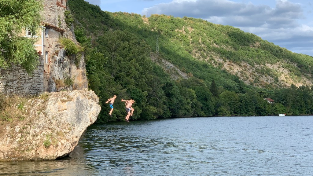 Der größte Vorteil, den der Lot gegenüber jedem Kanal in Frankreich hat: man kann in ihm schwimmen. Das Wasser ist herrlich klar und sauber. Angeblich – wie mir eine Schleusenbekanntschaft mitteilte – hat der Lot das sauberste Wasser aller französischen Flüsse. Und dazu kommen noch unschlagbare Gelegenheiten an allen möglichen Stellen ins Wasser zu springen. Und wenn es mal keine in der Nähe geben sollte, dann eben vom Boot aus. 🙂