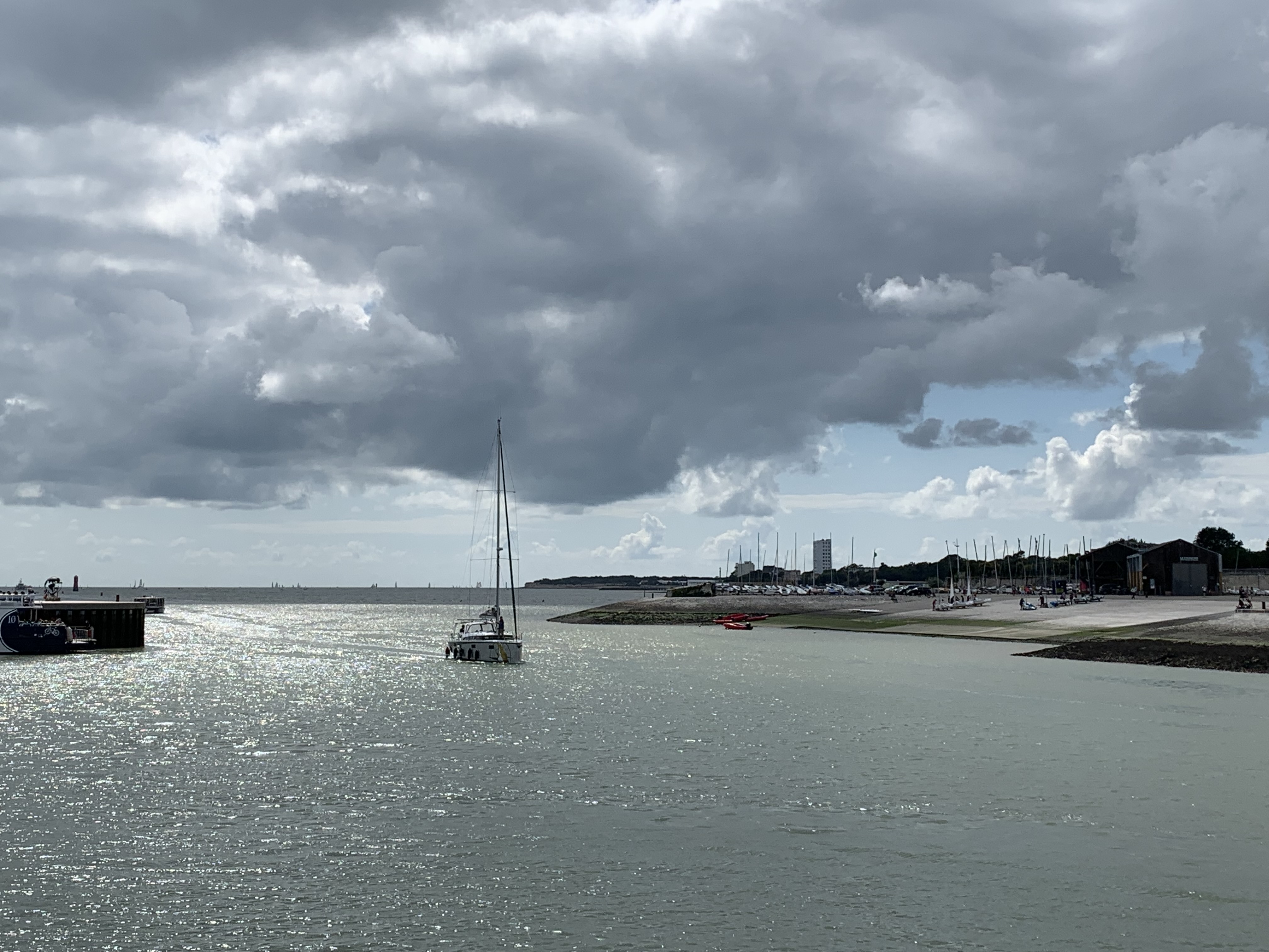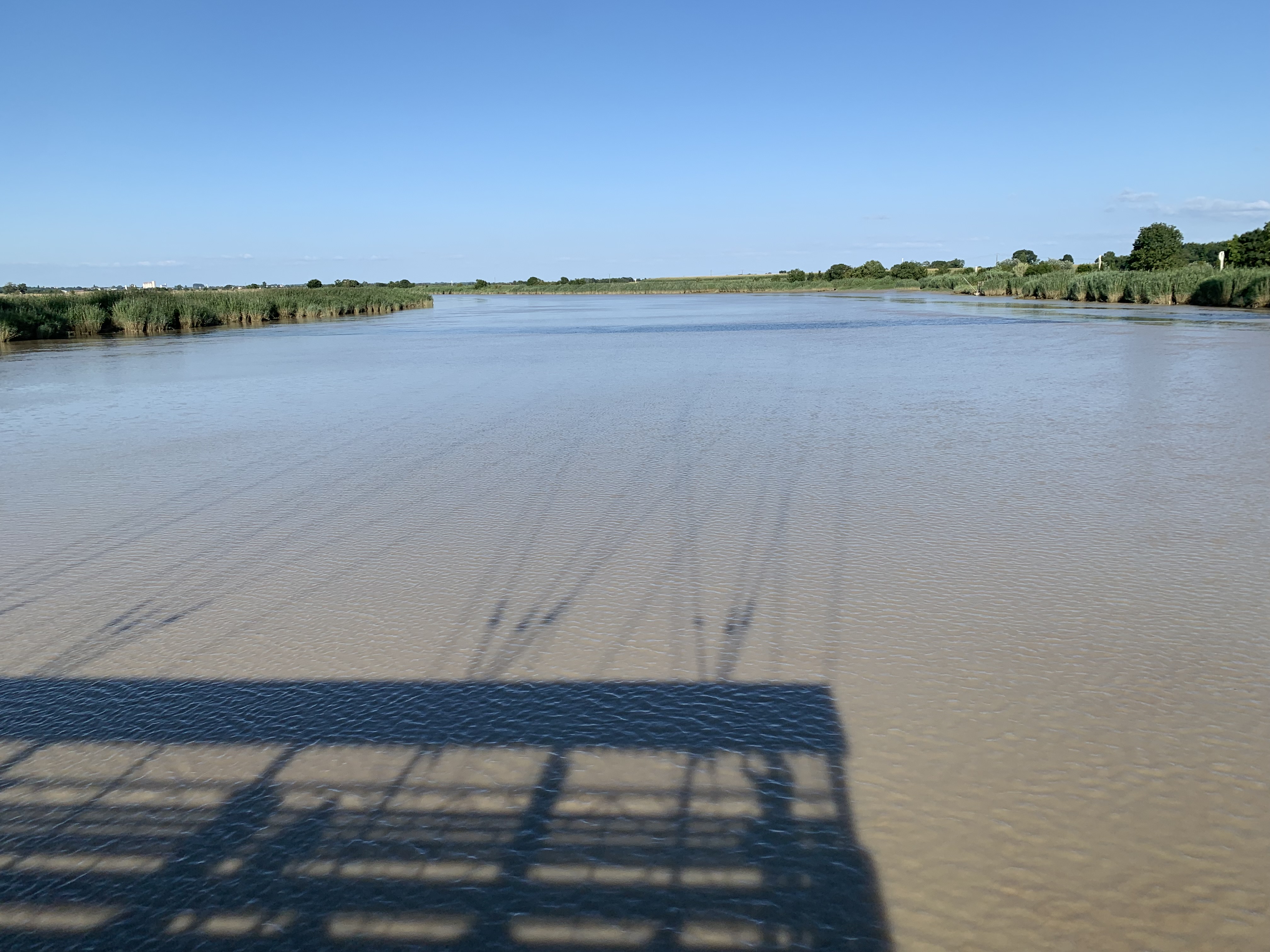 Die Überfahrt dauert nur wenige Minuten und da wir auch nur für die Brücke (und einen kleinen Spaziergang durch die Altstadt in Verbindung mit einem leckeren Abendessen) nach Rochefort gekommen waren, fuhren wir gleich einmal hin und zurück. Während der Rückfahrt machte uns ein Ausflugskatamaran noch die Freude, den Fluss herab zu kommen, so dass der Kapitän (vielleicht auch weil es die letzte Fahrt des Tages war) noch einen kleinen Zwischenstopp mittig über dem Fluss einlegte. War schon lustig dieses ‚Über-den-Fluss-schweben‘. 🙂