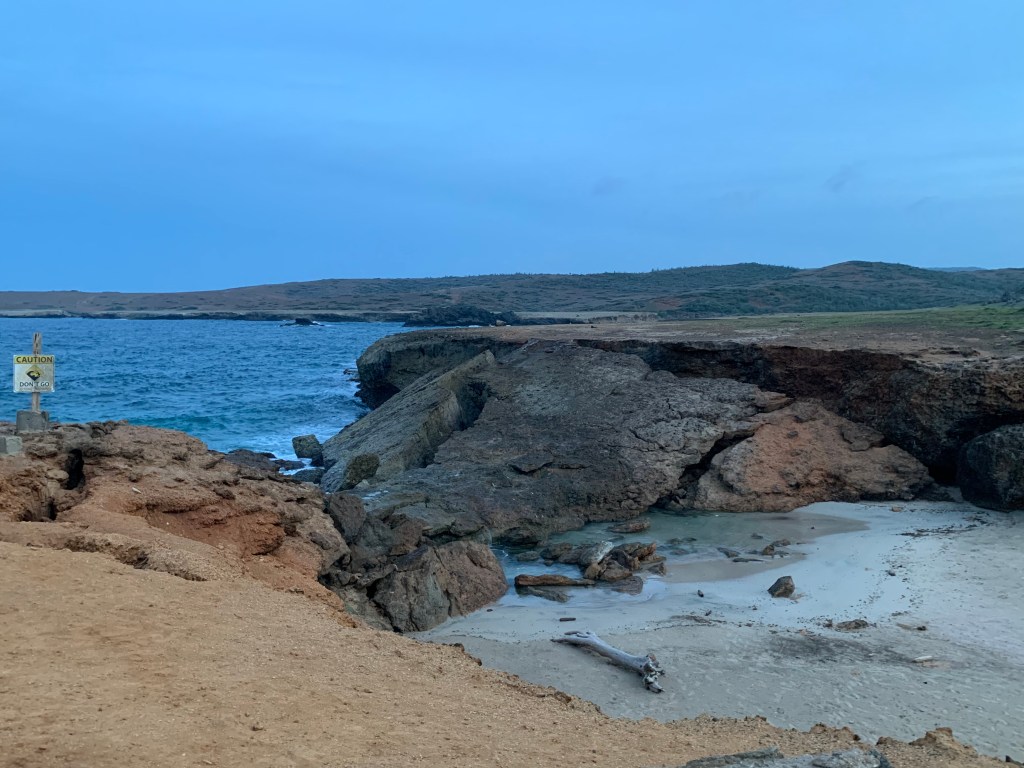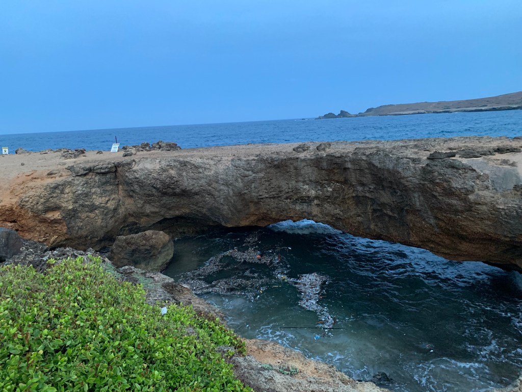 Zum Glück befindet sich in nur kurzer Entfernung zur Goldmühle ein weiteres Natur-Highlight Arubas, die ‚Natural Bridge‘ – eine Steinbrücke über das Meer. Ursprünglich gab es davon sogar zwei, aber 2005 stürzte die größere der beiden zusammen. Die verbliebene ist aber nicht weniger sehenswert und auf jeden Fall einen Abstecher wert. Ist schon jedes Mal wieder beeindruckend, was die Natur so großartiges hervorbringt.
