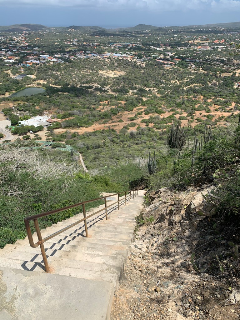 Der bisher mit Abstand anstrengendste kleine Ausflug war der heutige zum Hooiberg (übersetzt in etwa ‚Heuhaufen‘) – mit 165m die zweithöchste Erhebung auf Aruba. Der Hooiberg liegt ziemlich zentral in der Mitte von Aruba, so dass man von oben eine recht gute Rundumsicht über die gesamte Insel hat. Zum „Gipfel“ hinauf führen etwa 600 Steinstufen. (Die Seite des Tourismusbüros spricht von 900, aber wir haben nachgezählt und wissen es besser. :-)) Das wäre an sich keine große Sache, wären es nicht zur hervorragend gewählten Ausflugszeit 12 Uhr mittags etwa 35 Grad gewesen. Wir waren schon nach etwa 50 steilen Stufen völlig fertig. Ich hatte definitiv schon bessere Ideen… Nichtsdestotrotz bekamen wir tatsächlich einen Blick über fast die gesamte Insel geboten – auch wenn dieser angesichts der kargen Landschaft vielleicht etwas weniger spektakulär ausfiel, als wir es nach dem schweißtreibenden Aufstieg erhofft hatten. 😀