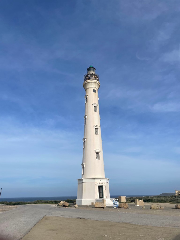 Interessant ist auch die Geschichte zu unserem nächsten Ausflugsziel: dem California lighthouse. Auf Aruba gibt es insgesamt nur drei Leuchttürme. Der California Leuchtturm – ein etwa 30m hoher weißer Turm an der Nordwestspitze der Insel – ist der bekannteste der drei und kann auch besichtigt werden. Benannt ist er nach dem englischen Dampfschiff S.S. California, das 1891 hier vor der Küste gesunken ist. (Falls der Reiseführer euch weismachen möchte, dass dieses Schiff in irgendeiner Verbindung zur Titanic steht… dem ist nicht so. Das Schiff, was angeblich der Titanic nicht zu Hilfe gekommen ist, war die Californian – ein anderes britisches Handelsschiff. Bis die Titanic 1912 auf Jungfernfahrt ging, lag die California bereits mehr als 20 Jahre auf dem Meeresgrund vor der Küste von Aruba.)