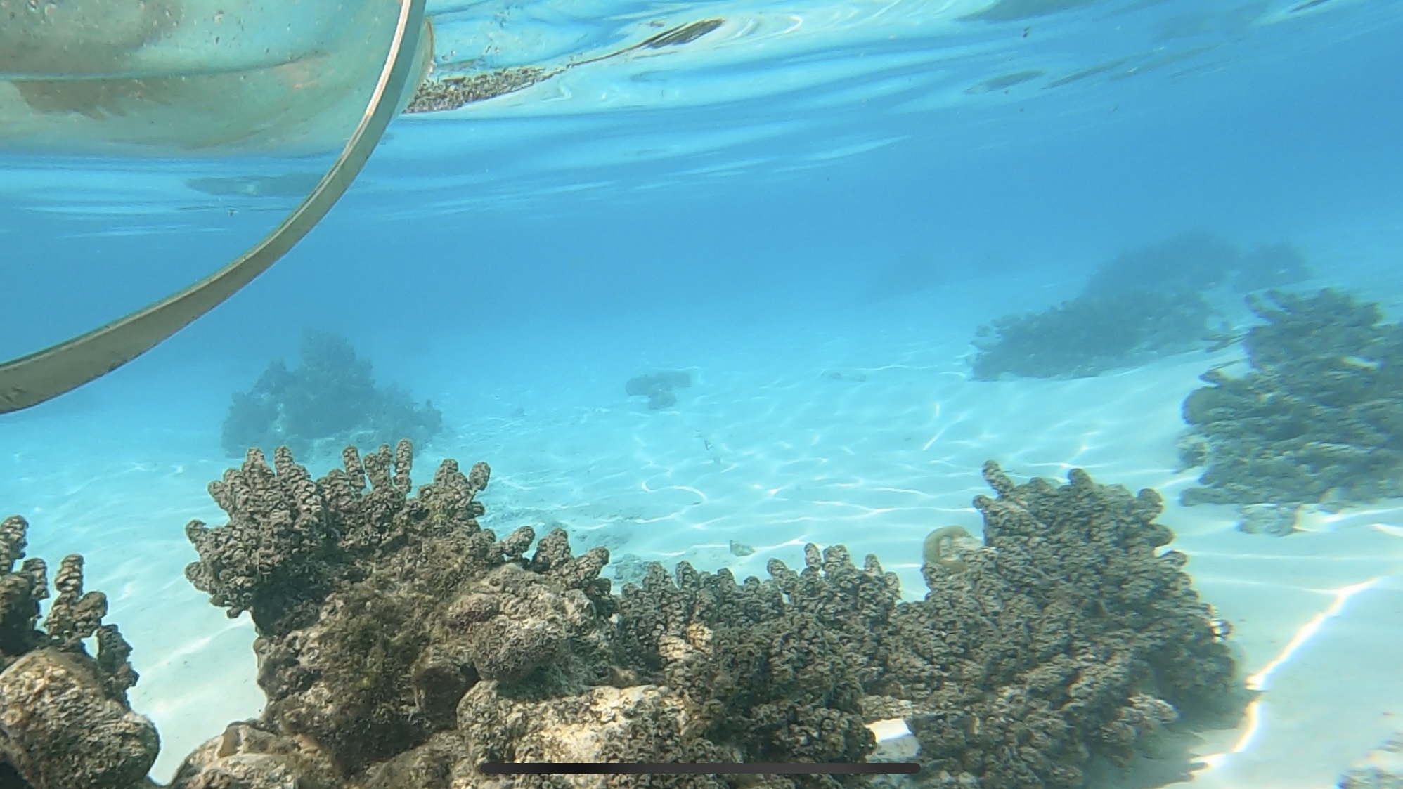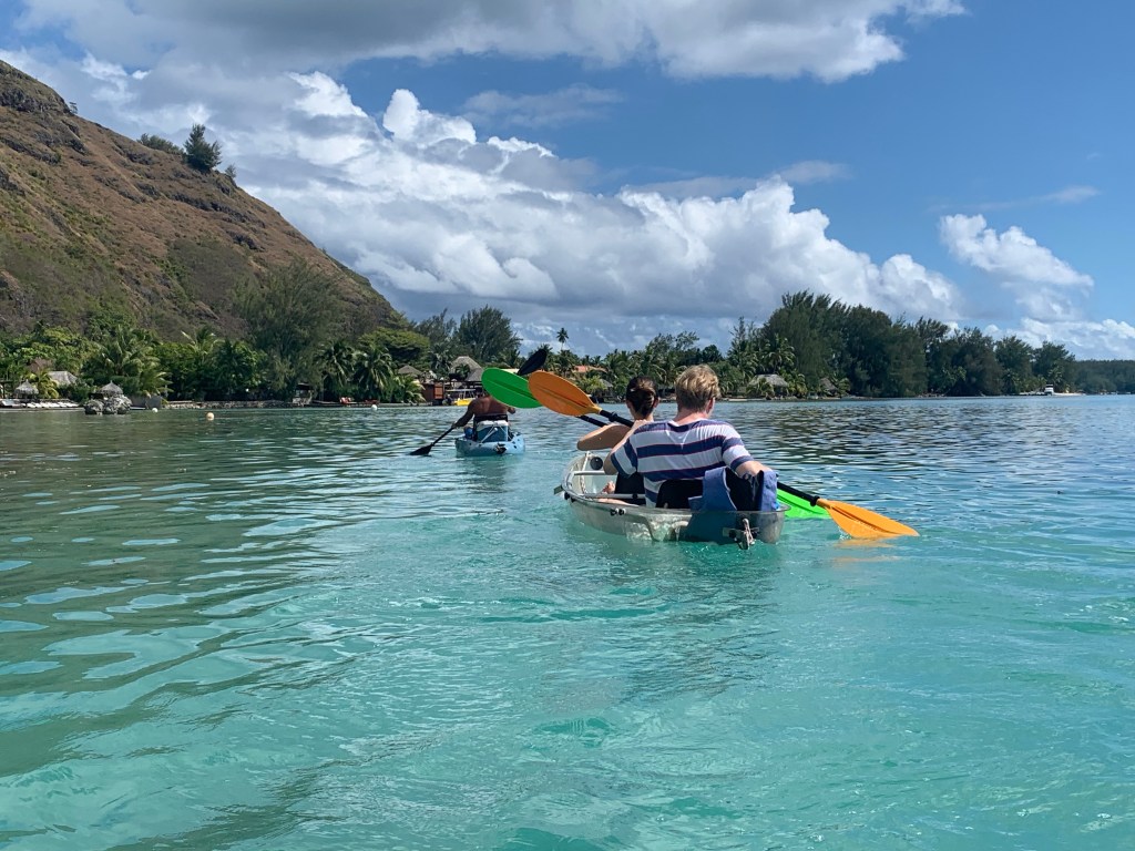 Komplett ausgestattet mit Schnorchelausrüstung und Unterwasserkamera paddelten wir jeweils zu zweit Richtung Riff. Da man gegen die Strömung paddelt, ist das ganze Unterfangen ziemlich anstrengend, aber ich habe ja zum Glück pubertierende Teenager dabei, die ihre überschüssige Kraft gar nicht genug zum Ausdruck bringen können und die aus jeder gemeinsamen Aktivität einen Wettbewerb machen. In diesem Fall durchaus nicht zu meinem Nachteil. 😀