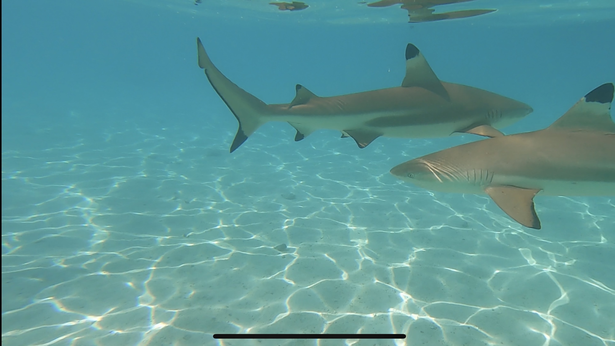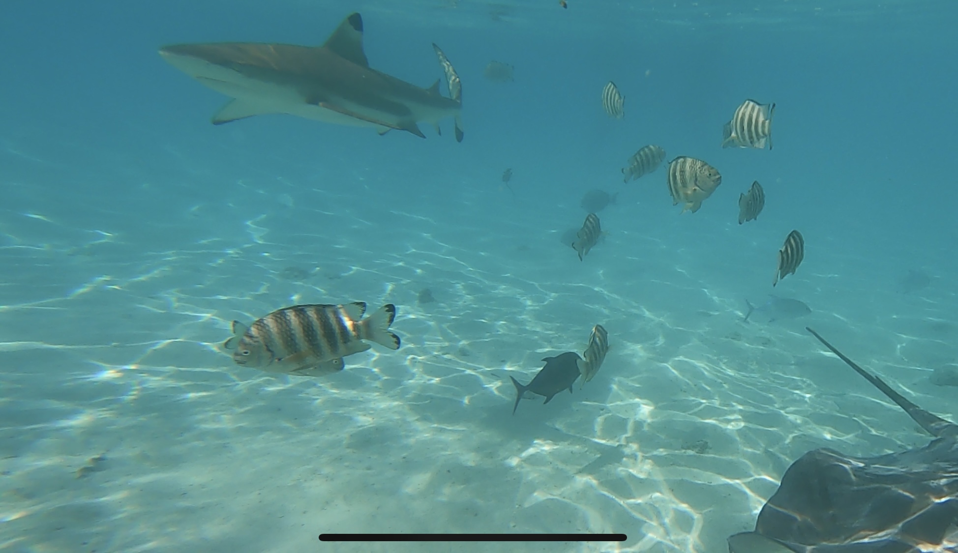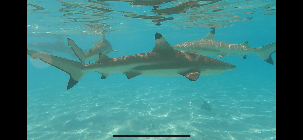 Zwei der mitreisenden Teenager hatten von gefährlichen Haien gelesen, die in den Gewässern von Französisch-Polynesien leben sollen und zögerten erst ein wenig, als unser Guide Hugo am ersten Schnorchelspot zum Aussteigen aufforderte. Er musste erst mehrfach versichern, dass es genau hier keine Haie gibt. Der aufmerksame Zuhörer hätte an dieser Stelle schon etwas ahnen können. 😀