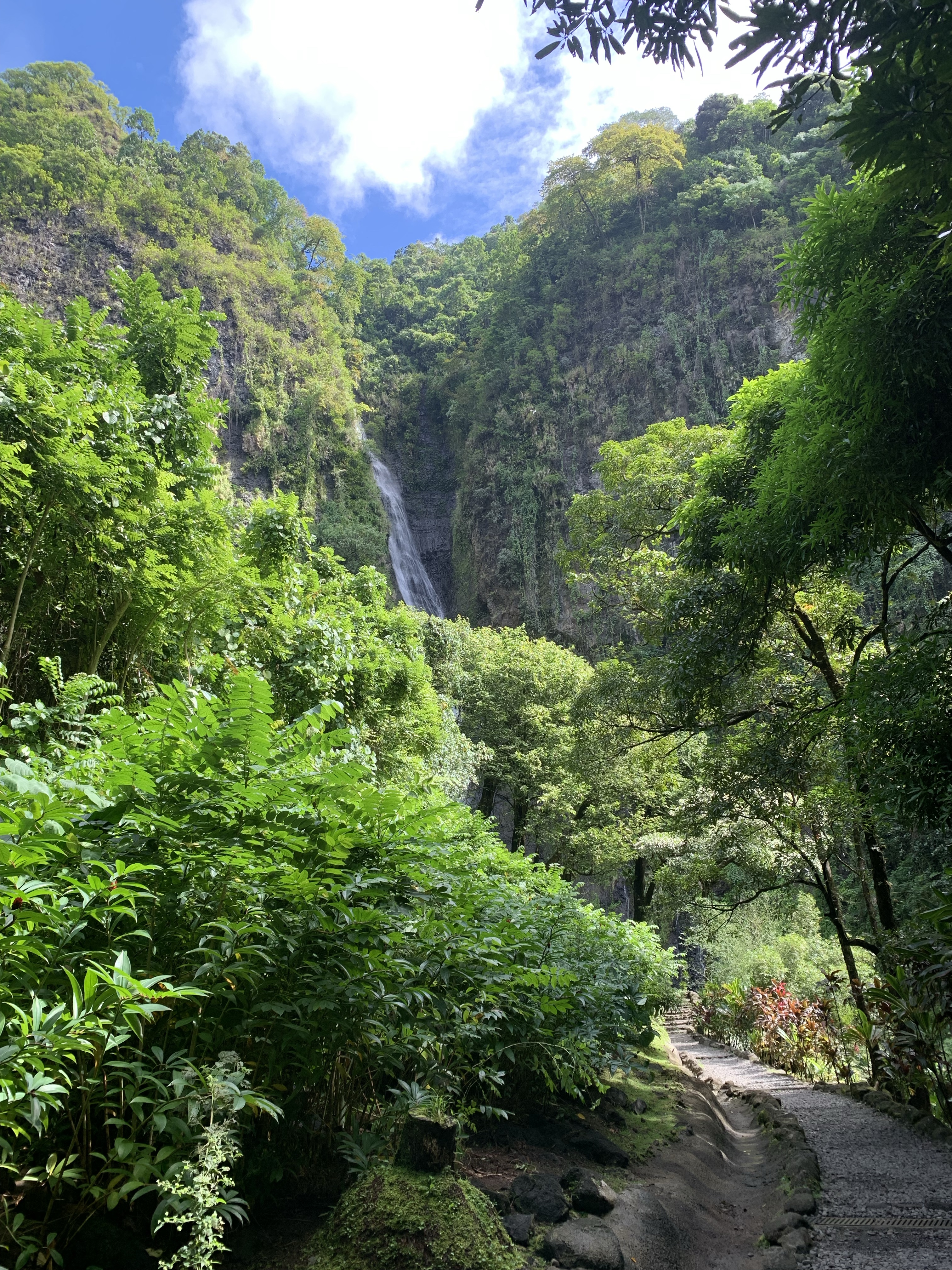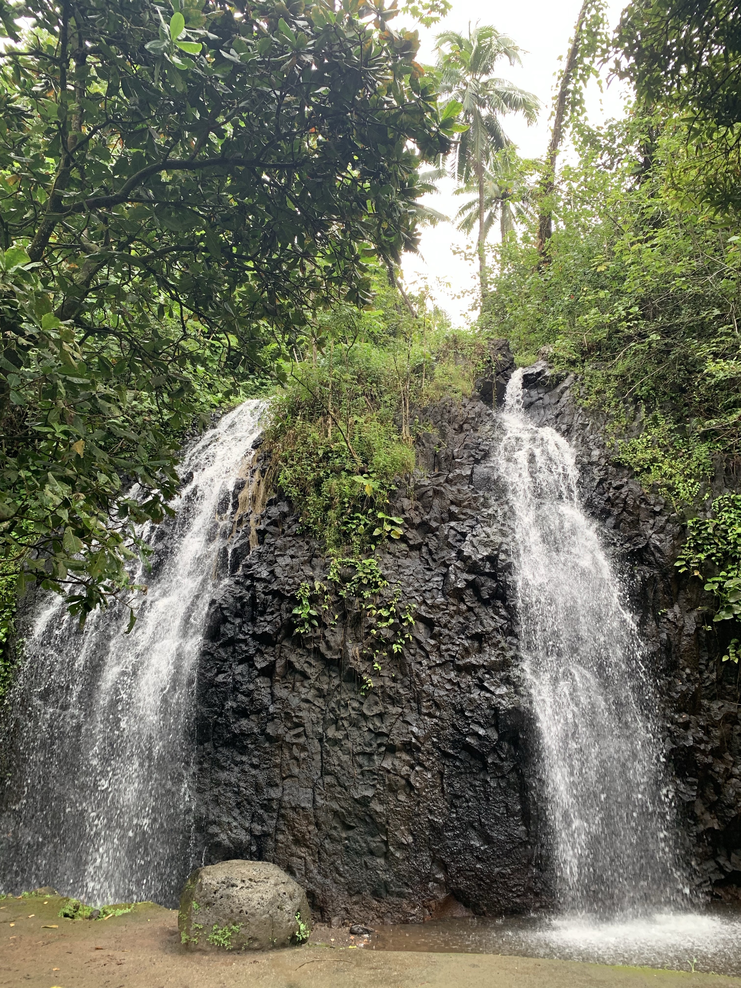 Der Wasserfall, der Cascade Vaimahuta, zu dem der Weg führt, kann sich in der Reihe der Wasserfälle, die wir schon besuchen durften, durchaus sehen lassen. Da es in der Nacht davor so viel geregnet hatte, führte er auch besonders viel Wasser. Ein großartiges Bild mitten zwischen den grünbewachsenen Felsen.