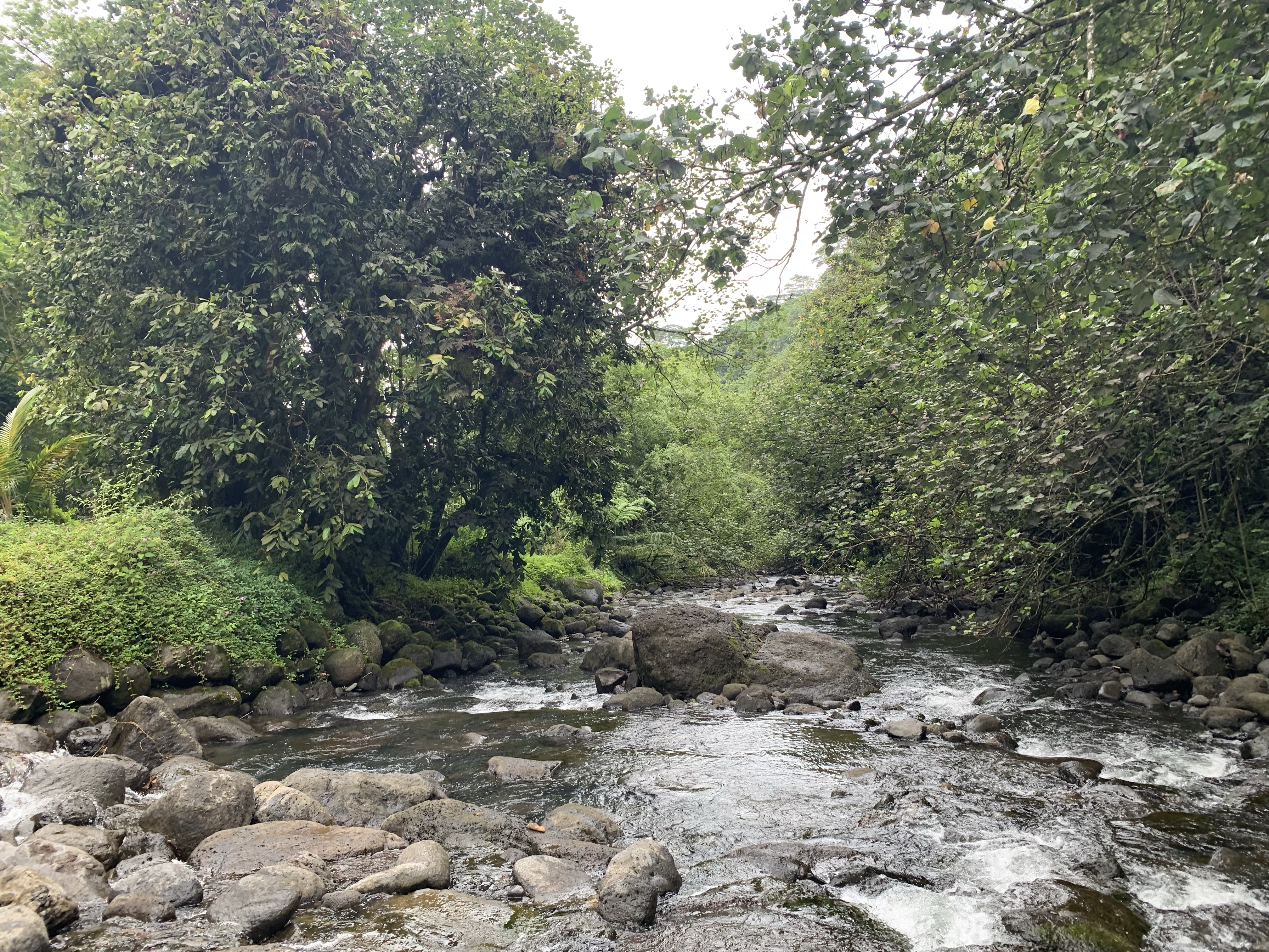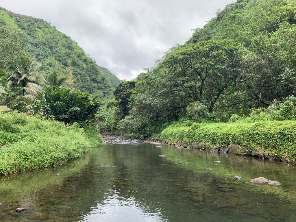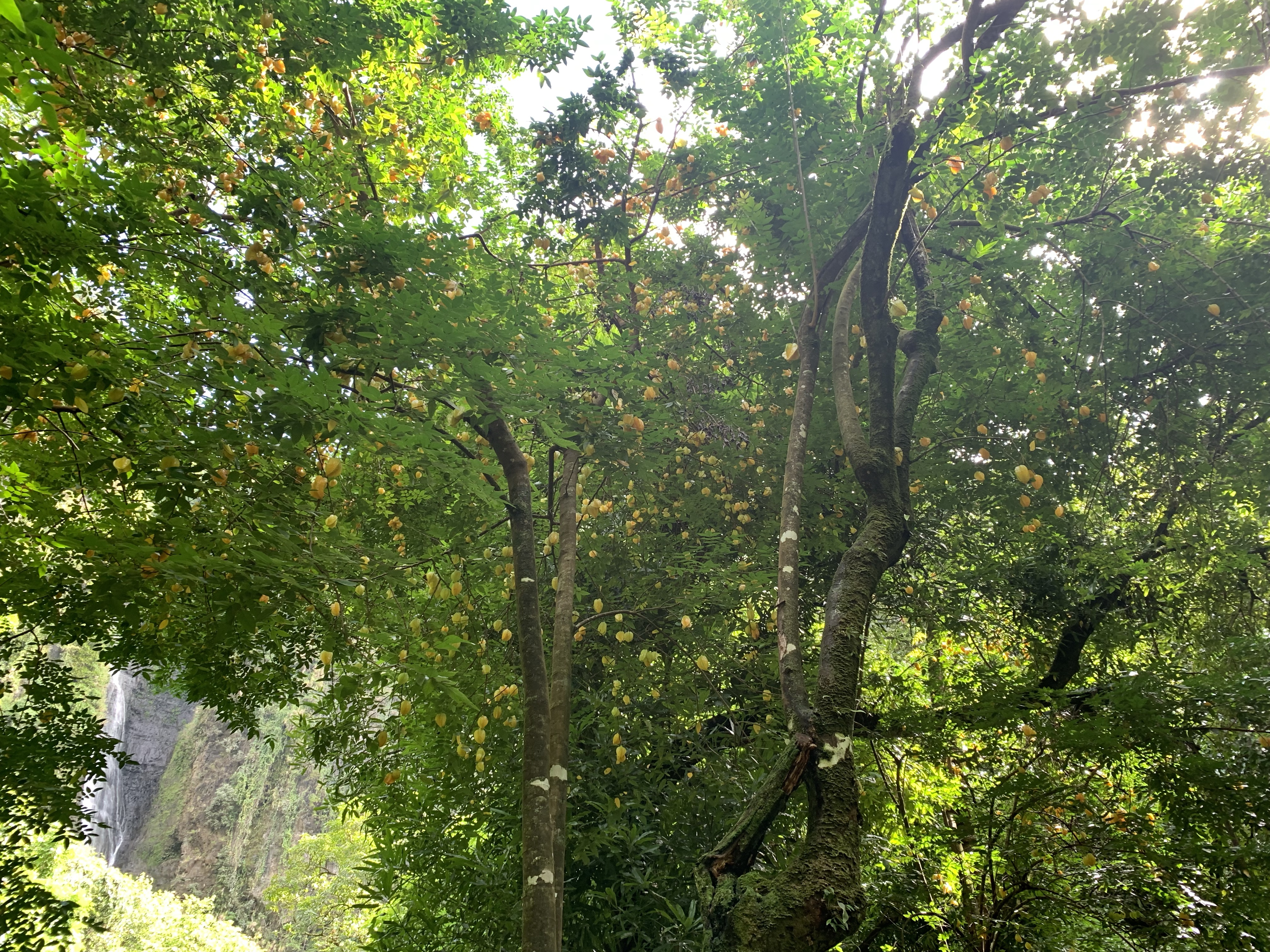 Da unser Wanderunterfangen in Bora-Bora ja nicht wirklich von Erfolg gekrönt gewesen war, hatte ich quasi noch Einen gut. 🙂 Also auf ein Neues die festen Schuhe geschnürt und den Wanderrucksack aufgesetzt. Geplant waren zwei kleine Runden zu einem bzw. zu drei hübschen Wasserfällen. Der Weg zu Nummer 1 war mehr ein kurzer Spaziergang als eine Wanderung. Es gab einen breiten Wanderweg am Fluss entlang und am Rand wuchsen riesiger Bambus und Bäume, die mit Unmengen an Sternfrüchten beladen waren.