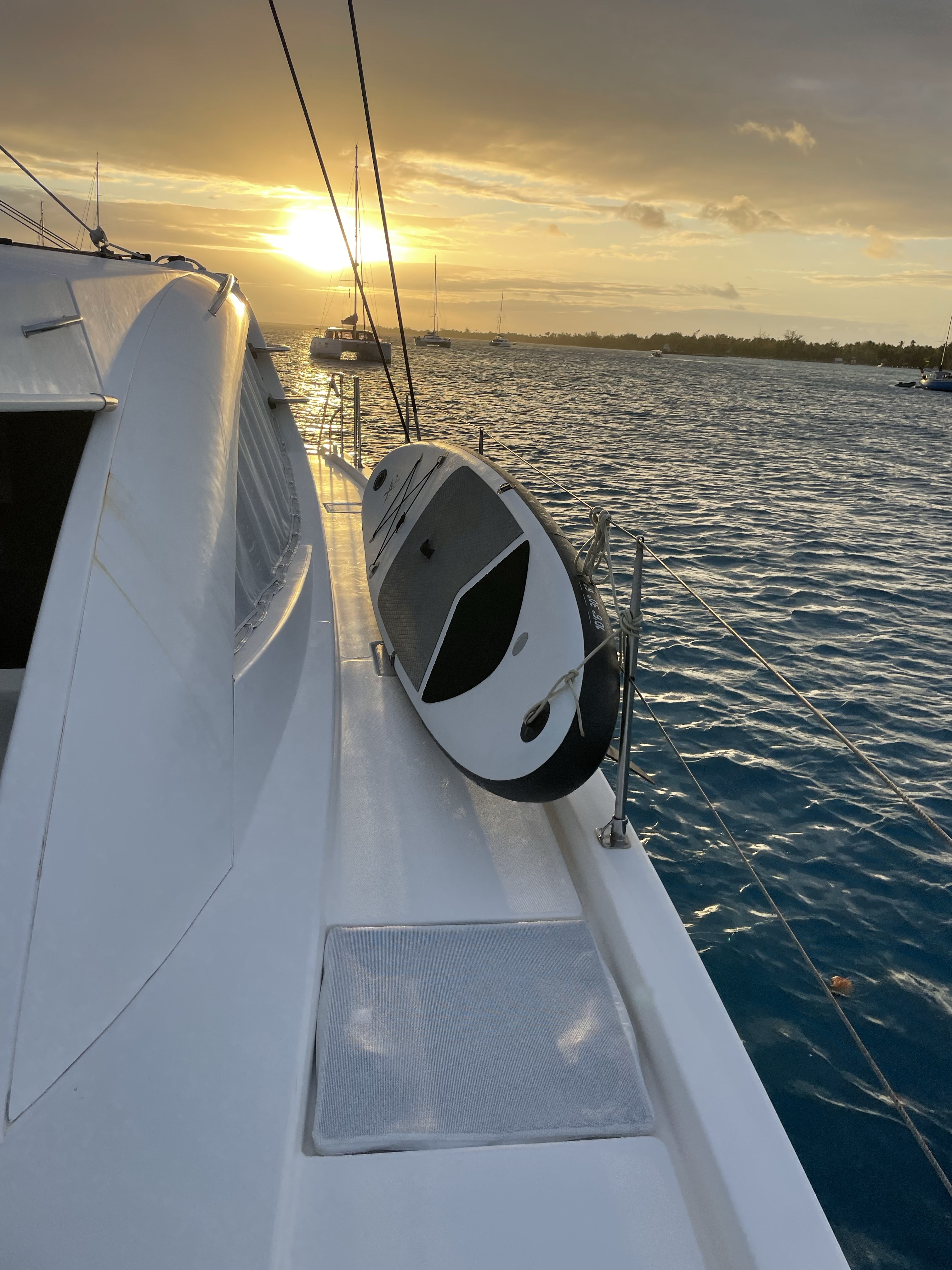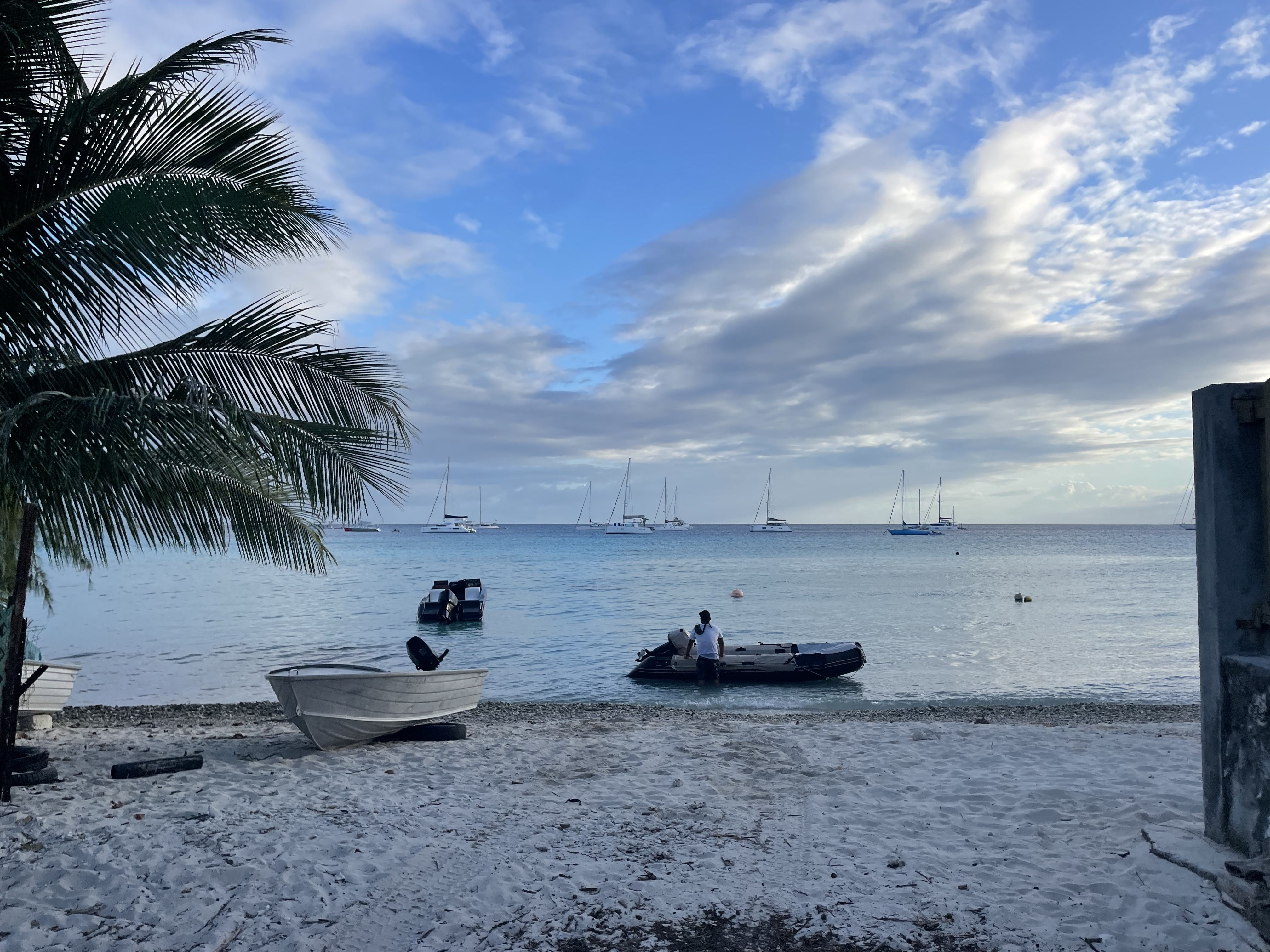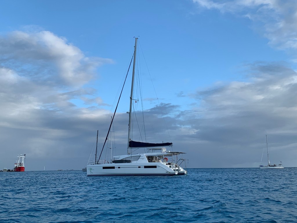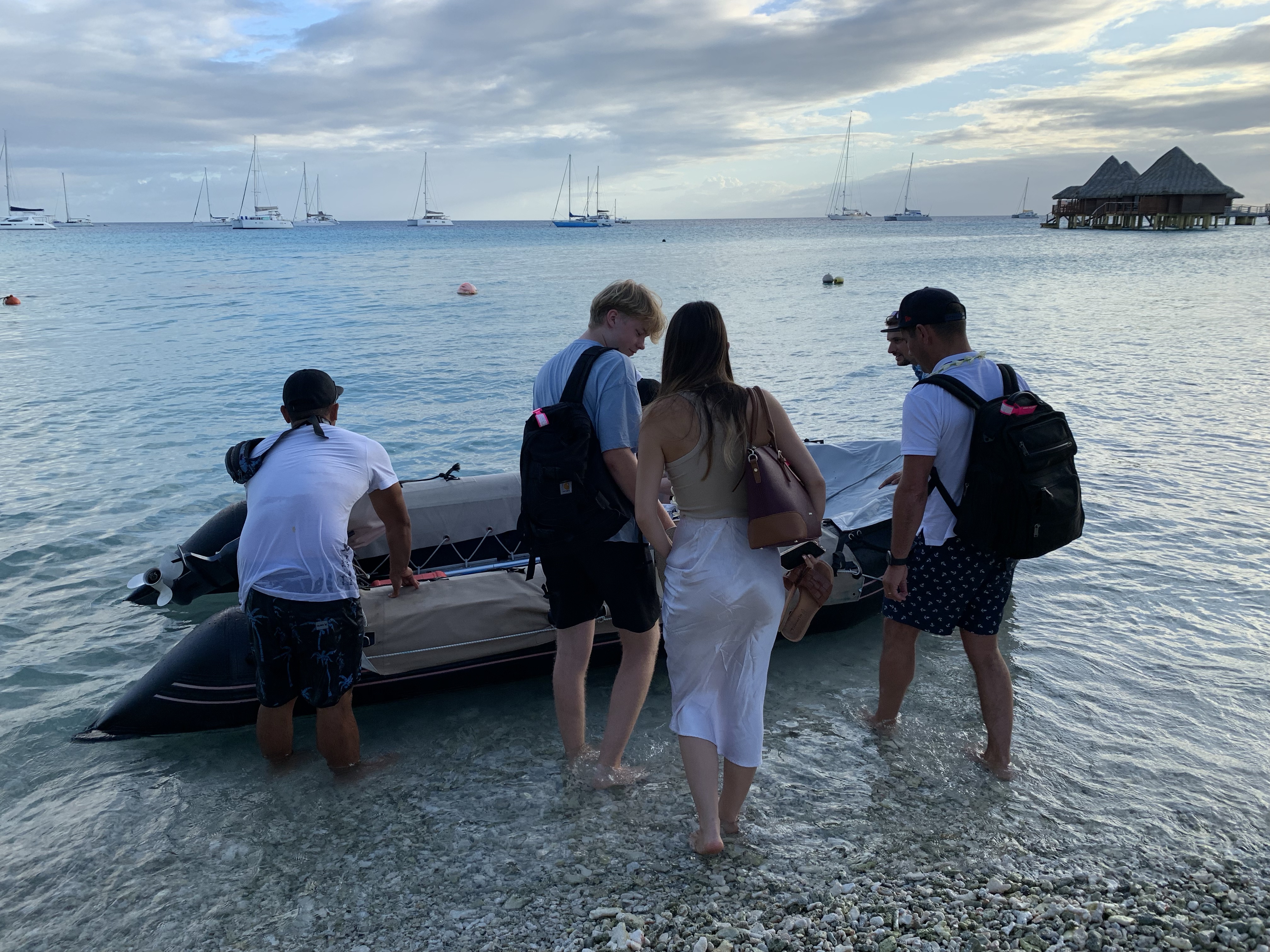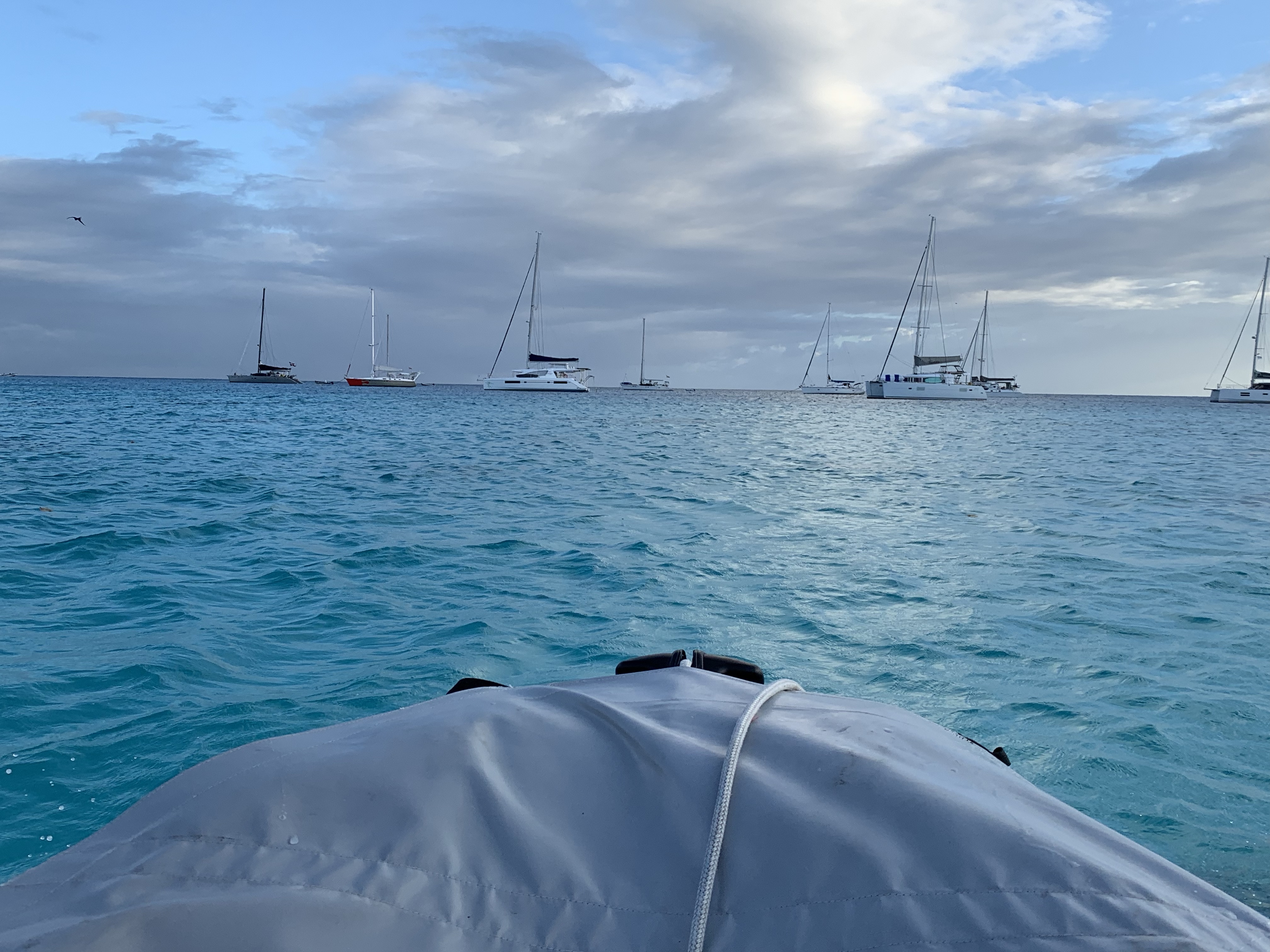 Marc erzählte, dass sie normalerweise gleich in der Nähe des Flughafens ankern, aber dass der Wellengang einfach zu hoch ist und sie deshalb den Katamaran lieber an einer ruhigeren Stelle festgemacht haben. (Ihr könnt euch vermutlich vorstellen, dass diese Information nicht unmittelbar zu weniger Nervosität meinerseits führte.) Direkt an Land anlegen kann der Katamaran hier nicht, also ging es stattdessen auf das ‘Dingi’ – das Schlauchboot und mit diesem dann zum Katamaran.