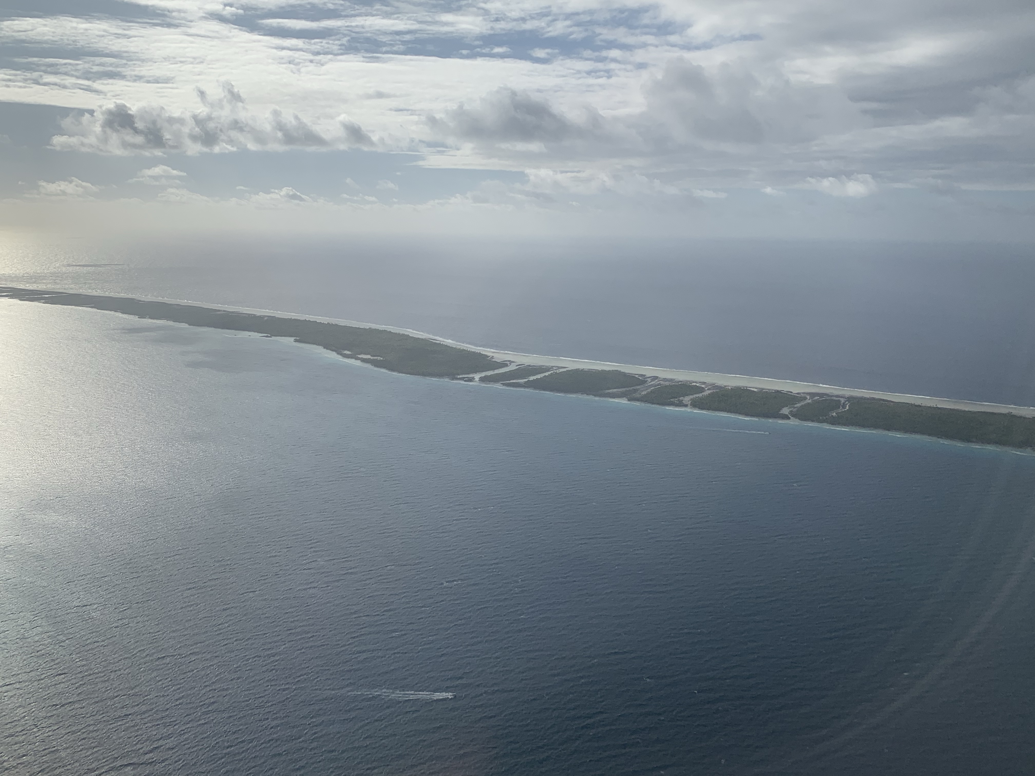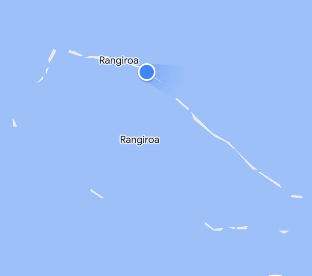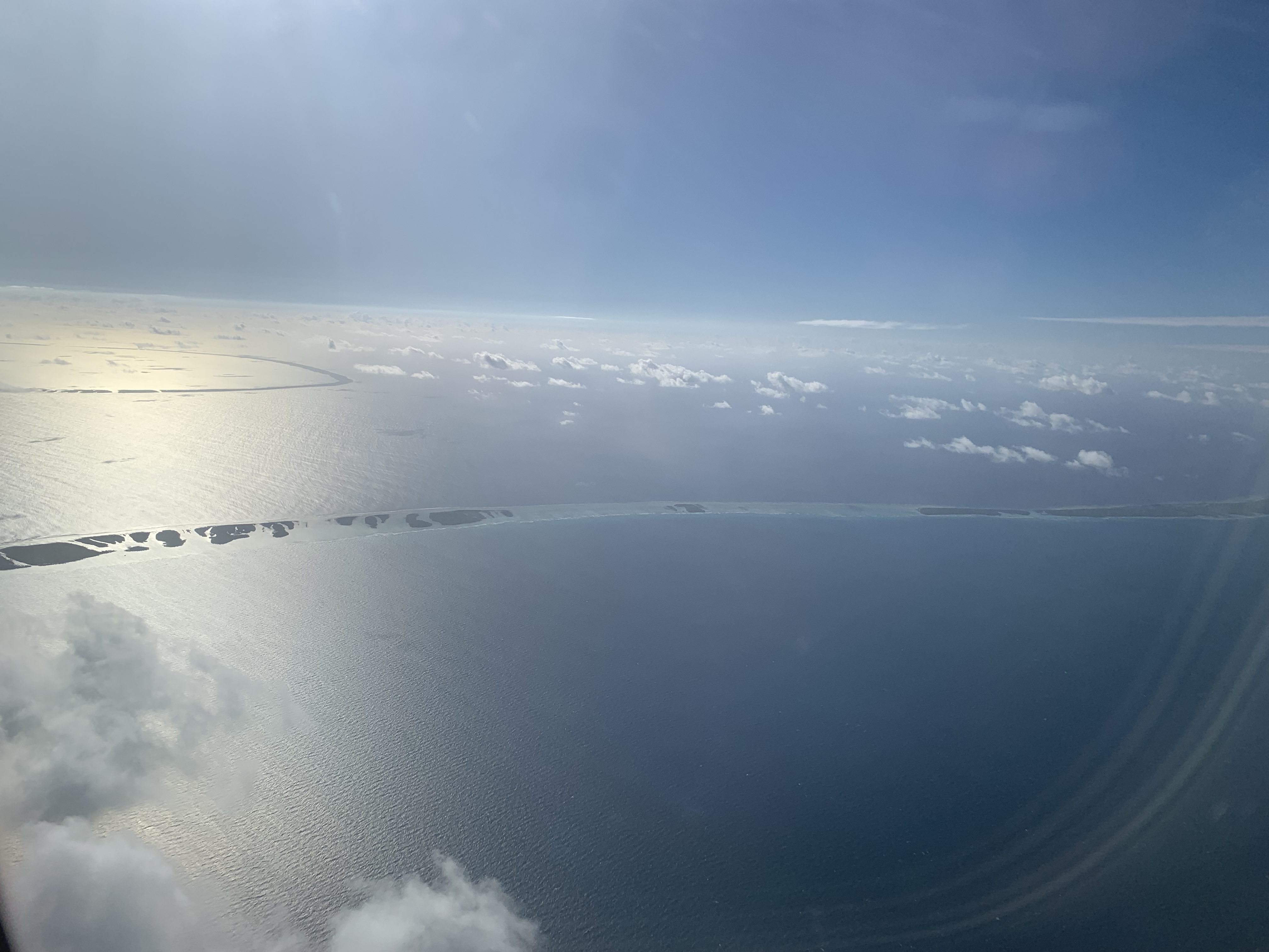 Rangiroa ist das zweitgrößte Atoll der Welt, etwa 80km lang und besteht aus 240 Motus / kleinen Inseln. Vom Flugzeug aus kann man die Form des Atolls und die Lagune in ihrem Zentrum super erkennen.