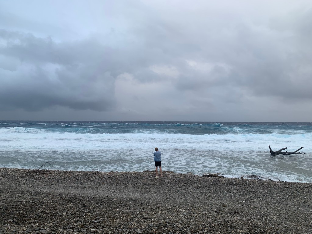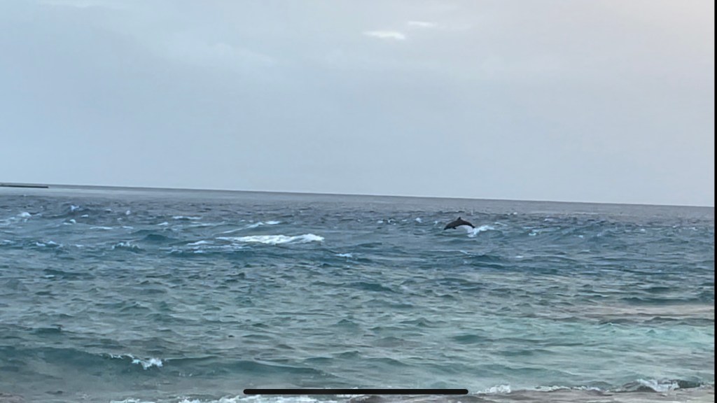 Auf dem Rückweg haben wir noch am Tiputa Pass (eine Meeresstraße zwischen zwei der größeren Inseln von Rangiroa) gehalten, in der Hoffnung, die Delfine zu sehen, die dort ganzjährig leben sollen. Und wir hatten Glück!!! Es war großartig, sie in den Wellen springen zu sehen – auch wenn der Himmel mittlerweile wieder ziemlich bewölkt und der Seegang ganz ordentlich waren und die Bildqualität eher grenzwertig ist. 🙂