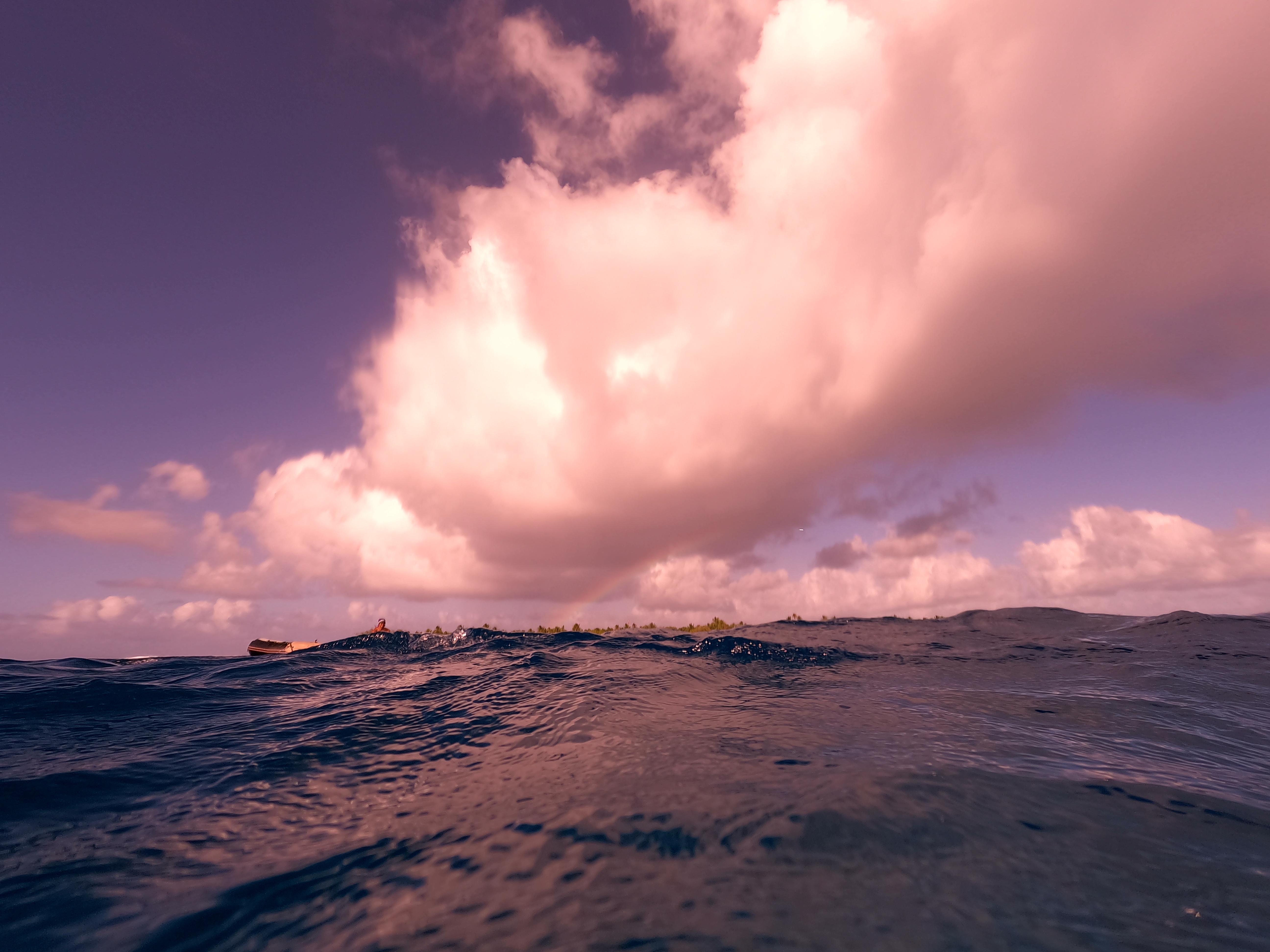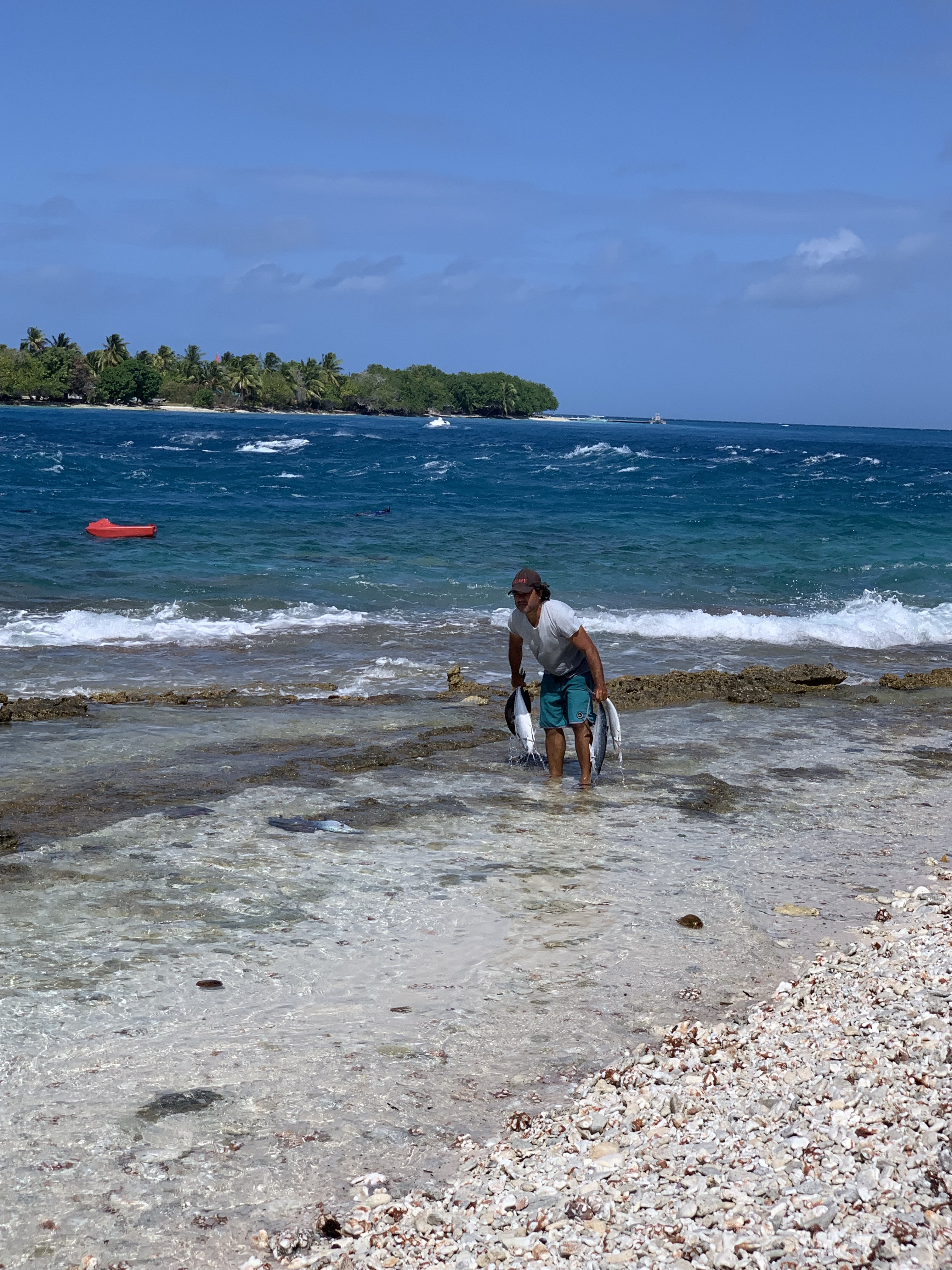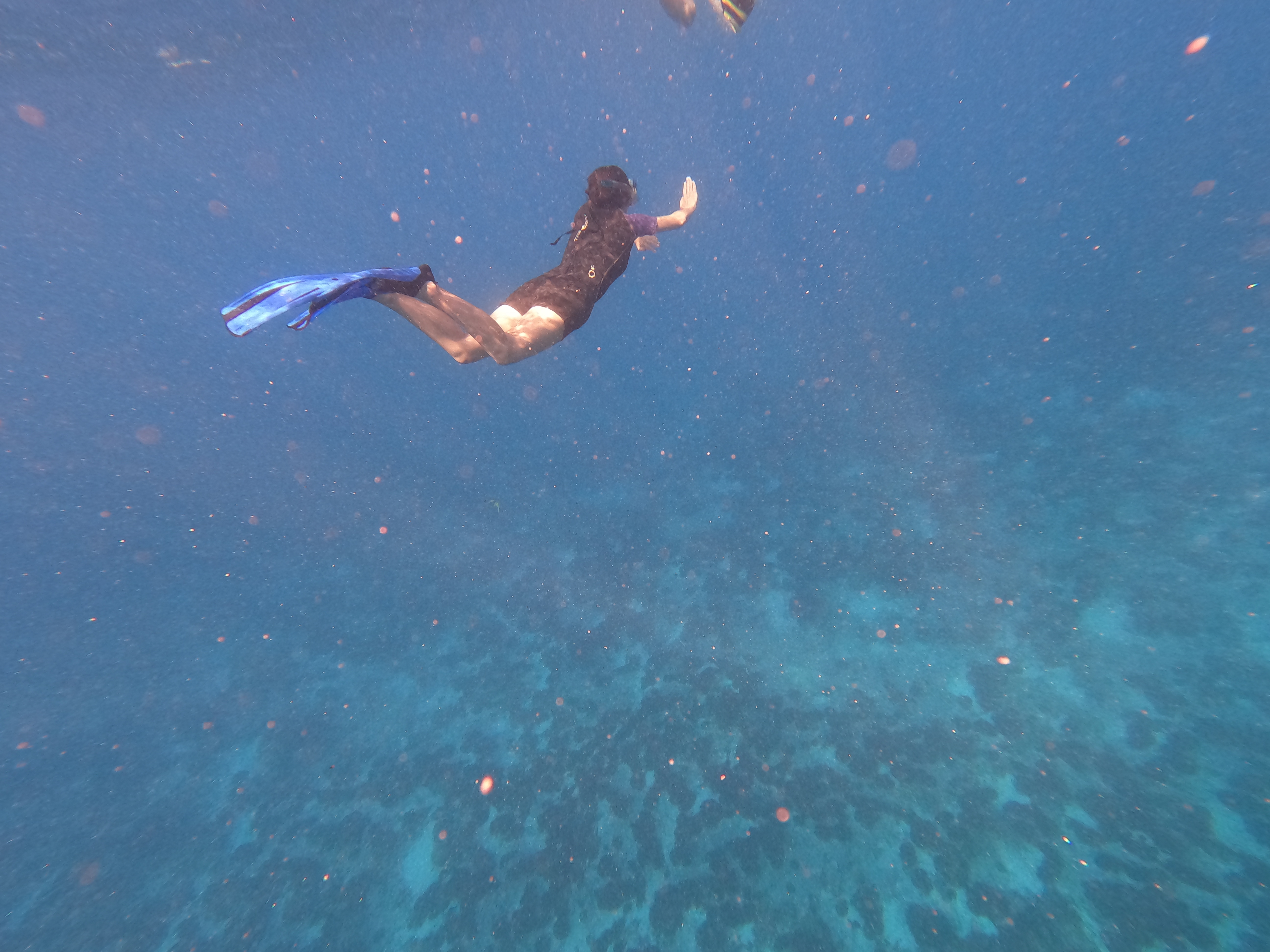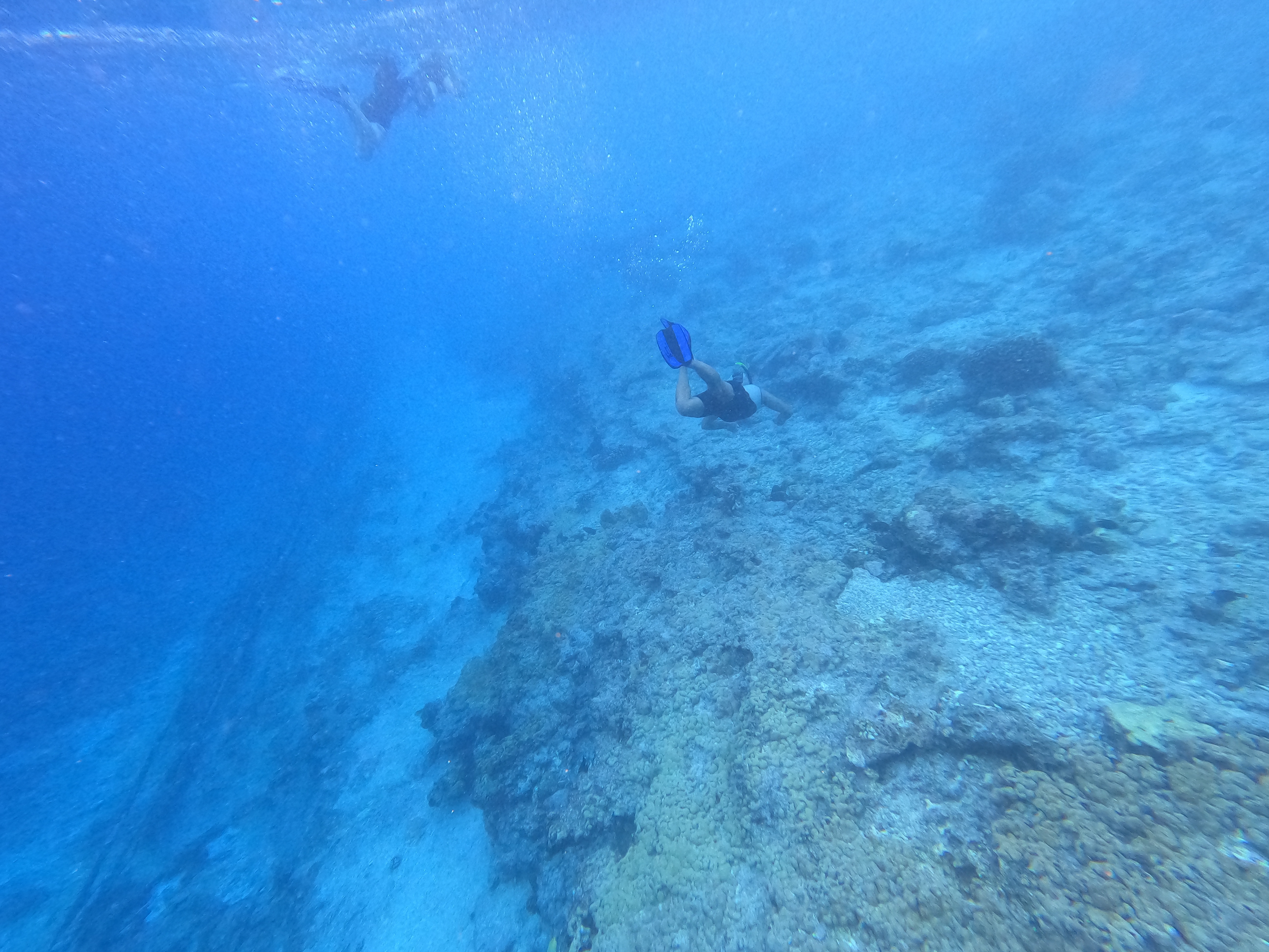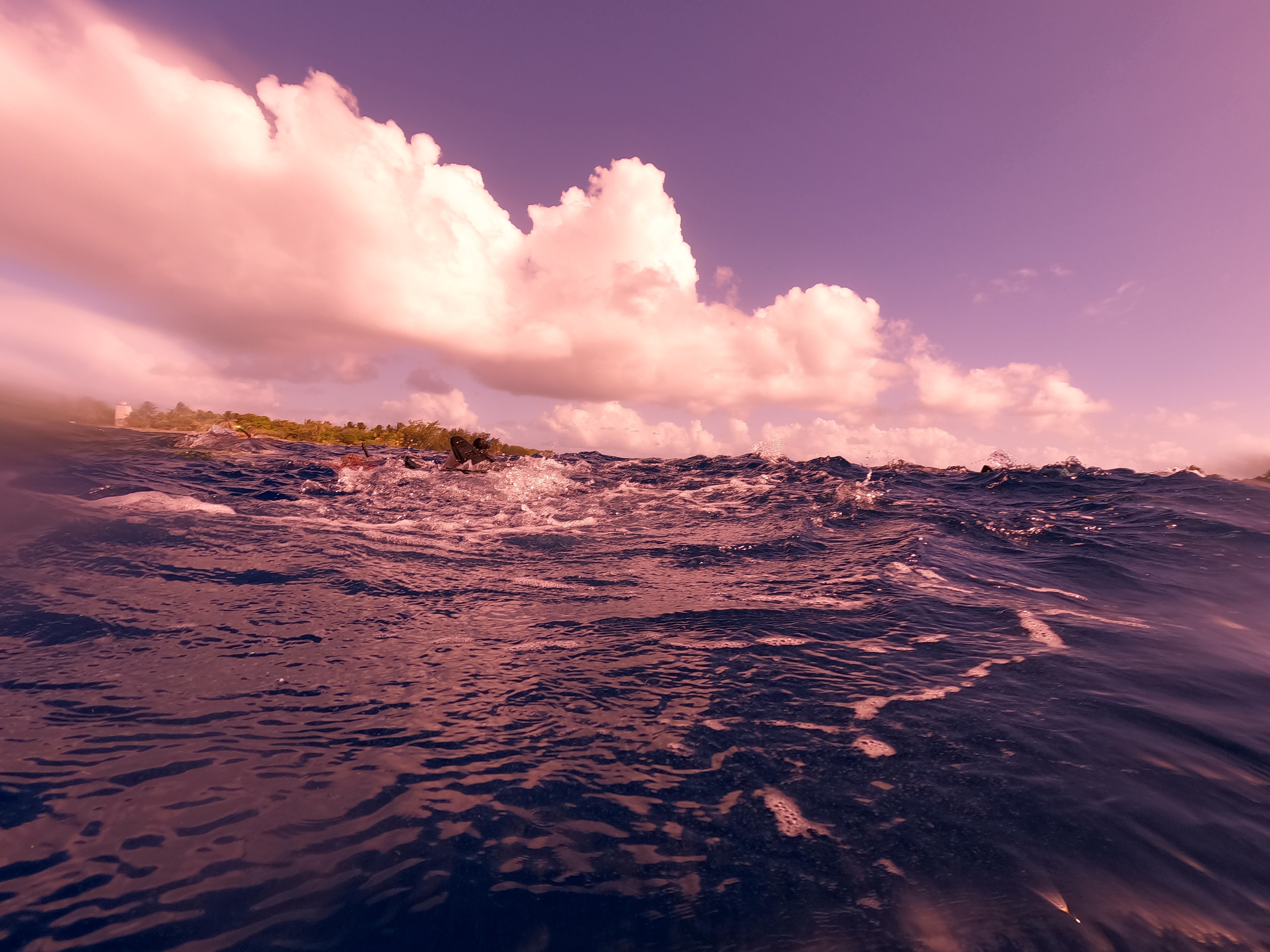 Anschließend ruft Marc zum ‘Fertigmachen’ – das heißt Flossen und Brille an – und dann mit eleganter Rückwärtsrolle zum Schnorcheln ins Wasser. Die Strömung durch den Pass aus dem Meer zurück in die Bucht hinein ist stark genug, um sich einfach von ihr treiben zu lassen. Immer am Riff mit all seinen Fischen und anderen Meeresbewohnern entlang.