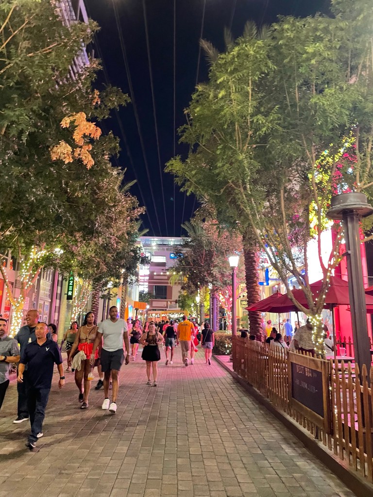 Vielleicht lag es daran, dass Samstagabend war, vielleicht an der späten Uhrzeit, vielleicht an einem Live-Auftritt irgendeiner Band an diesem Abend in der Straße, aber die Fremont Street war unfassbar voll mit Menschen. Am ‚Eingang‘ gab es Taschenkontrollen und Kinder unter 18 Jahren wurden nicht reingelassen. Also suchten wir uns stattdessen ein hübsches Lokal in der Nähe für ein kleines Abendessen und fuhren anschließend zurück, um noch eine kleine Runde durch das LINQ – einem Vergnügungsviertel in der Nähe des Strip – zu spazieren. Neben Zip Lines, die hoch über der Straße entlangführen, sowie unzähligen Restaurants und Läden, steht dort auch das zweithöchste Riesenrad der Welt – the High Roller.