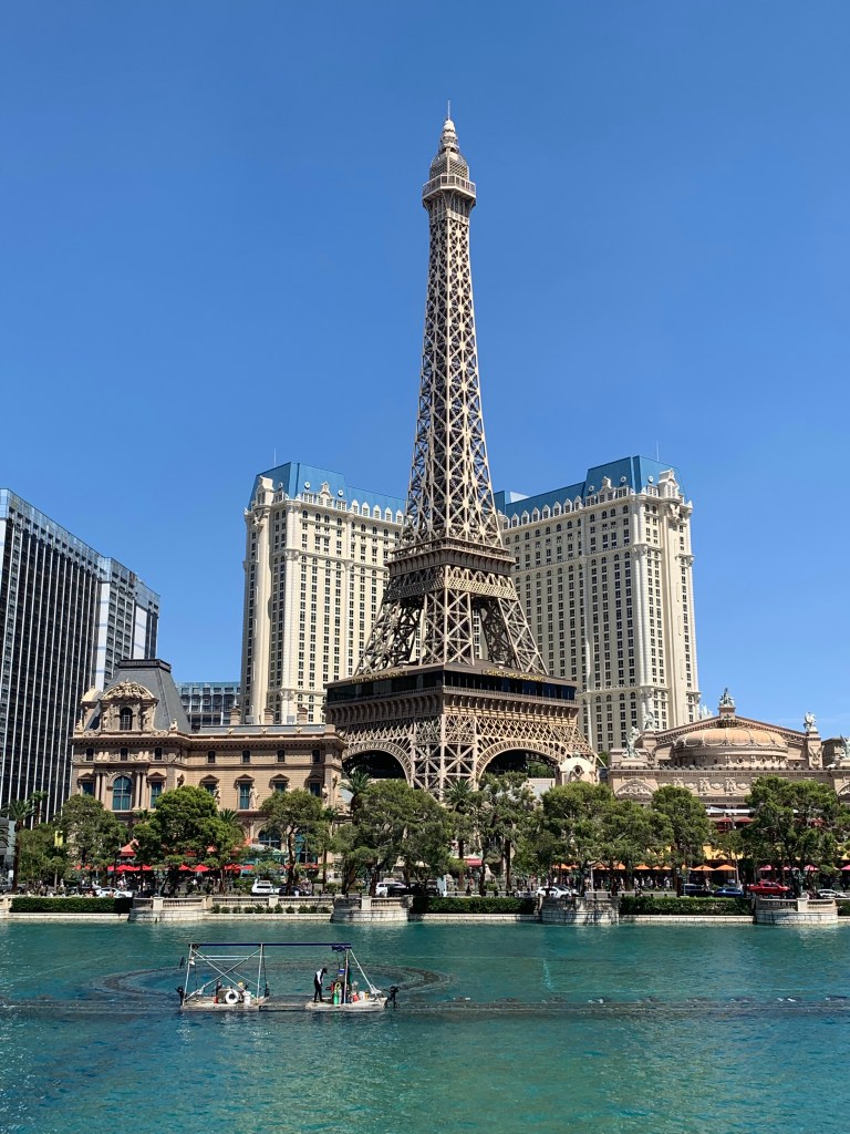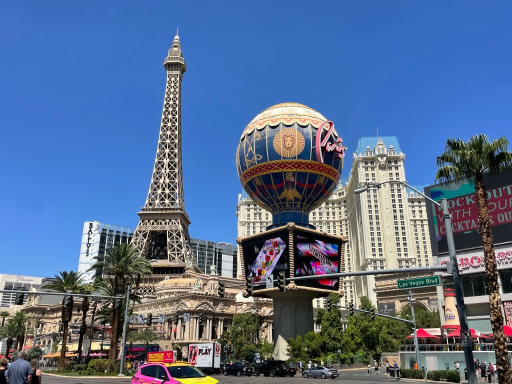 Direkt gegenüber vom Bellagio das ‚Paris Las Vegas‘ mit Eiffelturm, Triumphbogen und Montgolfier-Ballon.