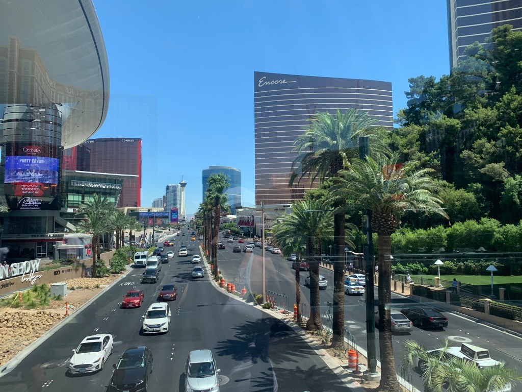Las Vegas ist eine verrückte Stadt, unglaublich geschäftig, laut, grell und – wenig überraschend mitten in der Wüste – heiß. Überall riesige Leuchtreklamen, Neonlichter, gigantische LED-Wände. Große, breite Straßen durchziehen die Stadt. Zum Überqueren gibt es vor allem an den größeren Kreuzungen Fußgängerbrücken.