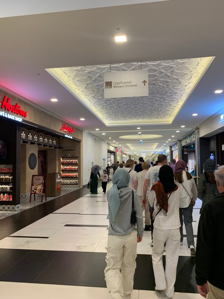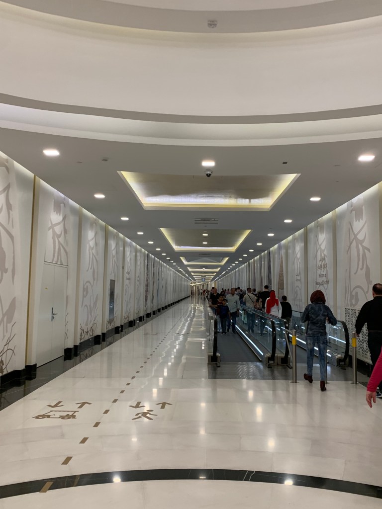 Mehrere Millionen Menschen besuchen die Moschee jedes Jahr und so verwundert es nicht, dass beim Besuchs- und Buchungssystem nichts dem Zufall überlassen wird. Leitsysteme, Taschenscanner, Transportbänder… alles ist hochgradig durchorganisiert und vor dem eigentlichen Eingang fühlt man sich eher an einen Ausflug in einem Freizeitpark oder Festival erinnert als an den Besuch eine religiösen Stätte.