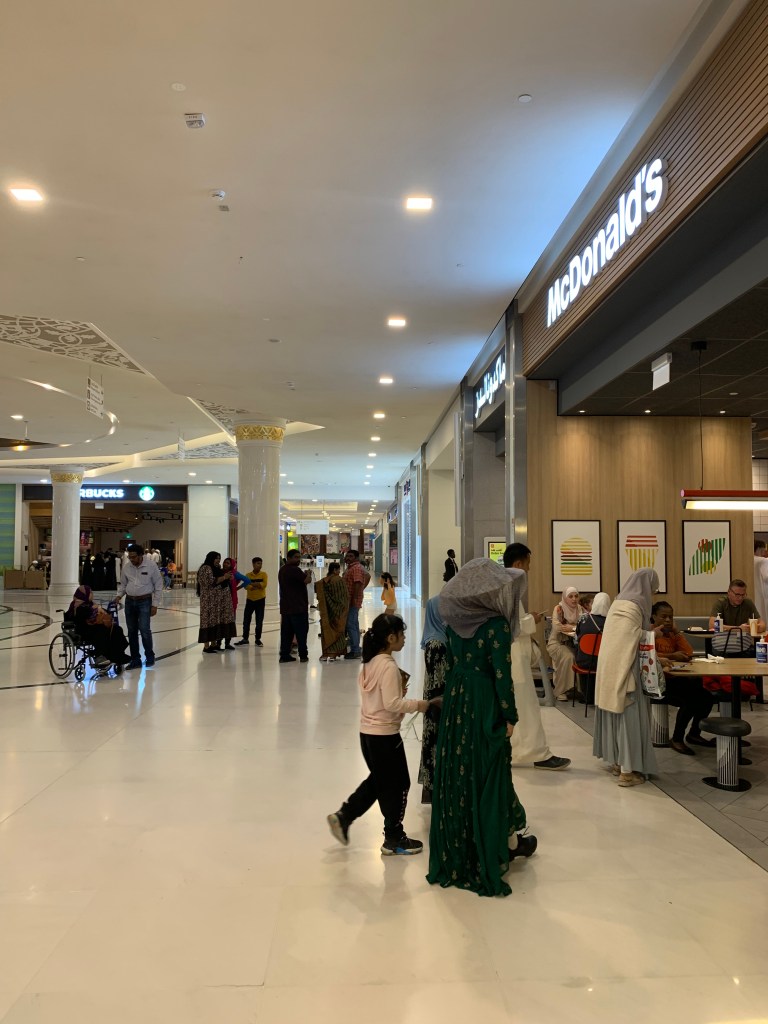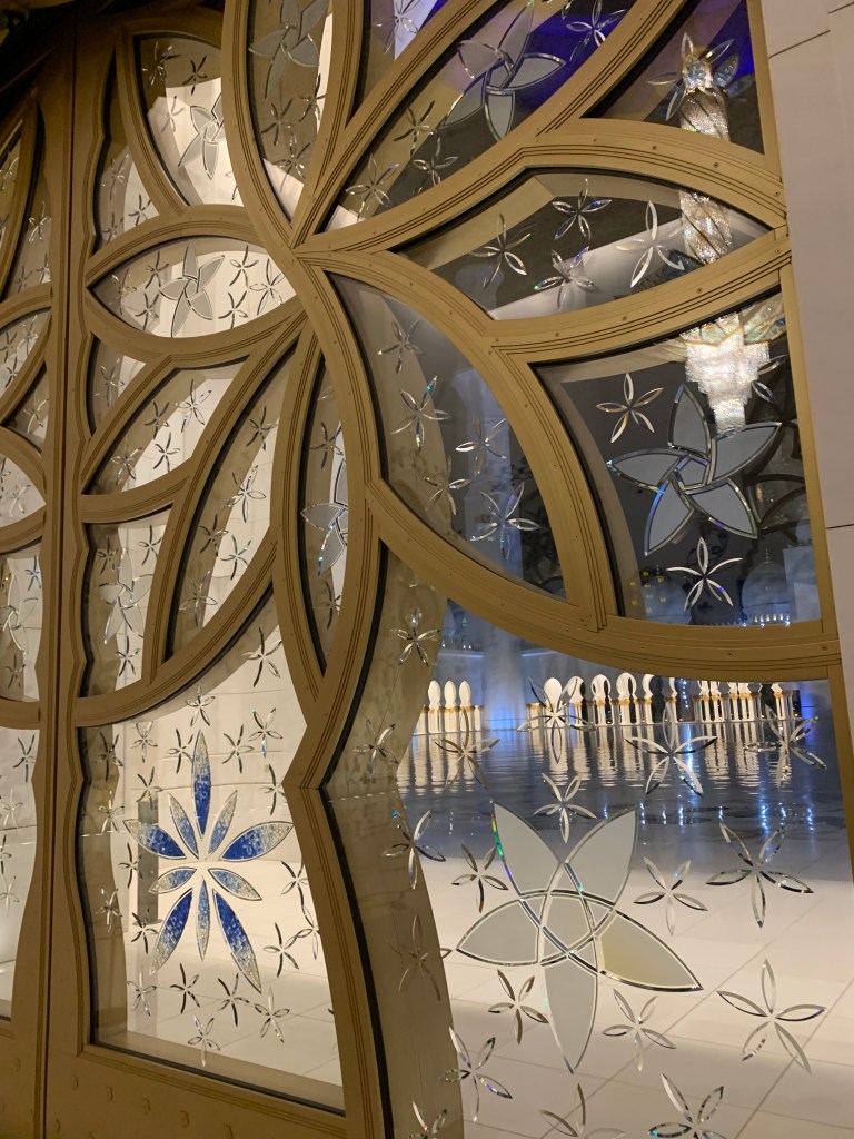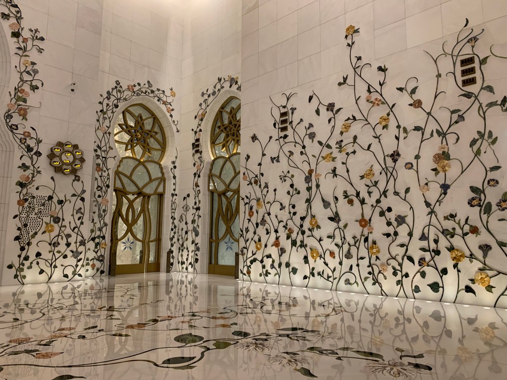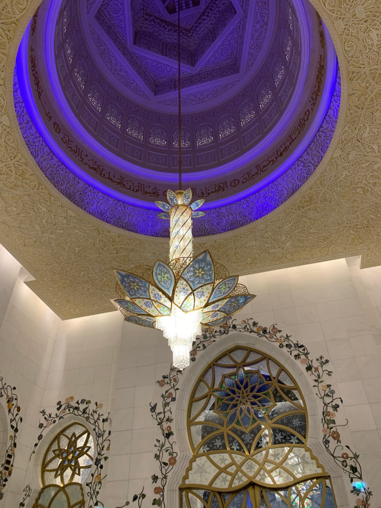 Wenn man die Moschee durch den unterirdischen Tunnel dann aber einmal erreicht hat, kommt man aus dem Staunen nicht mehr heraus. Alles ist riesig groß, weißer Marmor so weit man schaut, Kristalle, Blattgold, Halbedelsteine -hier wurden wirklich keine halben Sachen gemacht.