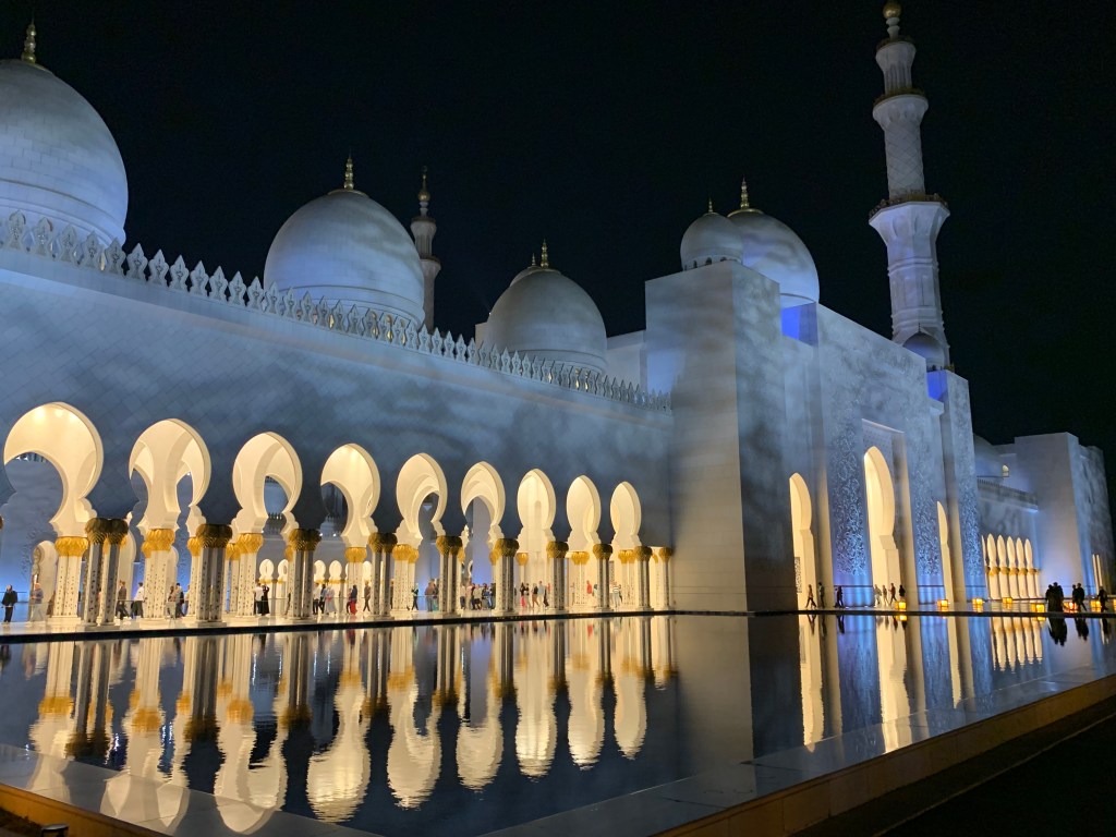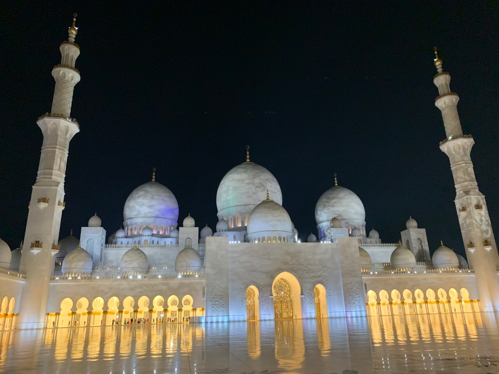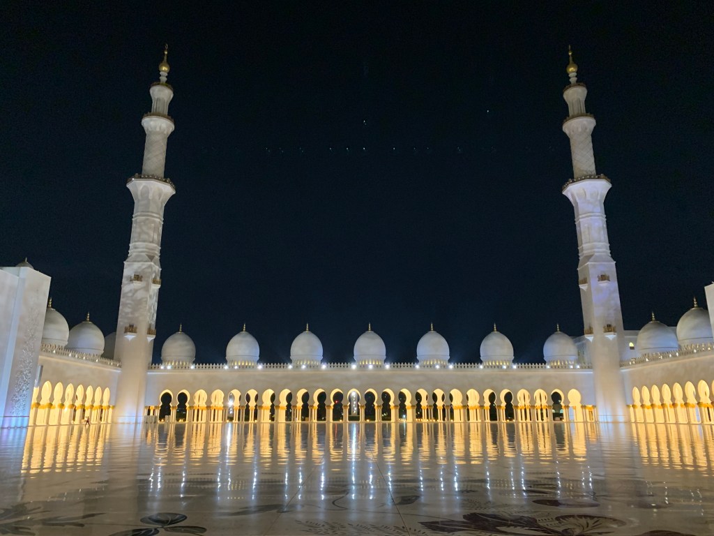 Unser zweiter Stopp auf unserer kurzen Reise durch einen kleinen Teil des Orients war Abu Dhabi – die Hauptstadt des größten der sieben Emirate, die die Vereinigten Arabischen Emirate bilden und gleichzeitig auch die Hauptstadt der Vereinigten Emirate selbst. Gleich nach unserer Ankunft im Hafen am Abend, machten wir uns auf zu einer geführten Tour durch das nächtliche Abu Dhabi. Neben ein paar kurzen Stopps entlang des Wegs war das eigentliche Ziel der Besuch der berühmten Scheich-Zayid-Moschee. Benannt nach dem Gründer der Vereinigten Arabischen Emirate ist sie eine der größten und prächtigsten Moscheen der Welt und bietet bis zu 40.000 Gläubigen Platz.