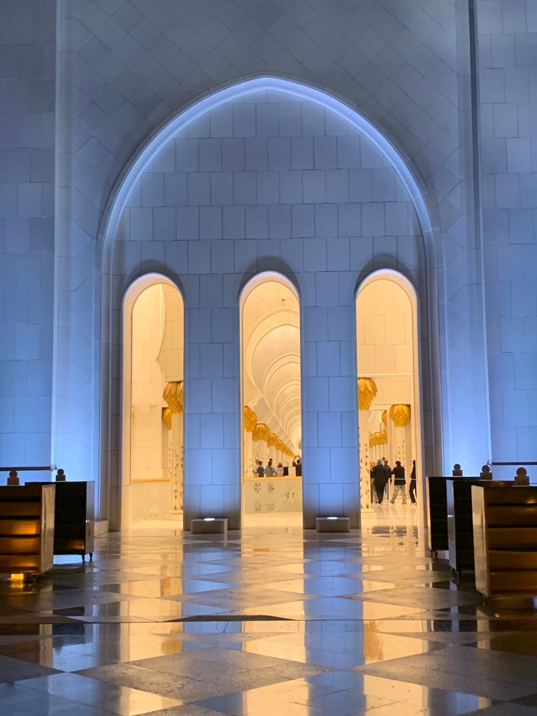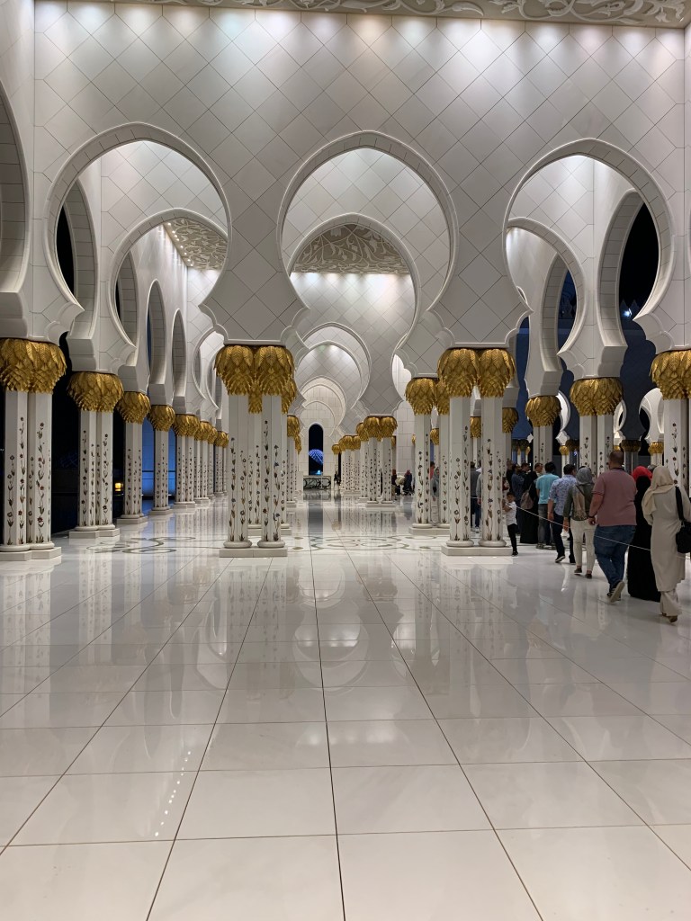 Was die Kleiderordnung angeht, sind die Regeln hier gerade für Frauen sehr klar. Zum Glück war es schon recht spät am Abend und mittlerweile nicht mehr ganz so heiß, aber bei langer Kleidung und Kopftuch wird es einem in Abu Dhabi auch in den Abendstunden relativ schnell relativ warm. Aber wenn man die Moschee von innen besichtigen möchte, bleibt einem nichts anderes übrig. (Die Kopftuchbindetechnik ist im übrigen eine Wissenschaft für sich. Sagen wir nur so viel…. einen Preis hätte ich vermutlich nicht gewonnen, aber für den Eintritt in die Moschee hat es gerade so gereicht. :-))