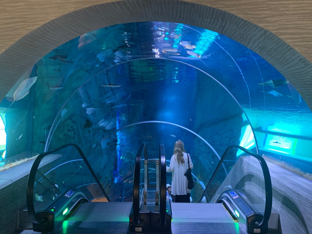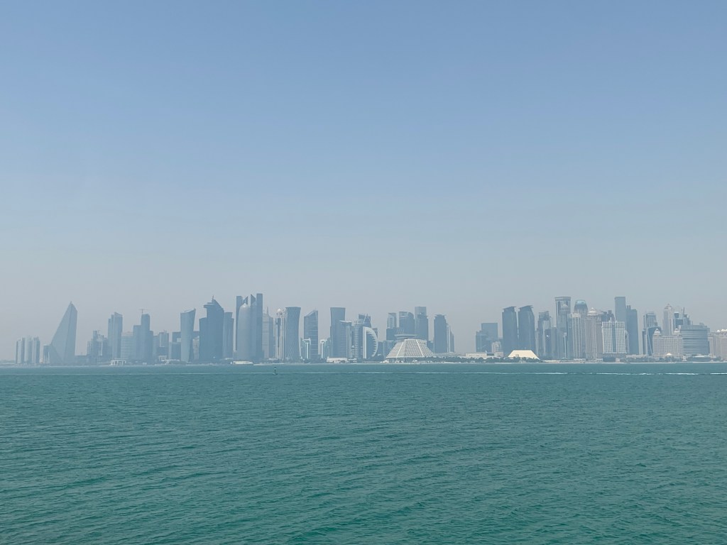 Heute in den frühen Morgenstunden erreichte unser Schiff Doha, die Hauptstadt von Katar. Spätestens seit der letzten Fußballweltmeisterschaft hat man ja irgendwie schon mal etwas von Katar gehört. (Wenn auch nicht unbedingt allzu viel Gutes.) Katar ist ein eigenständiges Emirat (seit 1971 unabhängig von Großbritannien) und hat ca. 2,7 Millionen Einwohner. Allerdings sind nur etwa 10% davon Staatsangehörige von Katar. Den weitaus größten Teil der Bevölkerung bilden Arbeitsmigranten. Seine Erdgas- und Erdölvorkommen haben Katar zu einem sehr reichen Land werden lassen – gemessen am Bruttoinlandsprodukt pro Einwohner liegt Katar auf Platz 8 der reichsten Länder der Welt. Da kann man im Hafenterminal auch schon mal ein riesiges Aquarium einbauen lassen, durch das die Rolltreppe nach draußen führt. Man will ja zeigen, was man hat und wer kann, der kann. 🙂