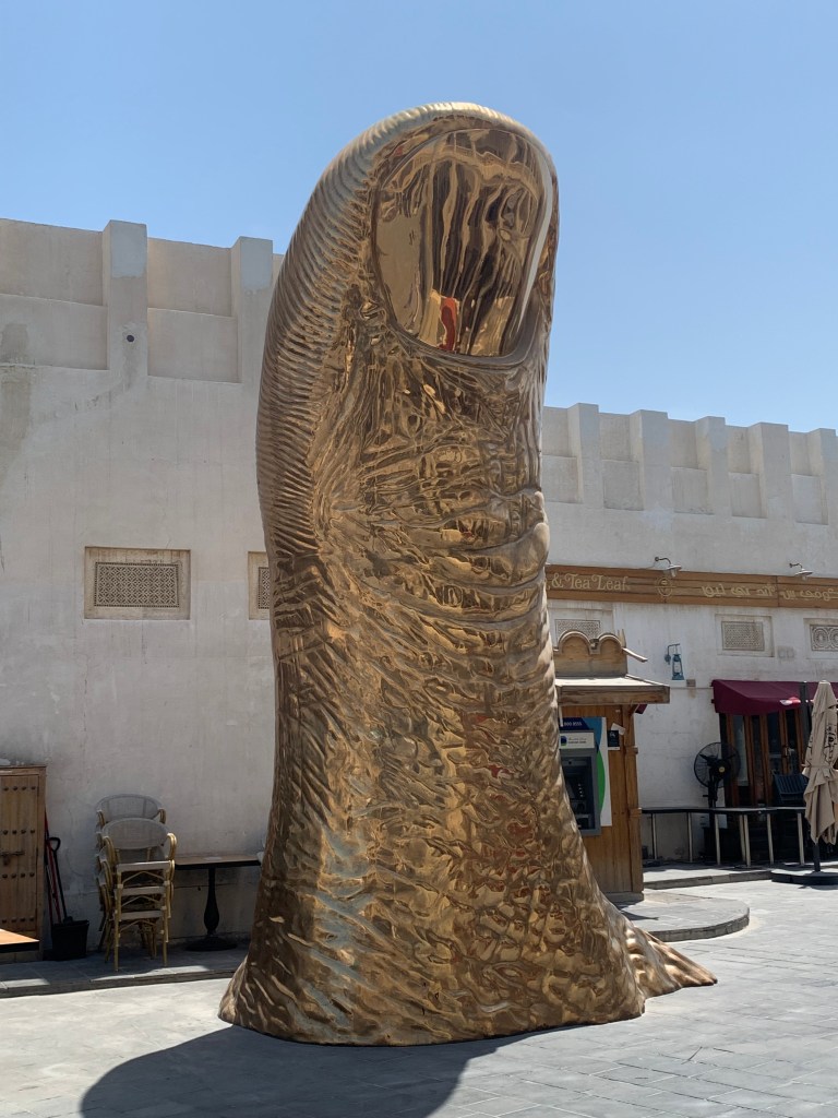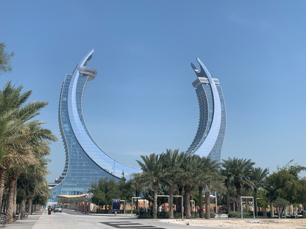 Vielleicht würden wir dort ja auch eine Kleinigkeit zum Mittag finden. Taxifahrten (und Uber) sind in Doha – wie auch in Dubai und Abu Dhabi – ausgesprochen günstig. Wir mussten allerdings feststellen, dass ich die Situation in Doha aufgrund des Ramadan ein wenig anders darstellte als in Dubai. Foodmärkte und Restaurants waren geschlossen und würden erst zum Abend öffnen. Selbiges galt für verschiedene Einkaufszentren. Und so machten wir noch einen kurzen Abstecher zum neuen Crescent (= Mondsichel) Tower in der Hoffnung dort von der Aussichtsplattform noch einen Blick auf Doha City zu bekommen… (Aufgrund des Ramadan war aber auch die Aussichtsterrasse für Besucher geschlossen.)