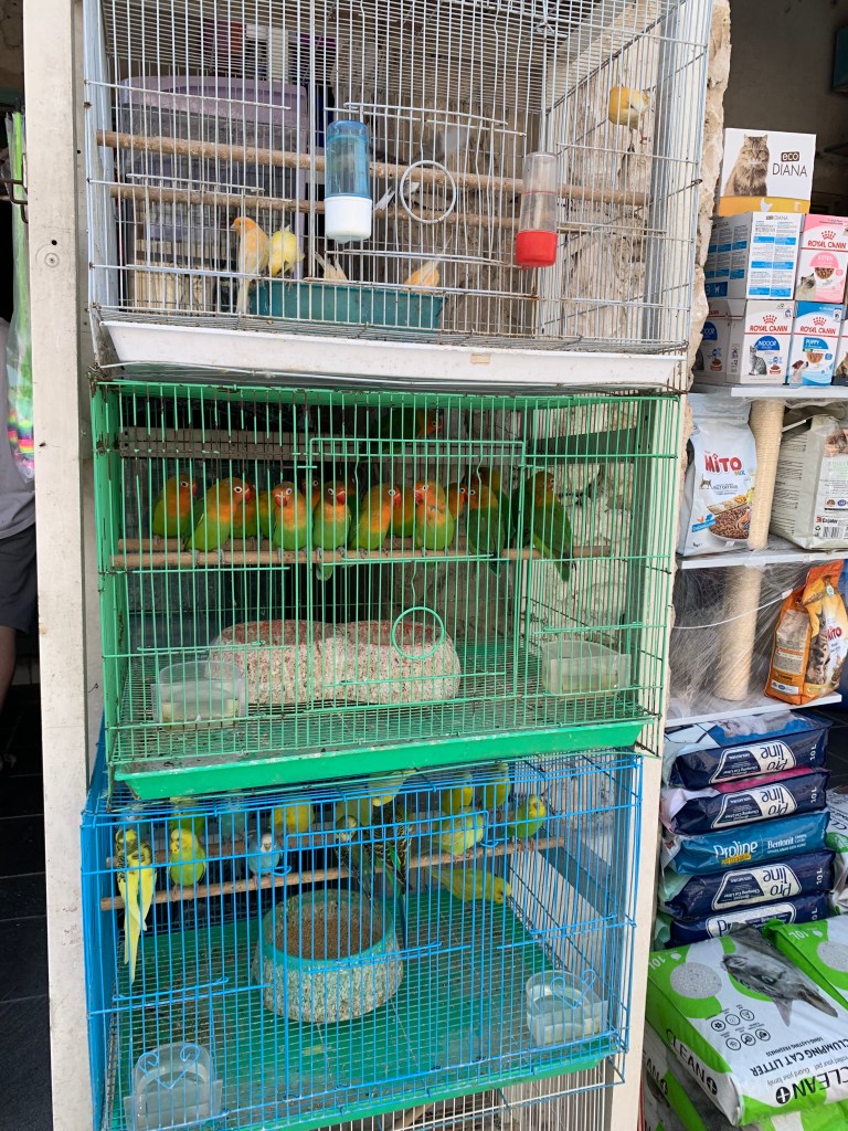 Normalerweise findet sich auf dem Souk Waqif auch noch der Falcon Souk – ein Markt für alles rund um den Falken, den Nationalvogel Katars – auf dem man sowohl Zubehör als auch die Vögel selbst erwerben kann. Aber entweder wir haben diesen Teil des Souks nicht gefunden oder er war -aufgrund des Ramadans- noch nicht geöffnet. Statt Falken wurden allerdings jede Menge andere Tiere angeboten. Zahllose Vögel, kleine Katzen und Hunde, Geckos und Schildkröten, Kaninchen… alle in winzigen Käfigen. 😦